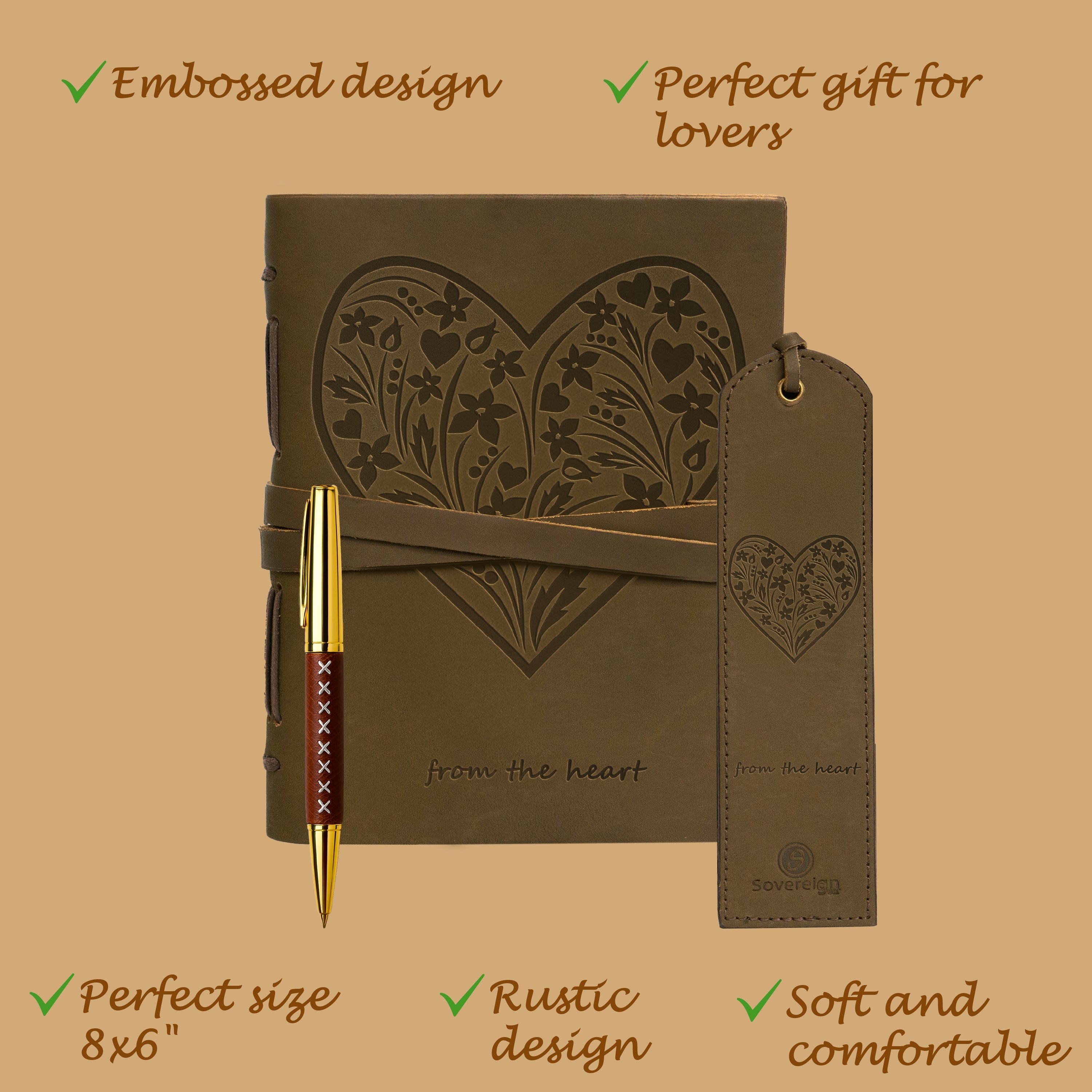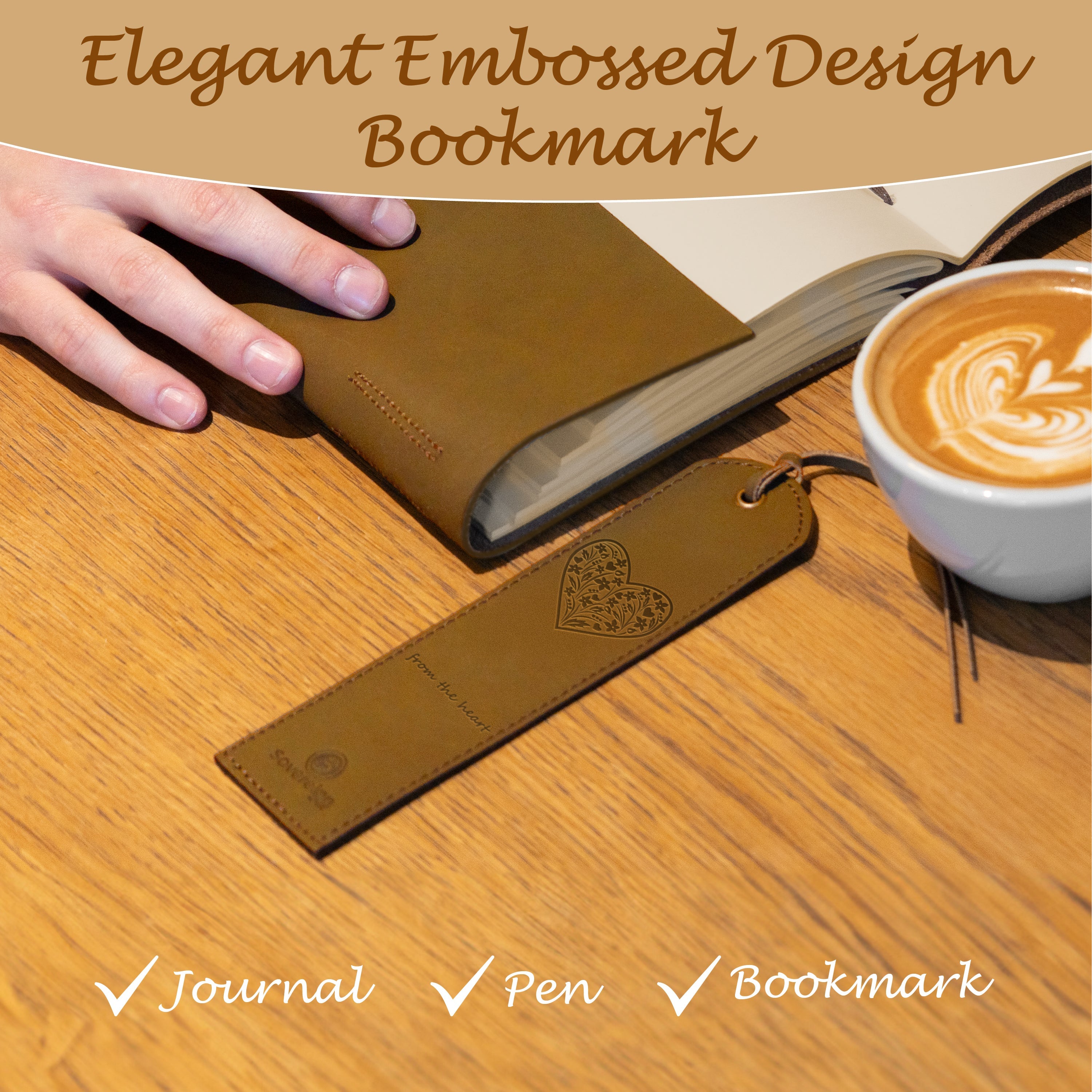 - HAND MADE REAL LEATHER HEART JOURNAL - travel journal with flowers and hearts embossed on the front soft cover. Our cool brown leather bound notebook includes a free stylish gold pen, holder and stitched jute bookmark. A long leather strap ties around the journal notebook to close securely