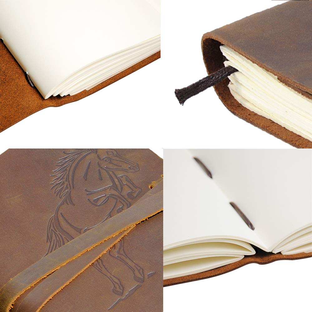- QUALITY THICK CREAM PAPER 300 pages of plain un lined blank paper sheets (counting both sides) - plenty to jot down a note, memories, daily plans, scribble a rough sketch or ideas for your poetry, novel or bullet journal. This timeless leather book journal is not refillable. No bleed through with fountain pens so any pen type can be used in this retro real leather notebook. Matching bookmark NOT included but sold online