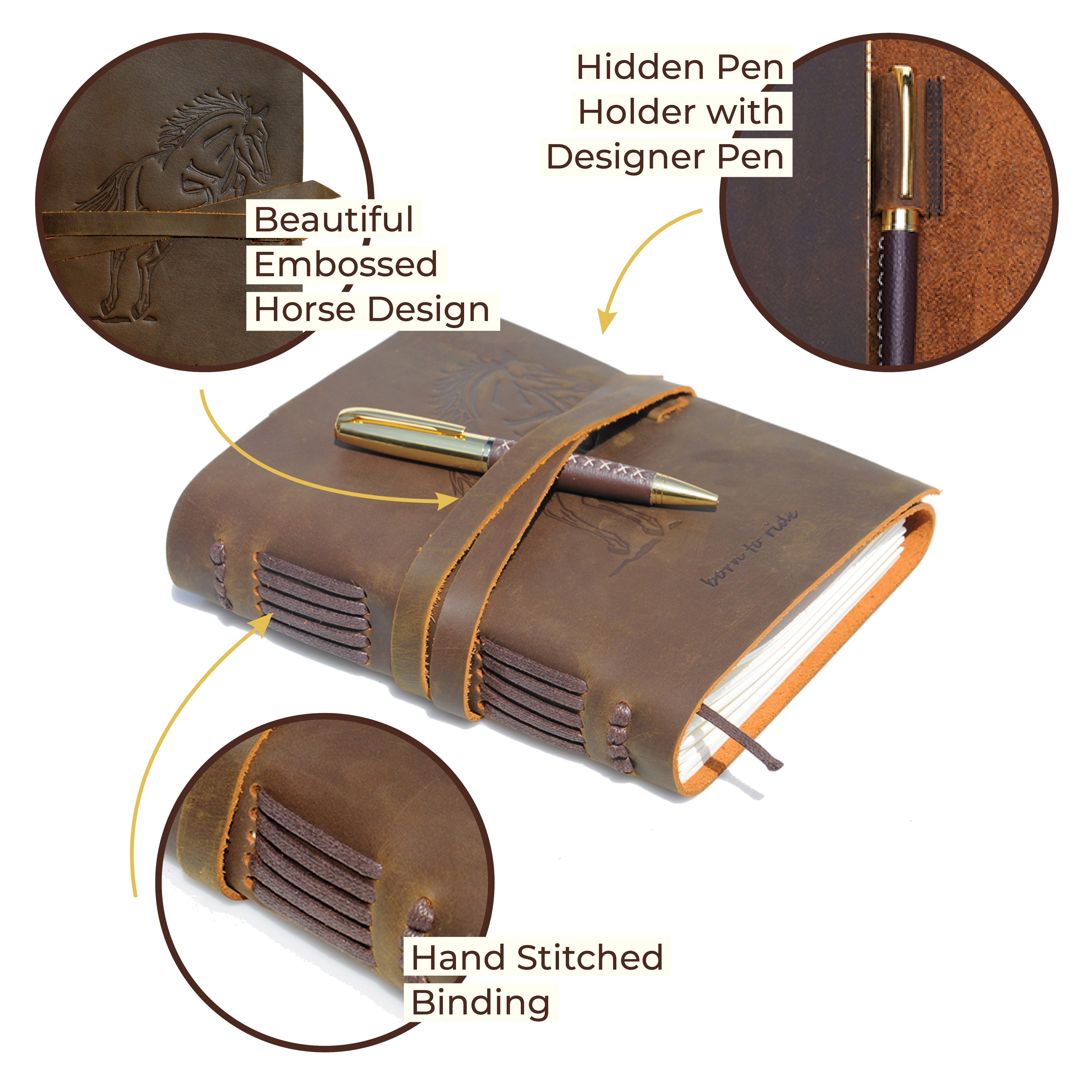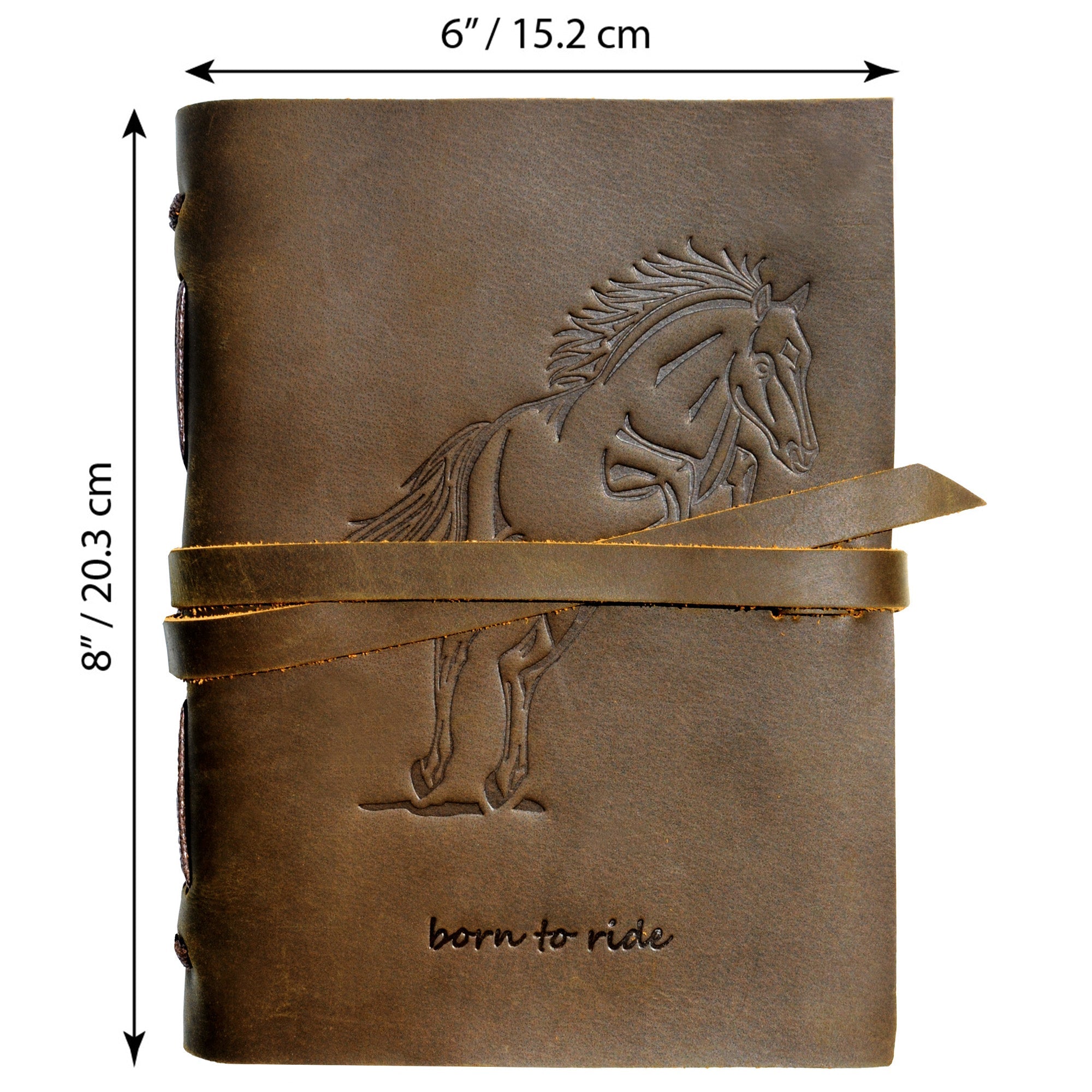 - HAND MADE REAL LEATHER HORSE JOURNAL - A5 travel journal with a jumping horse embossed front soft cover with hidden pen holder. Our leather bound equestrian themed notebook includes a free stylish gold pen - always handy to start writing in these lovely cool dark brown journals. A useful jute bookmark keeps your place for the next time you open it. Long leather strap wraps around the journal notebook to secure firmly when not in use