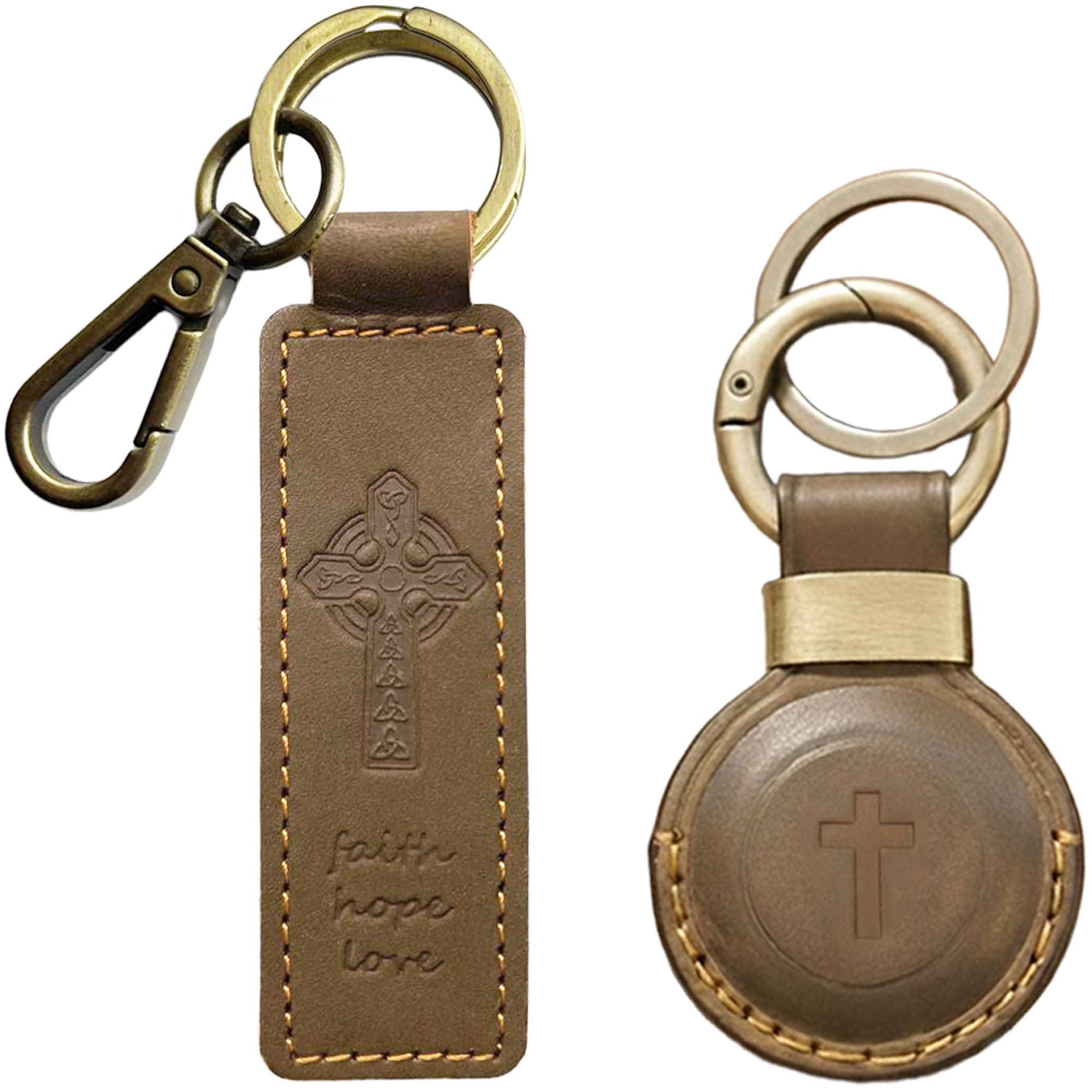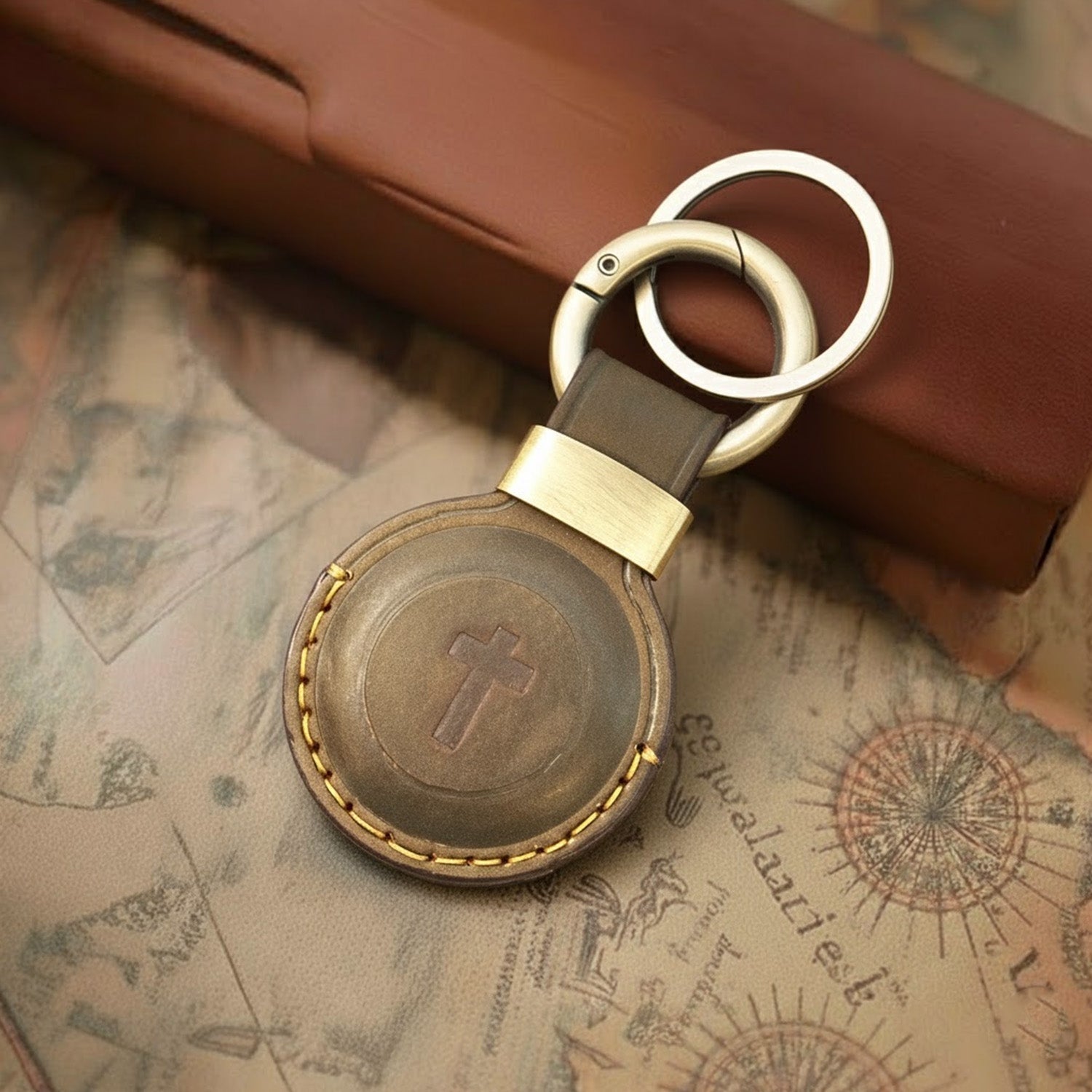 Both the keyring and AirTag holder include a strong metal spring clip, two antique-gold rings, and a carabiner hook, offering versatile attachment options for keys, bags, or travel gear. The AirTag case is precisely shaped to hold your tracker securely while maintaining full signal and sound performance. The leather provides reliable protection without adding unnecessary bulk, ensuring your AirTag stays safe and stylish. Whether used for travel, work, or everyday organization, this set blends spiritual meaning with practical functionality.