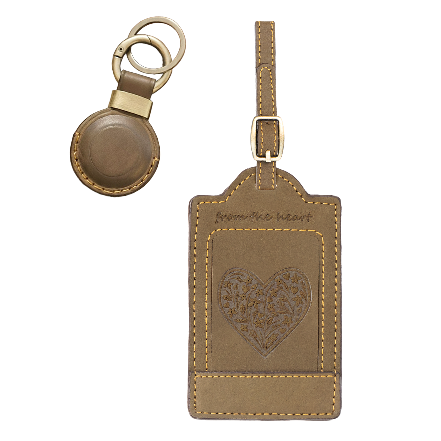 This handcrafted full-grain leather luggage tag and AirTag holder set features a beautifully embossed heart design, adding a romantic and meaningful touch to your travel essentials. Crafted from rich brown leather, each tag offers durability and sentimental charm, making it a thoughtful gift or personal keepsake.