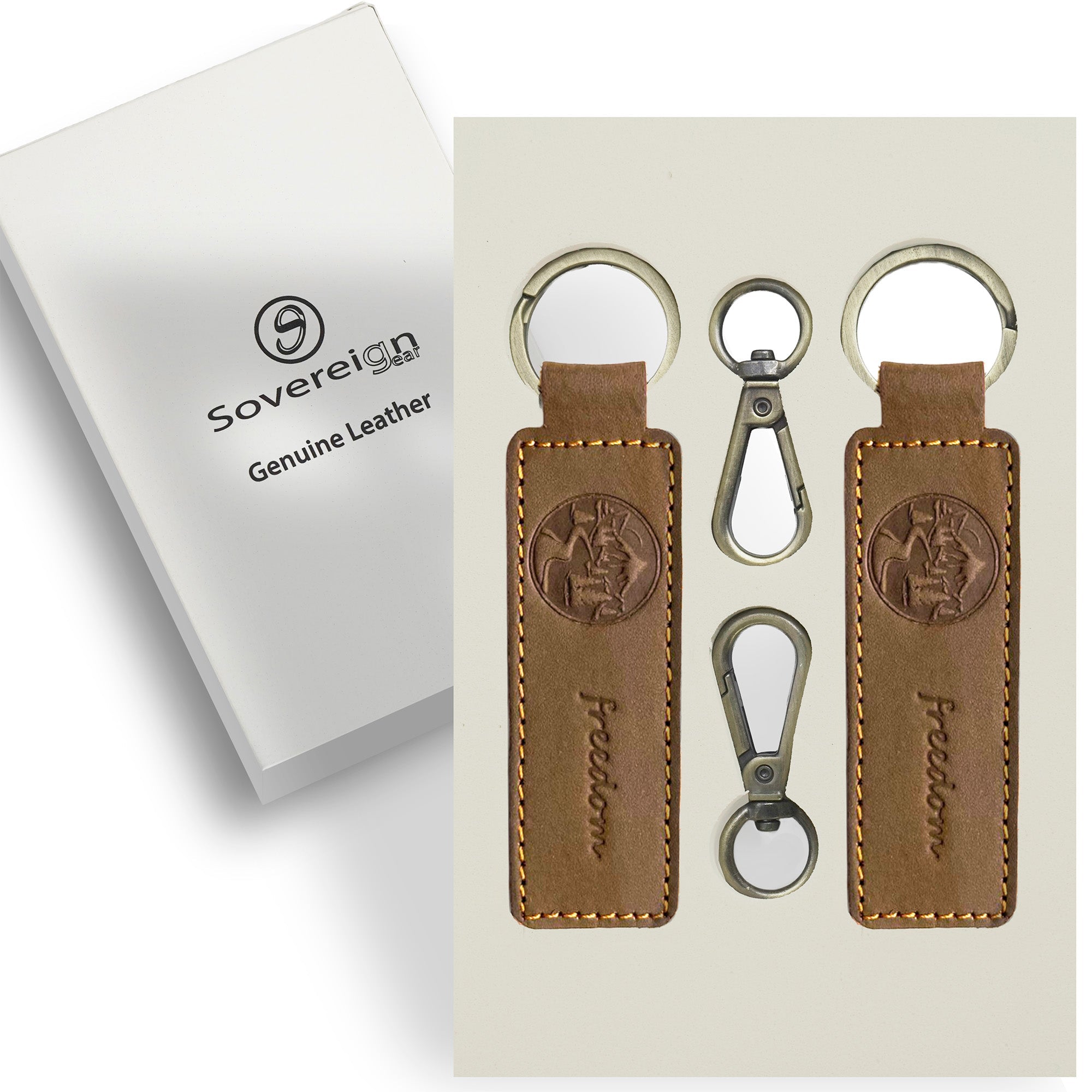 - PREMIUM GENUINE LEATHER KEYRING SET Crafted from high-quality real leather, this duo of Sovereign-Gear leather keyrings delivers timeless style and exceptional durability. The soft yet robust finish gives each leather key fob a refined look, perfect for everyday use or as a thoughtful gift. A classic addition to your keyring leather collection.