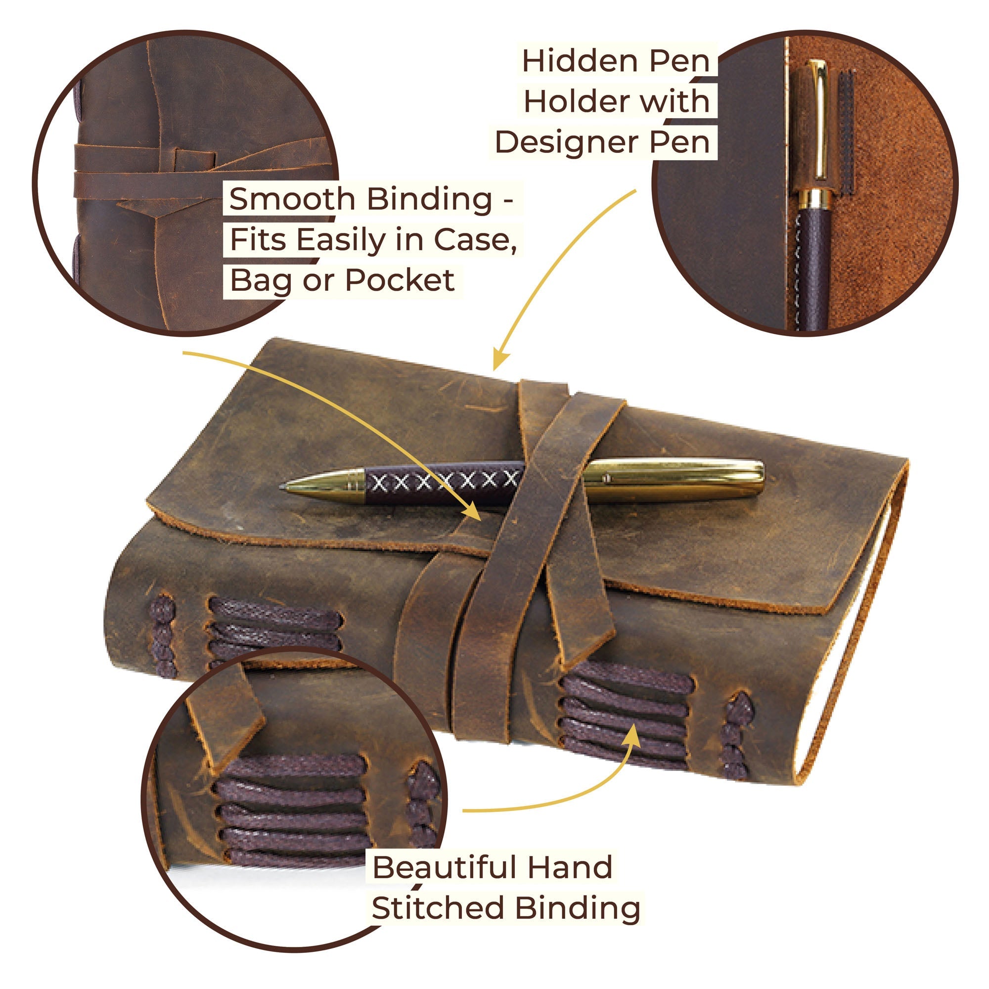 - RUSTIC DESIGN - front asymmetric shape + decorative stitching on spine adds charm to this keepsake for men, women, students, journalists, writers or travellers. Long leather strap secures the notebook firmly and rustic bookmark keeps your place