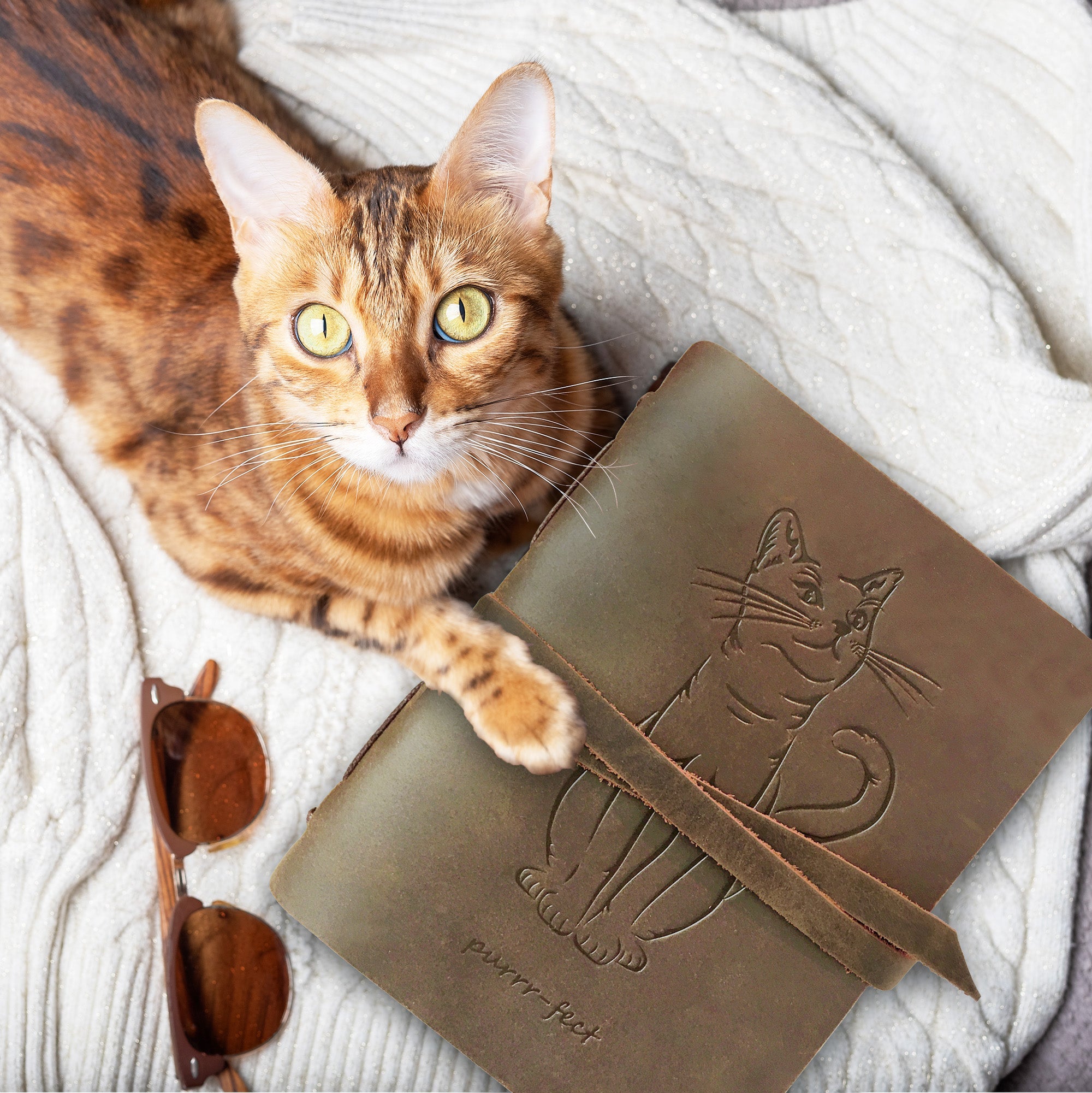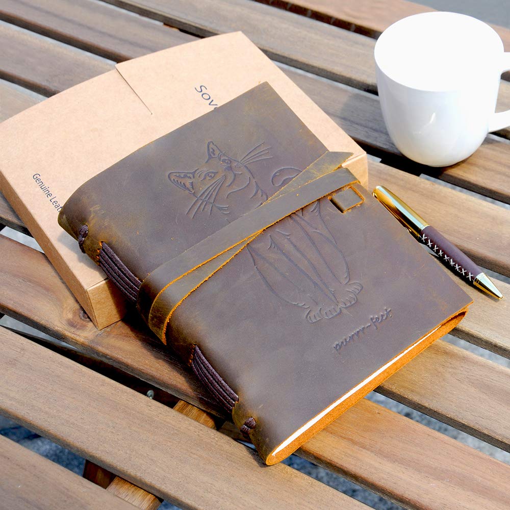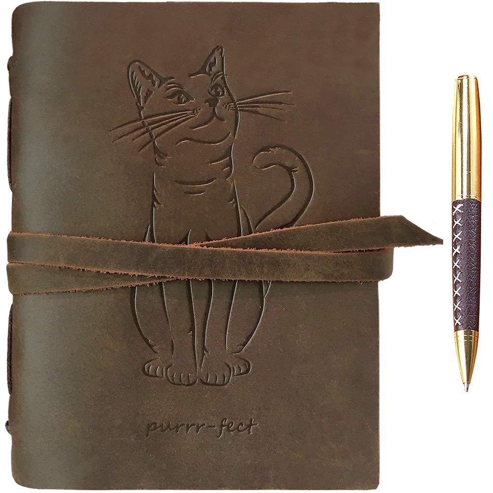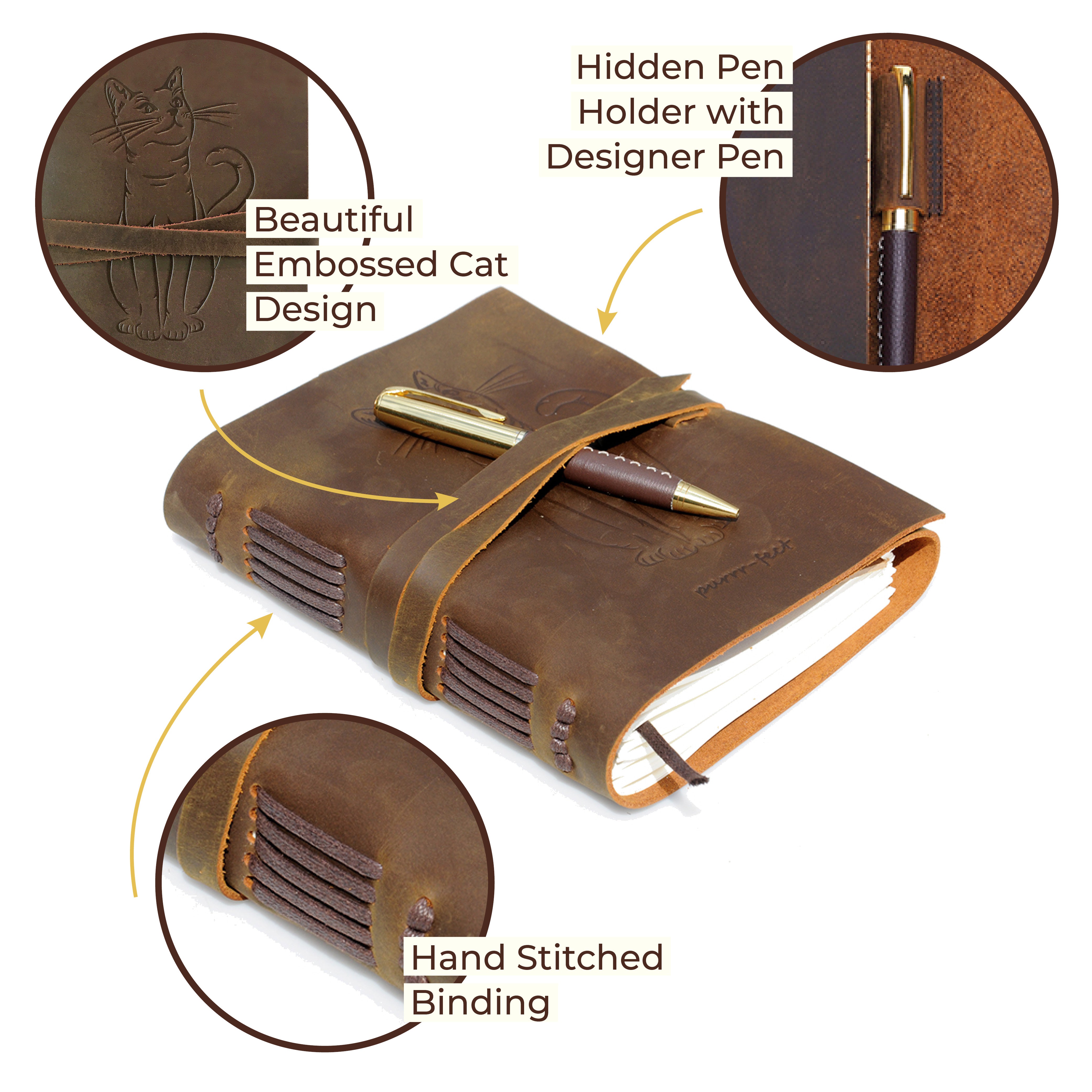 - HAND MADE REAL LEATHER CAT JOURNAL - A5 travel journal with a cute and cuddly Cat embossed front soft cover with hidden pen holder. Our leather bound notebook includes a free stylish gold pen - always handy to start writing in these lovely cool dark brown journals. A useful jute bookmark keeps your place for the next time you open it. Long leather strap wraps around the journal notebook to secure firmly when not in use