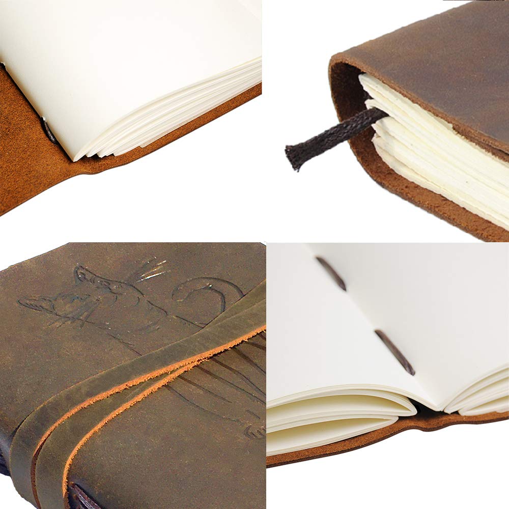- QUALITY THICK CREAM PAPER 300 pages of plain un lined blank paper sheets (counting both sides) - plenty to jot down a note, memories, daily plans, scribble a rough sketch or ideas for your poetry, novel or bullet journal. This timeless leather book journal is not refillable. No bleed through with fountain pens so any pen type can be used in this retro real leather notebook. Matching bookmark NOT included but sold online