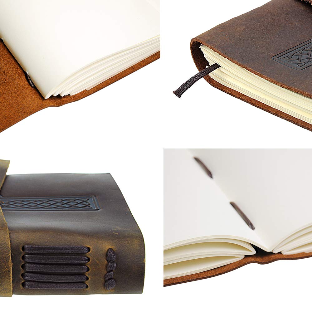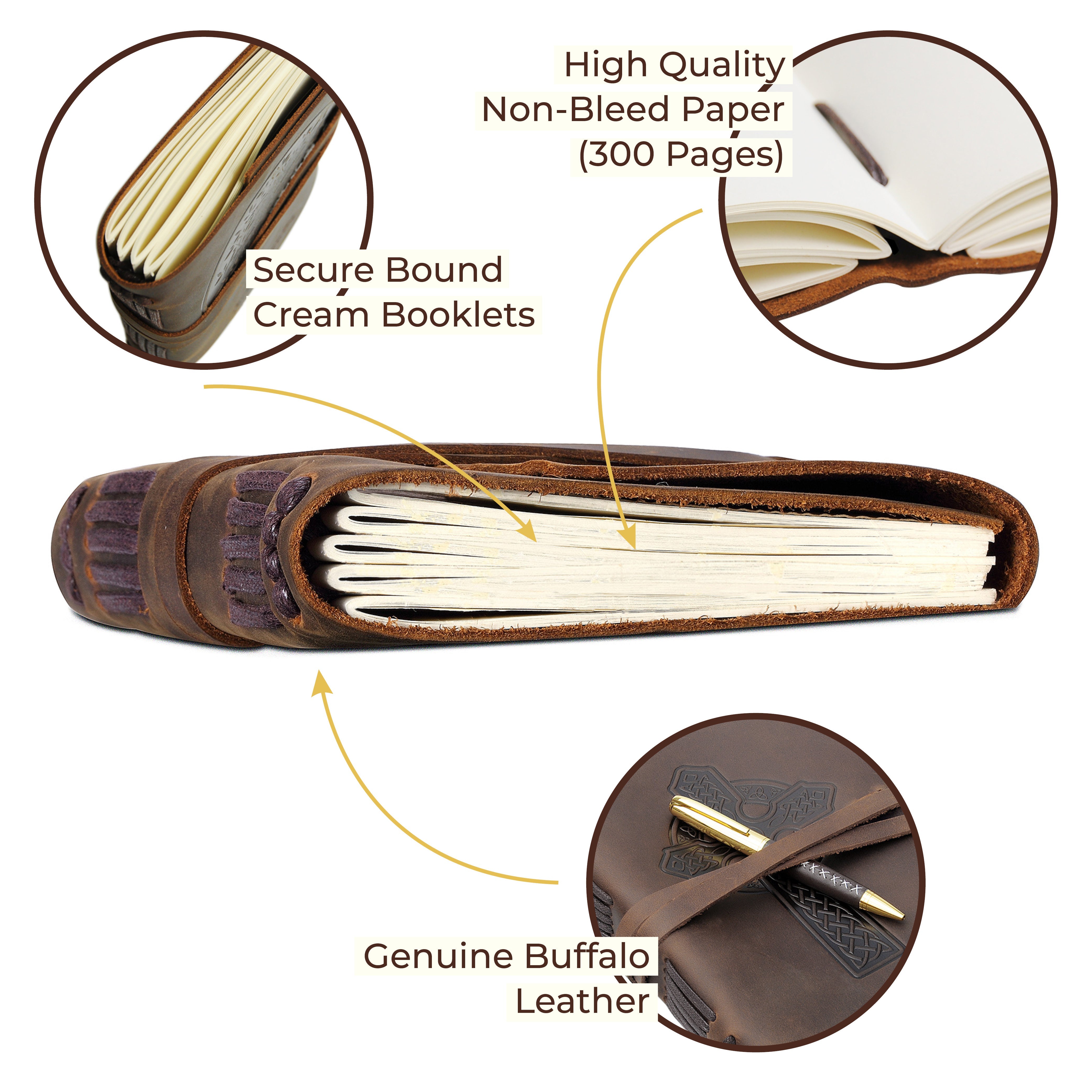 - QUALITY THICK CREAM PAPER 300 pages of plain un lined blank paper sheets (counting both sides) - plenty to jot down a note, memories, daily plans, scribble a rough sketch or ideas for your poetry, novel or bullet journal. This timeless leather book of life journal is not refillable. No bleed through with fountain pens so any pen type can be used in this retro real leather notebook. Matching bookmark NOT included but sold online