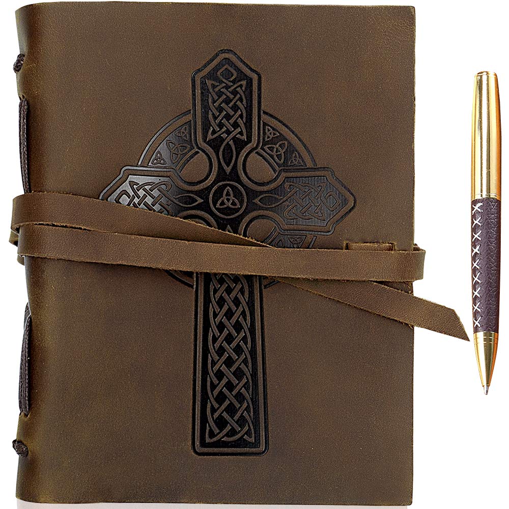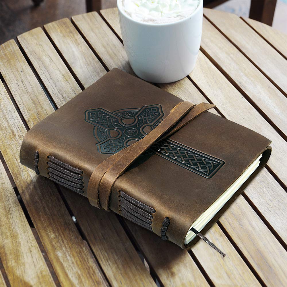 - HAND MADE REAL LEATHER CROSS JOURNAL - A5 travel journal with a Cross embossed front cover made from crazy horse leather, soft-feeling, delicate yet super tough with a wonderful old leather smell. Distressed looking and coated with special oils so marks fade when rubbed. Decorative stitching on spine adds charm to this delightful keepsake