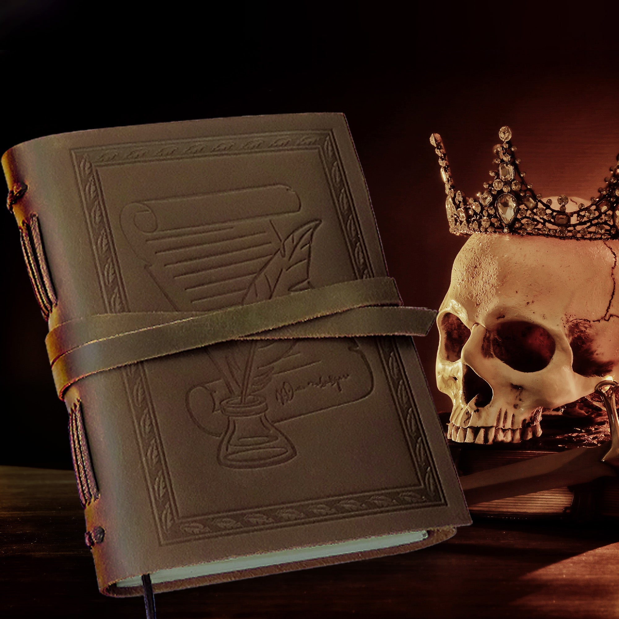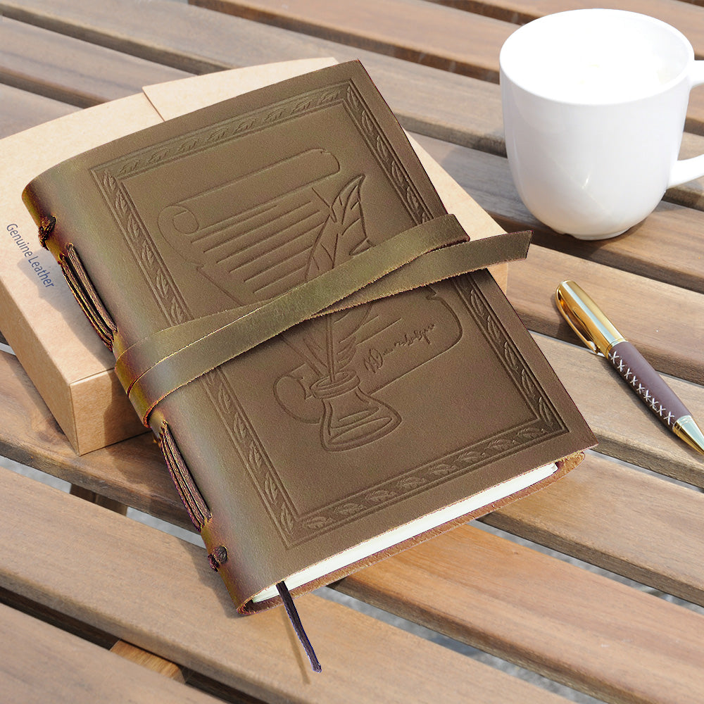 This A5 leather journal features a beautifully embossed feather quill and ink pot design, evoking the charm of old-world writing and the spirit of Shakespearean creativity. Crafted from premium buffalo leather, it offers a soft yet incredibly durable feel, developing a unique distressed patina over time that reflects your personal journeys. The long leather strap keeps the journal securely closed, while the parchment-style aesthetic makes it an inspiring companion for writers, poets, students, and travellers.