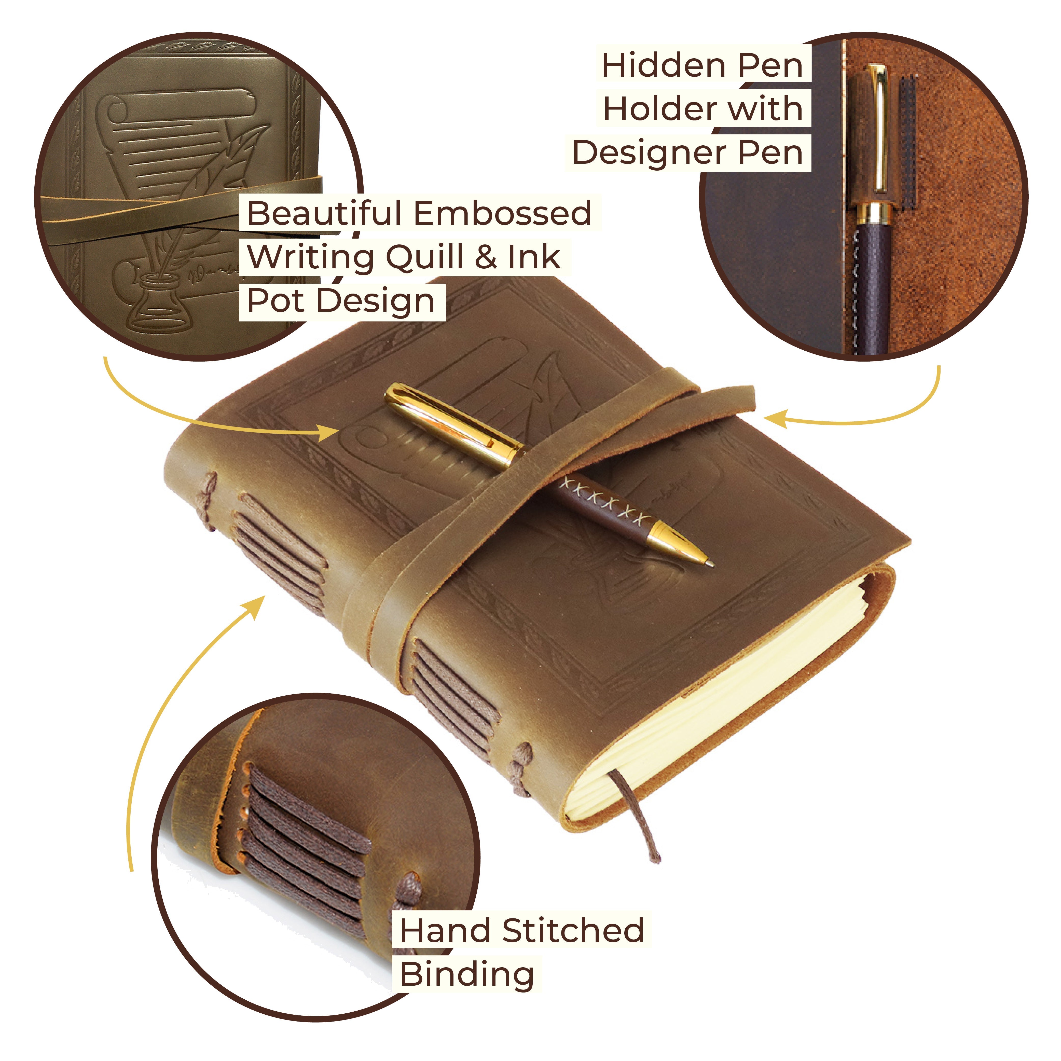 • RUSTIC DESIGN: Achieves a unique and distressed look when scratched and features decorative stitching for added charm. Coated with special natural oils that make handling a joy. Plus, it has a wonderful authentic leather smell that inspires you to write daily.