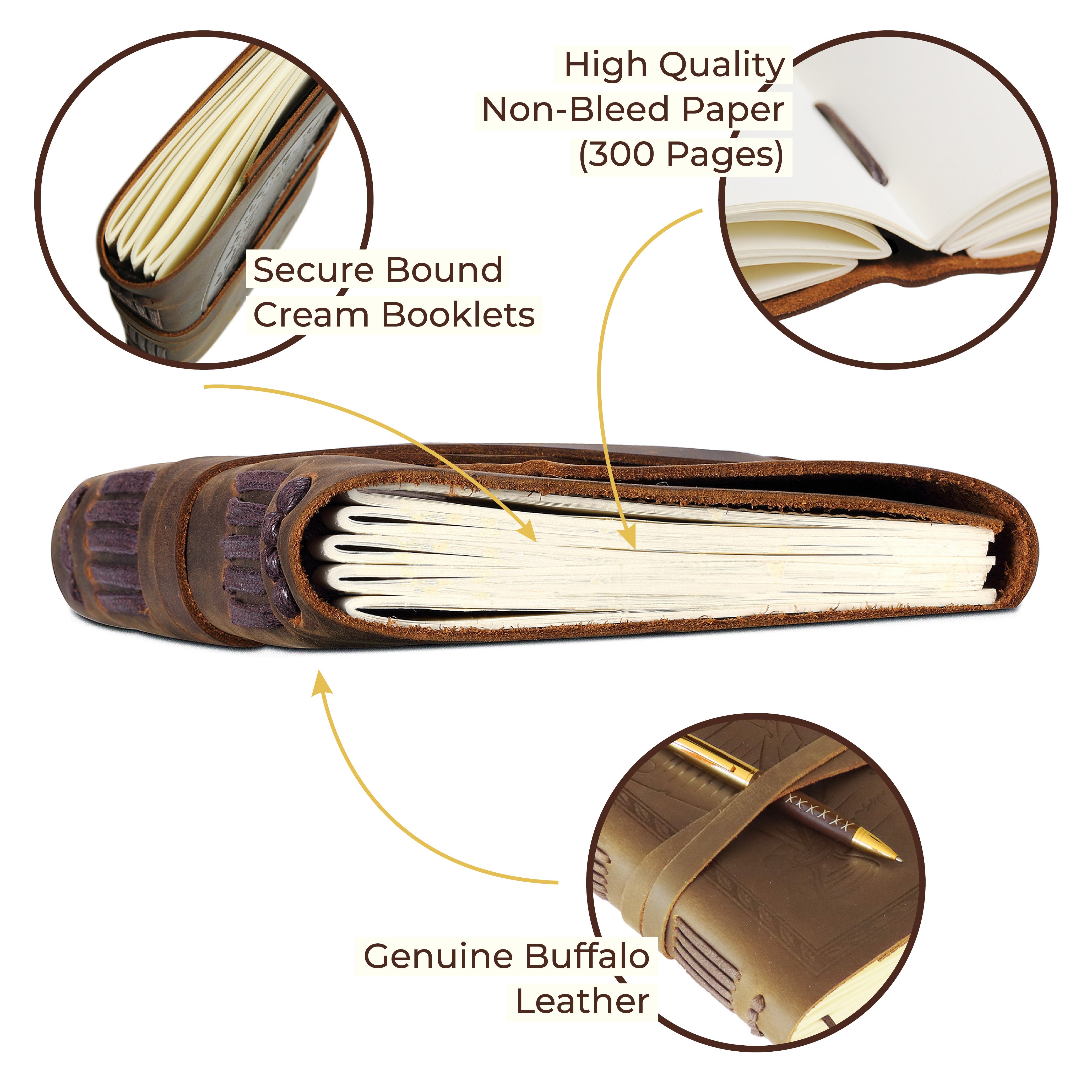 Hand-cut edges, decorative stitching, and naturally oiled leather highlight the craftsmanship behind every piece, giving the journal a rustic, vintage character that feels both timeless and personal. Inside, 300 thick cream pages provide ample space for notes, sketches, reflections, and daily plans, with zero bleed-through even when using fountain pens. The unlined format encourages creativity in all forms.
