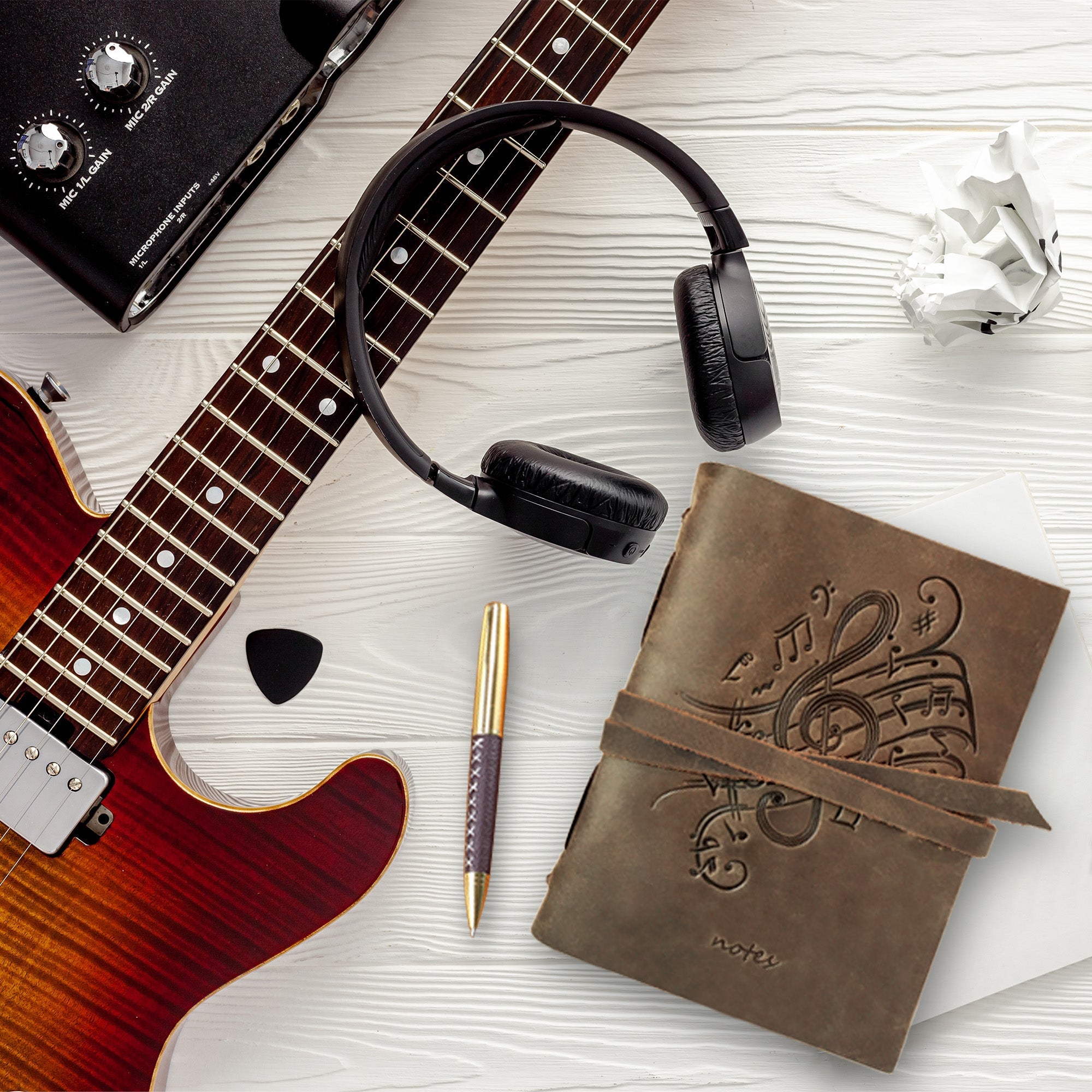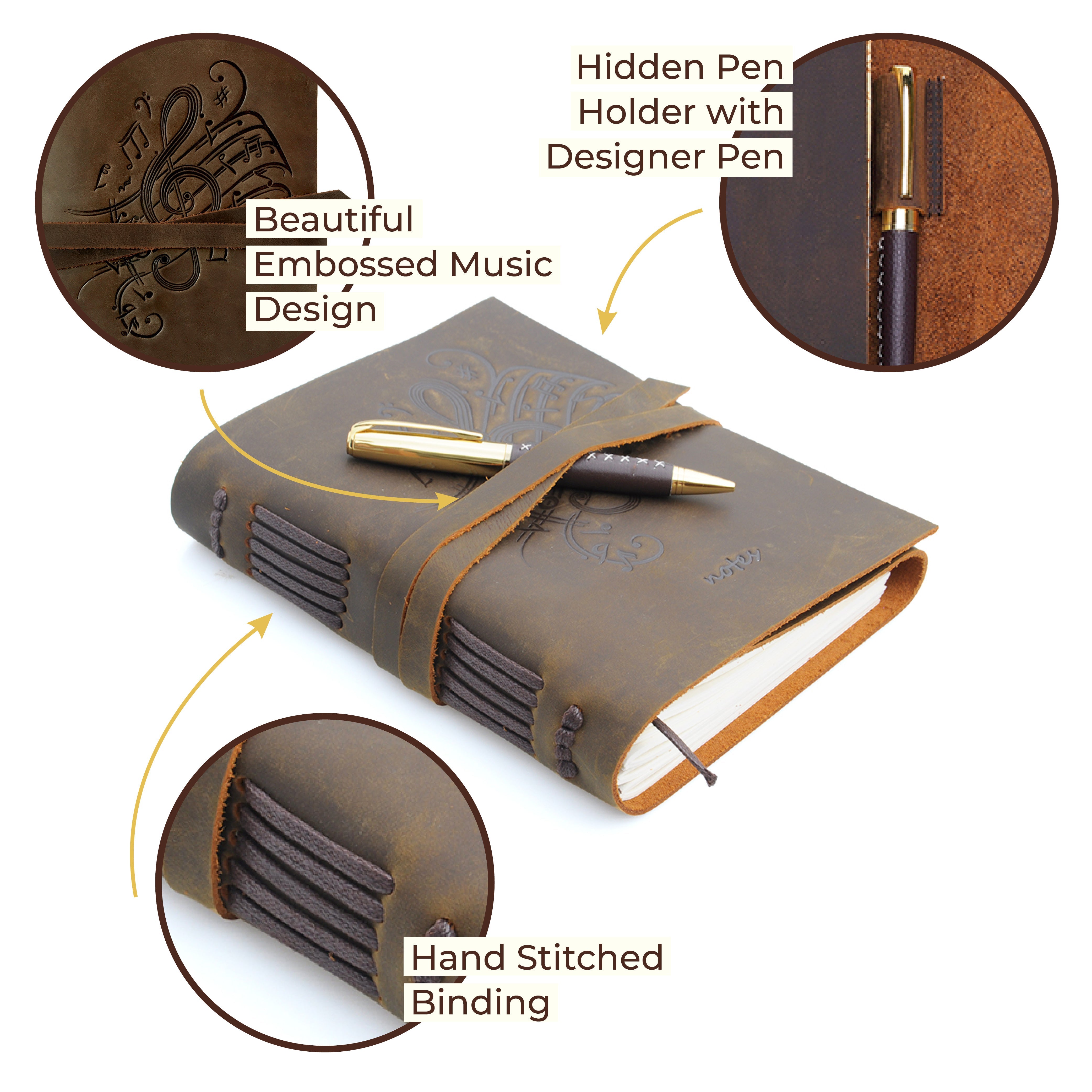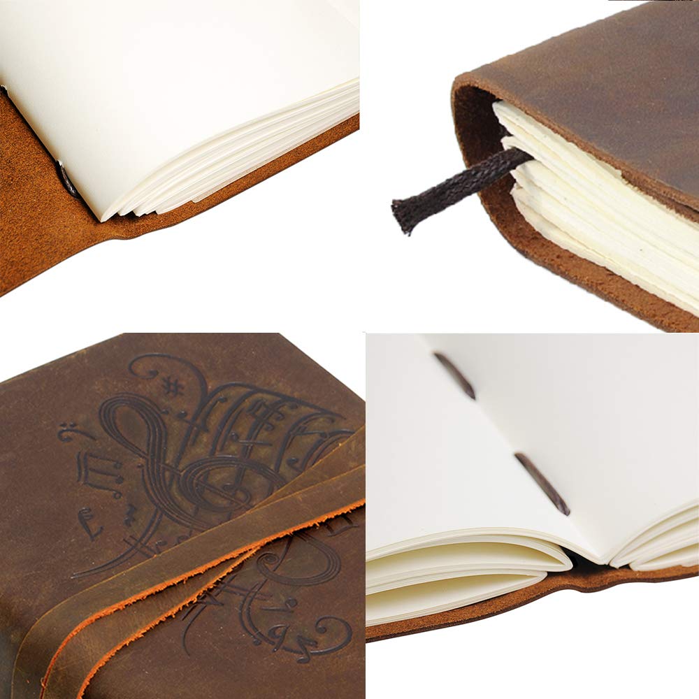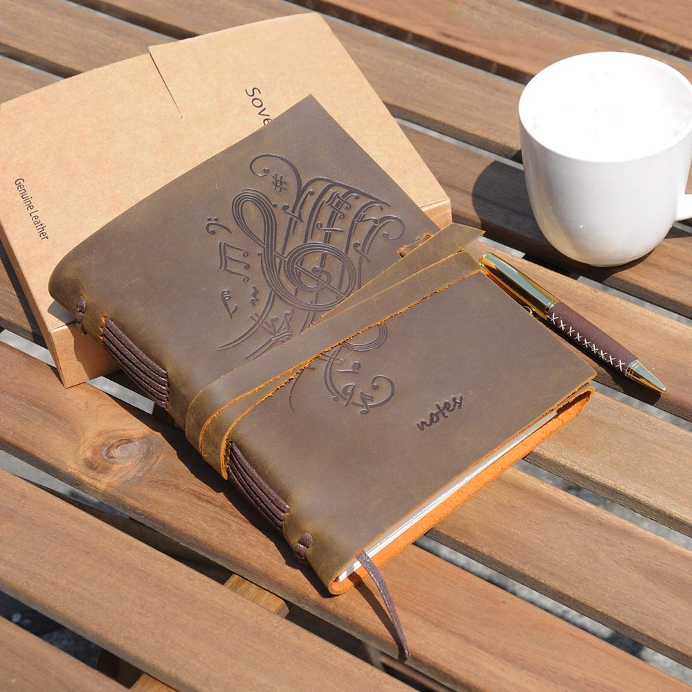 - HAND MADE REAL LEATHER MUSIC JOURNAL - A5 travel journal with beautiful music notes embossed front soft cover with hidden pen holder. Our leather bound musical themed notebook includes a free stylish gold pen - always handy to start writing in these lovely cool dark brown journals. A useful jute bookmark keeps your place for the next time you open it. Long leather strap wraps around the journal notebook to secure firmly when not in use