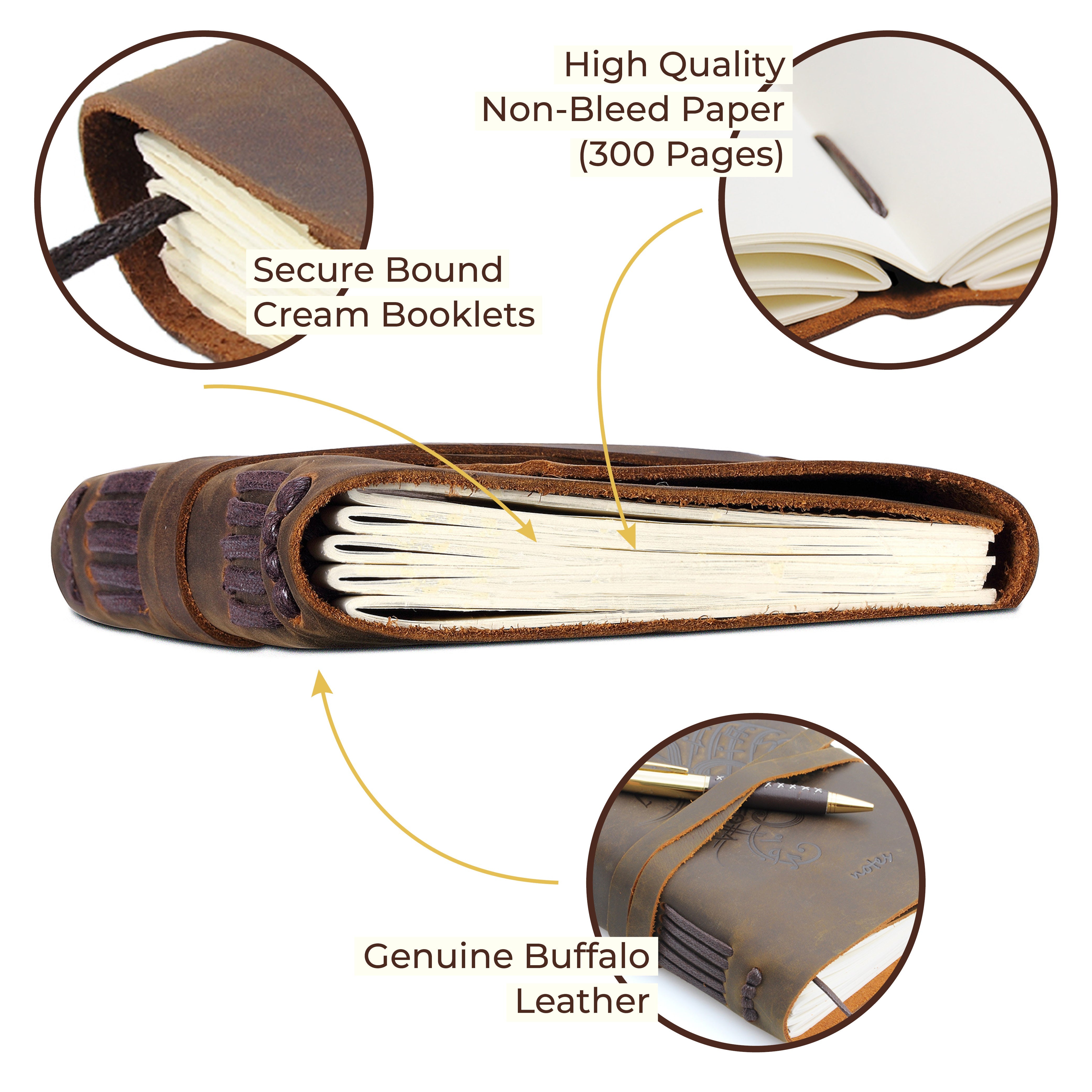 - QUALITY THICK CREAM PAPER 300 pages of plain un lined blank paper sheets (counting both sides) - plenty to jot down ideas for songs, notes, memories, daily plans, scribble a rough sketch or ideas for your poetry, novel or bullet journal. This timeless leather book journal is not refillable. No bleed through with fountain pens so any pen type can be used in this retro real leather notebook. Matching bookmark NOT included but sold online - search for leather bookmarks
