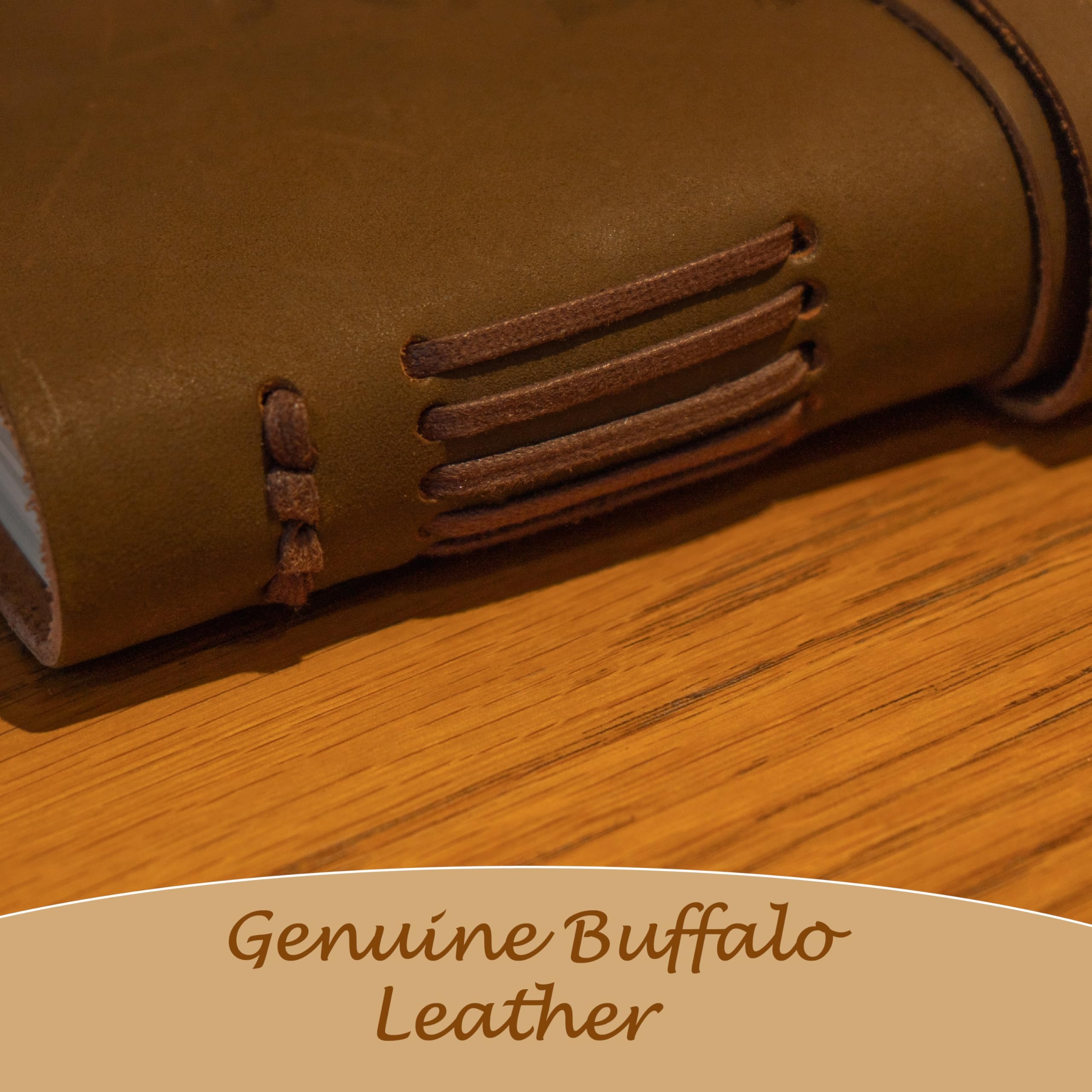 • DURABLE SOFT CRAZY HORSE LEATHER journal & bookmark made from premium buffalo leather with a wonderful leather smell - soft-feeling and delicate yet super tough. Coated with special oils this leather when scratched, becomes marked making it look uniquely antique and distressed - rub it and the patterns fade