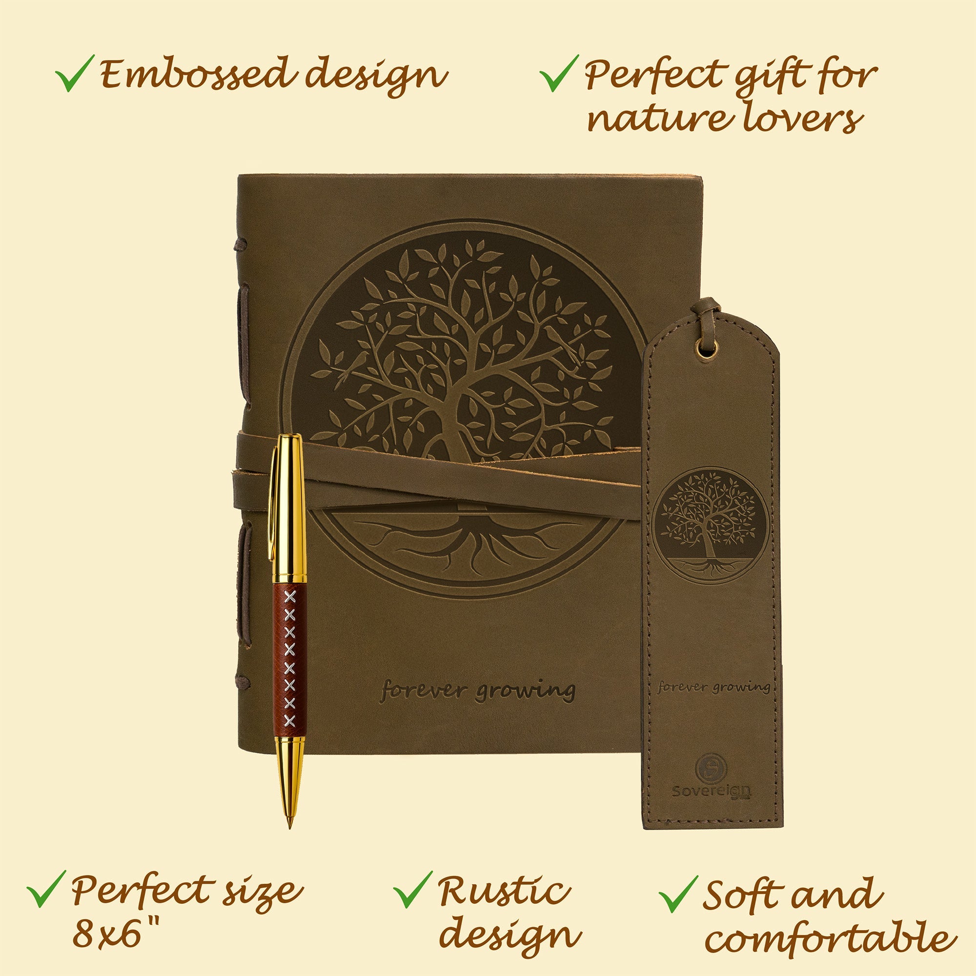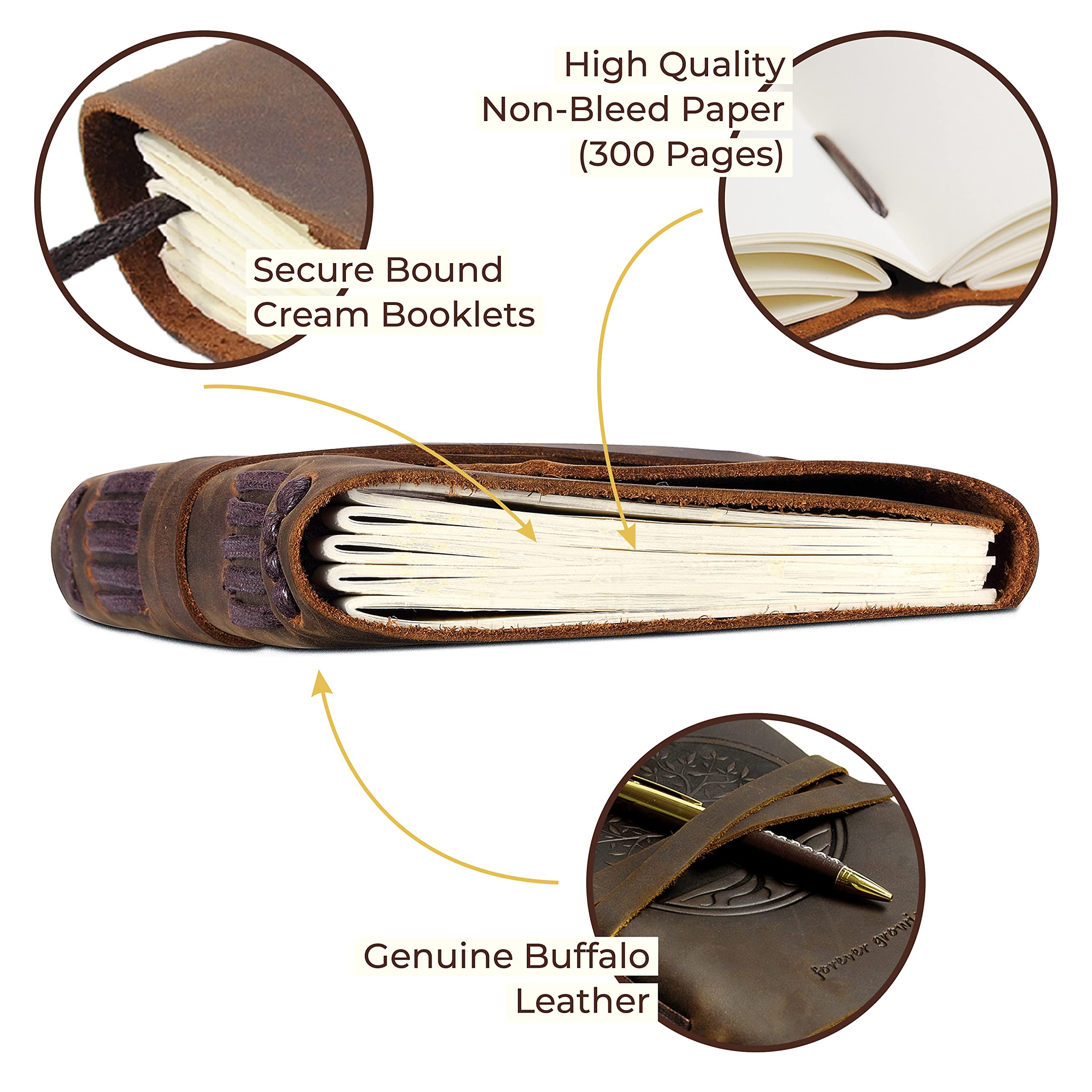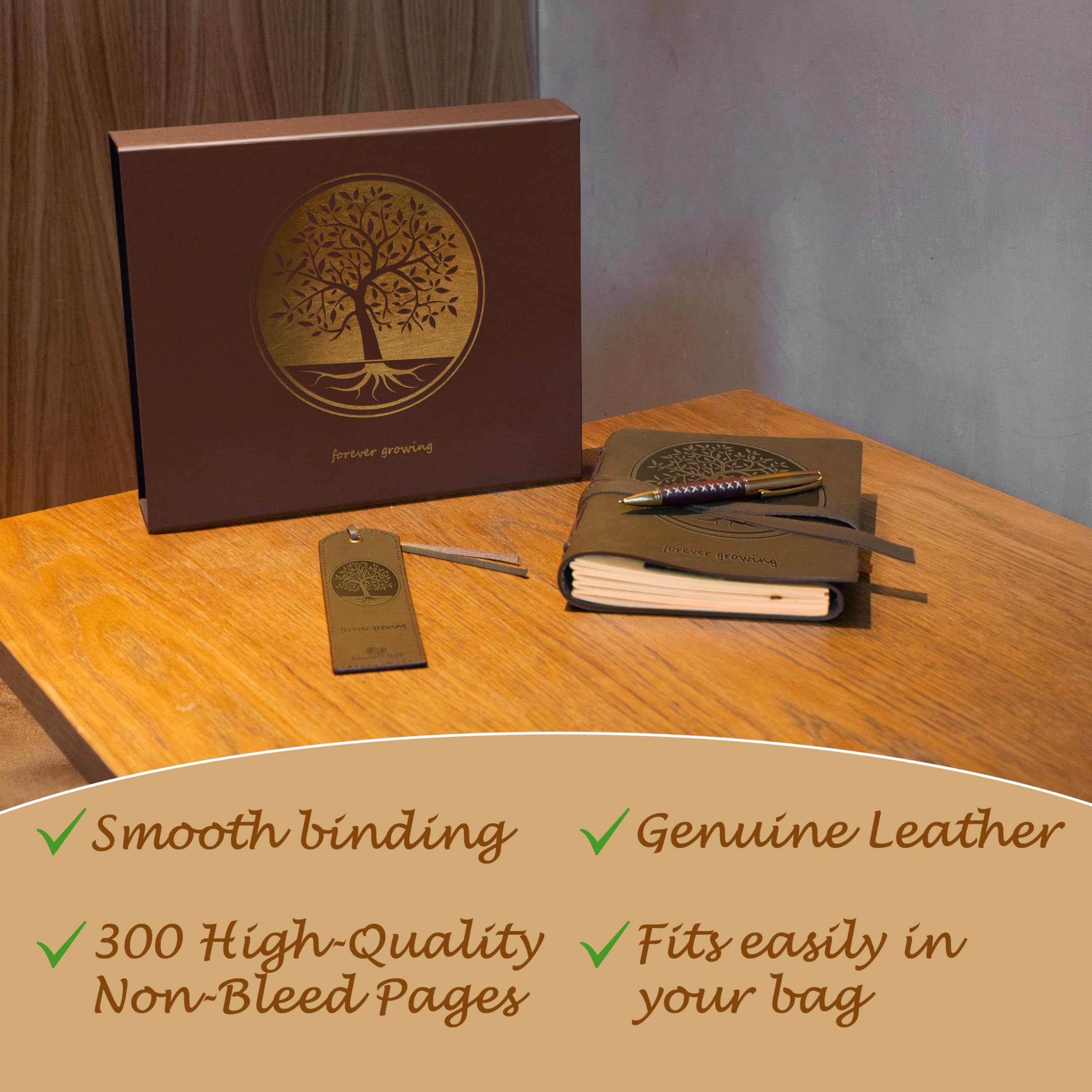 • UNIQUE GIFT SET with handmade leather journal, leather bookmark, hidden pen holder & stylish pen - all in this finely crafted presentation box making it the perfect present. The A5 travel journal has stylishly embossed Tree of Life front cover design. The leather bound notebook includes a free stylish gold pen, holder and stitched jute bookmark. A long leather strap ties around the journal notebook to close securely