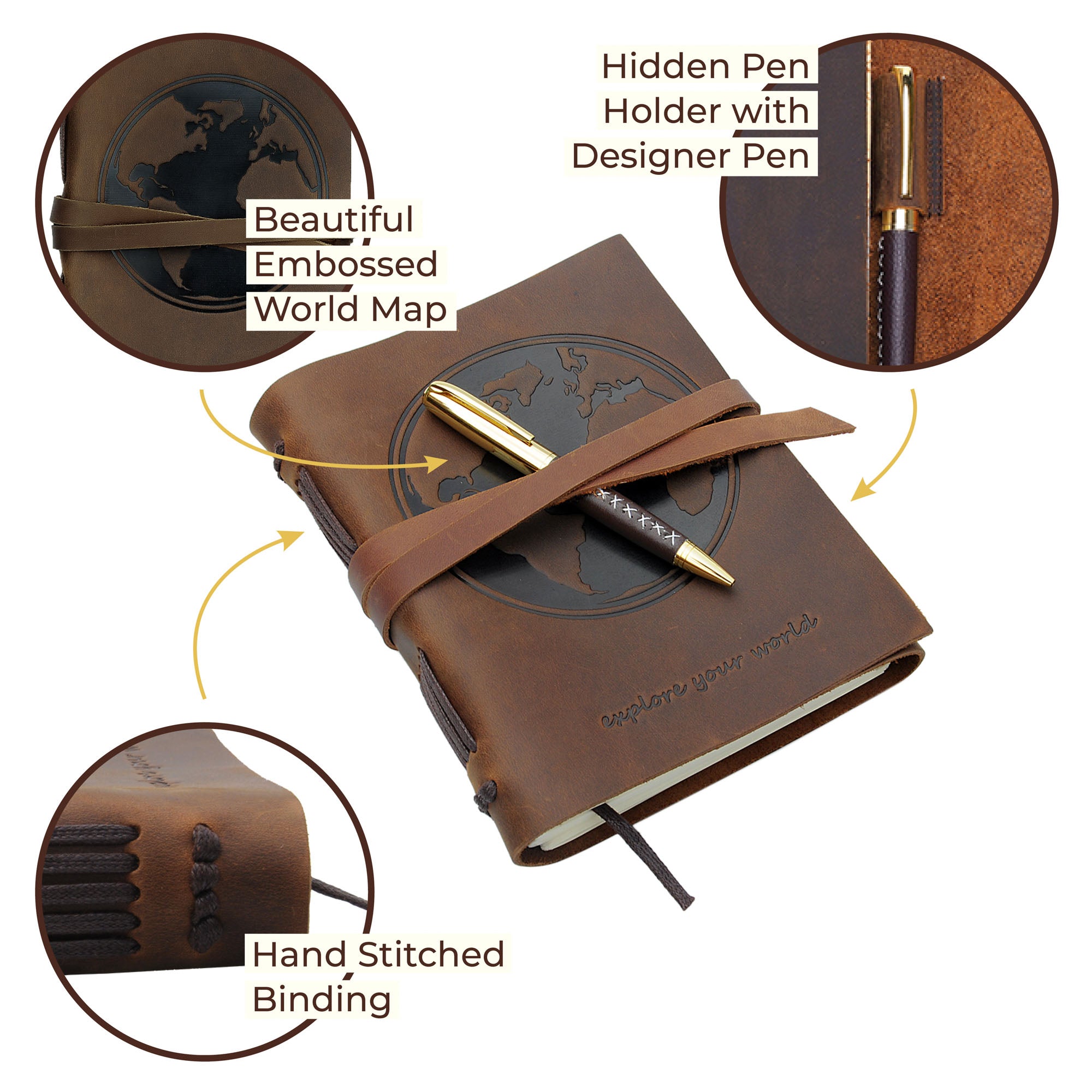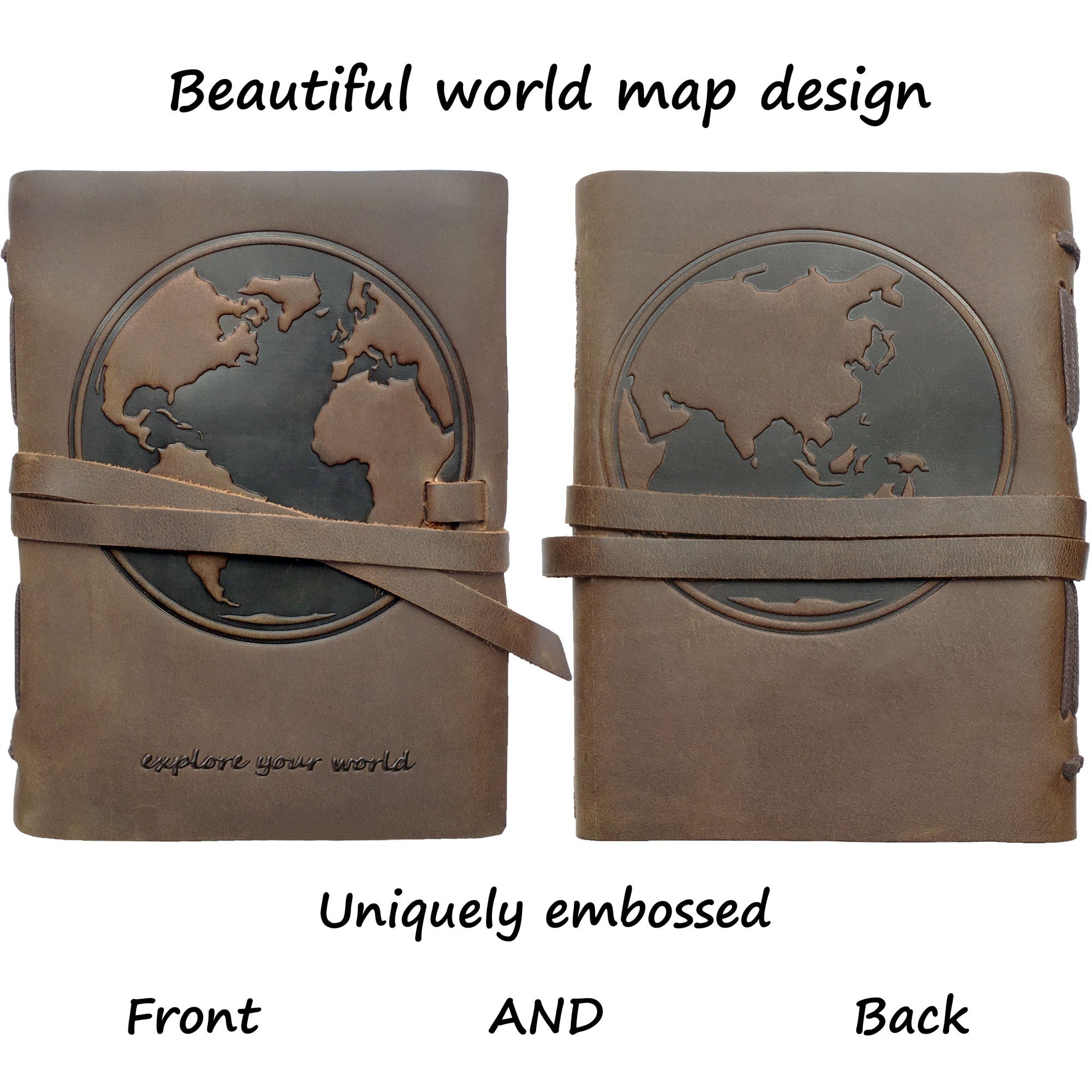 • HAND MADE REAL LEATHER WORLD MAP JOURNAL - A5 travel journal with a World Map embossed front and back cover made from crazy horse leather, soft-feeling, delicate yet super tough with a wonderful old leather smell. Distressed looking and coated with special oils so marks fade when rubbed. Decorative stitching on spine adds charm to this delightful keepsake