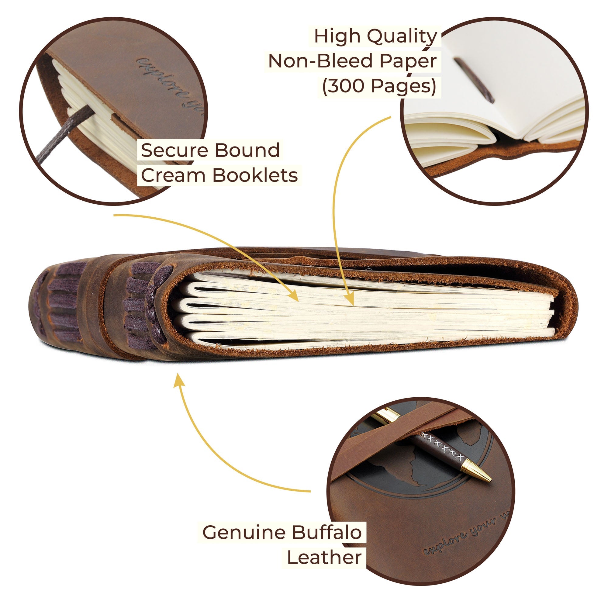 • QUALITY THICK CREAM PAPER 300 pages of plain un lined blank paper sheets (counting both sides) - plenty to jot down a note, memories, daily plans, scribble a rough sketch or ideas for your poetry, novel or bullet journal. This timeless leather book of life journal is not refillable. Matching map bookmark NOT included but available online - search for Sovereign-Gear. No bleed through with fountain pens so any pen type can be used in this retro real leather notebook