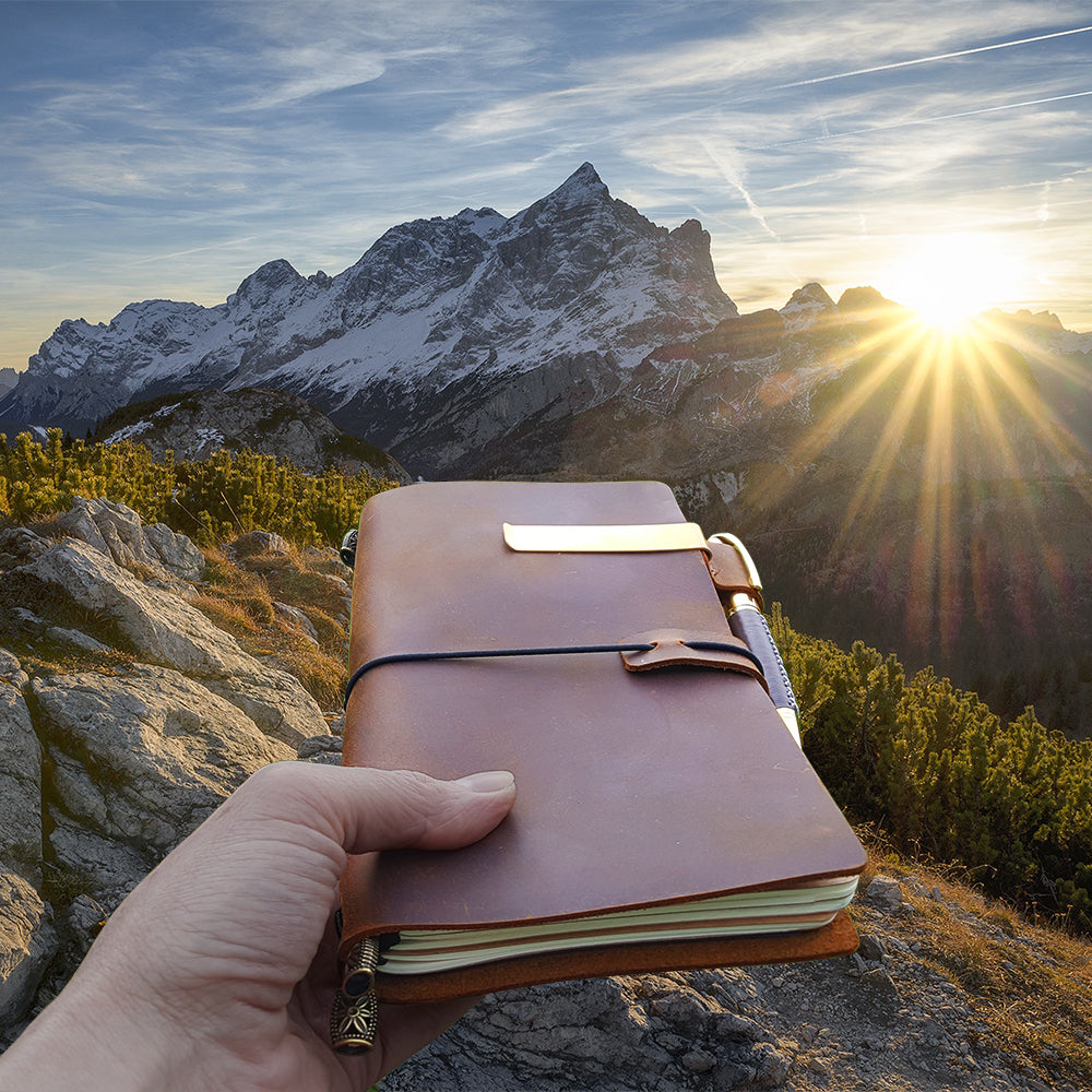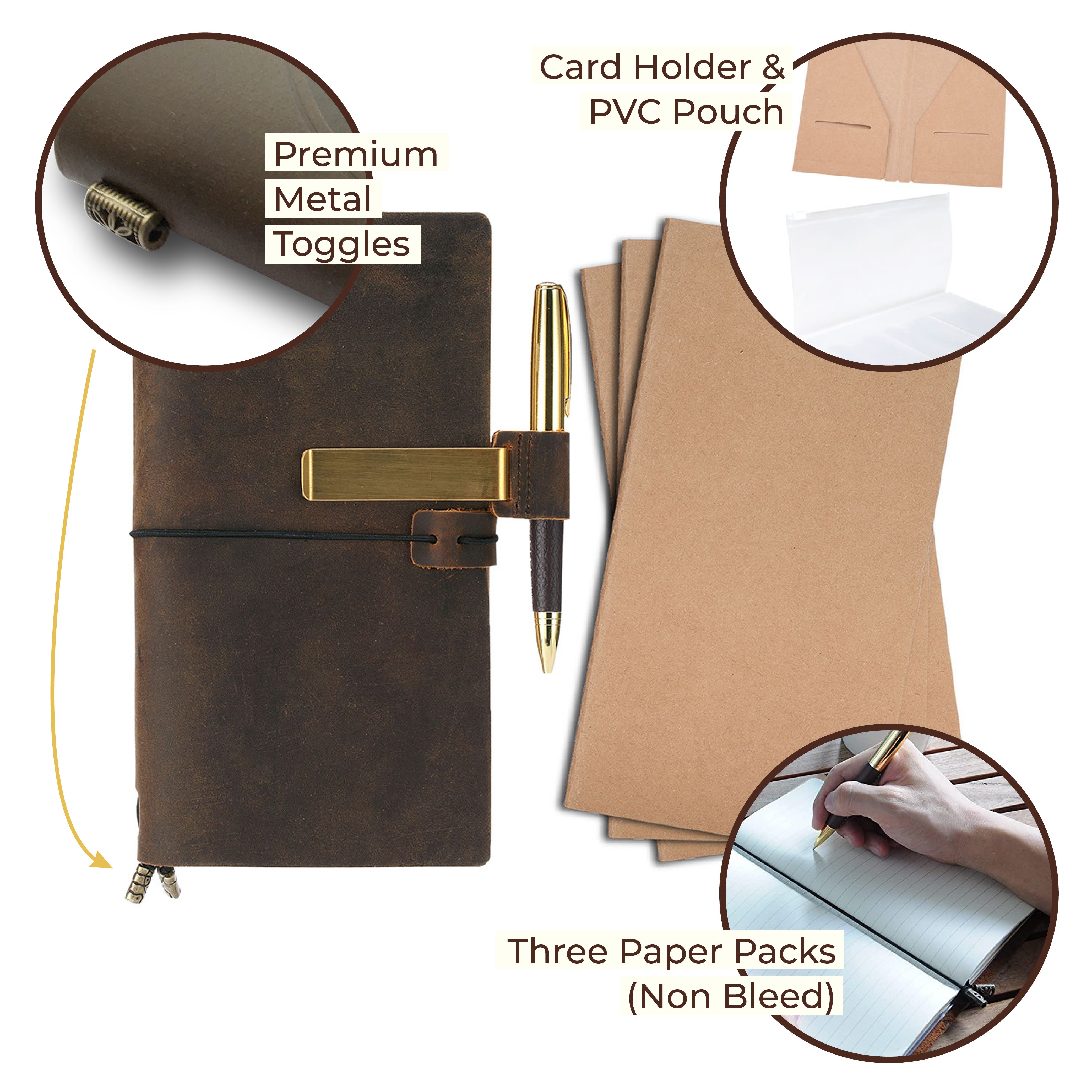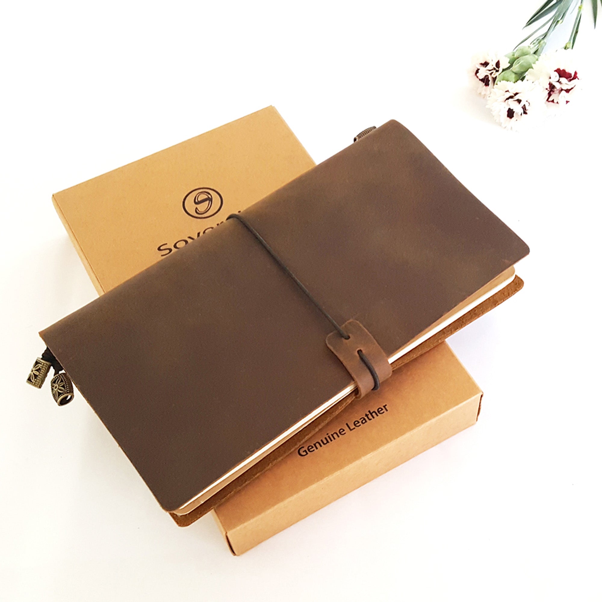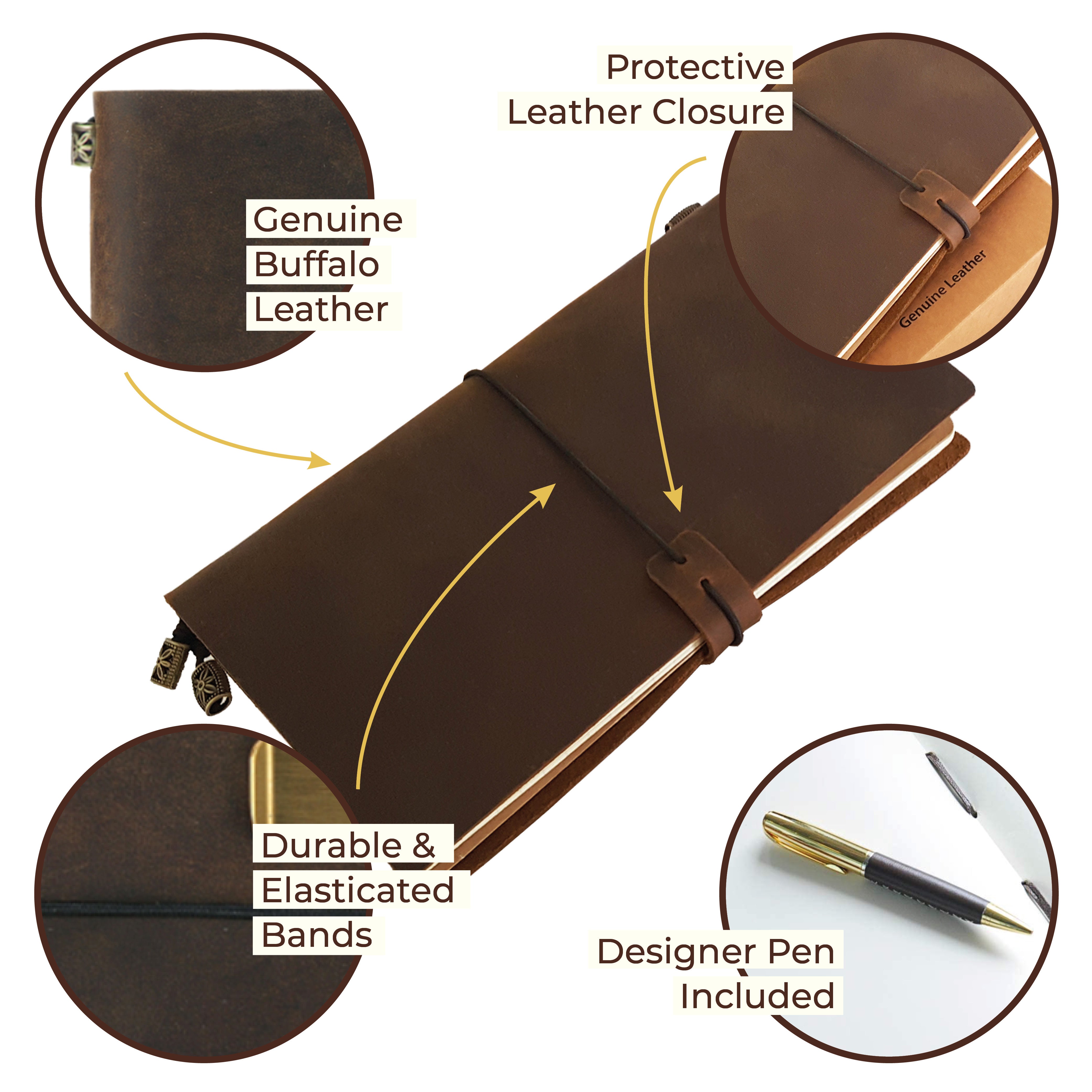 This elegant leather travel notebook is crafted for everyday life, offering a compact, easy-to-carry design that keeps your thoughts, plans, and ideas close at hand. The smooth, genuine leather cover feels soft and luxurious, developing a natural distressed patina over time that reflects your personal journeys. Its timeless look and warm character make it a cherished companion for writers, students, travellers, and anyone who enjoys the pleasure of writing by hand.
