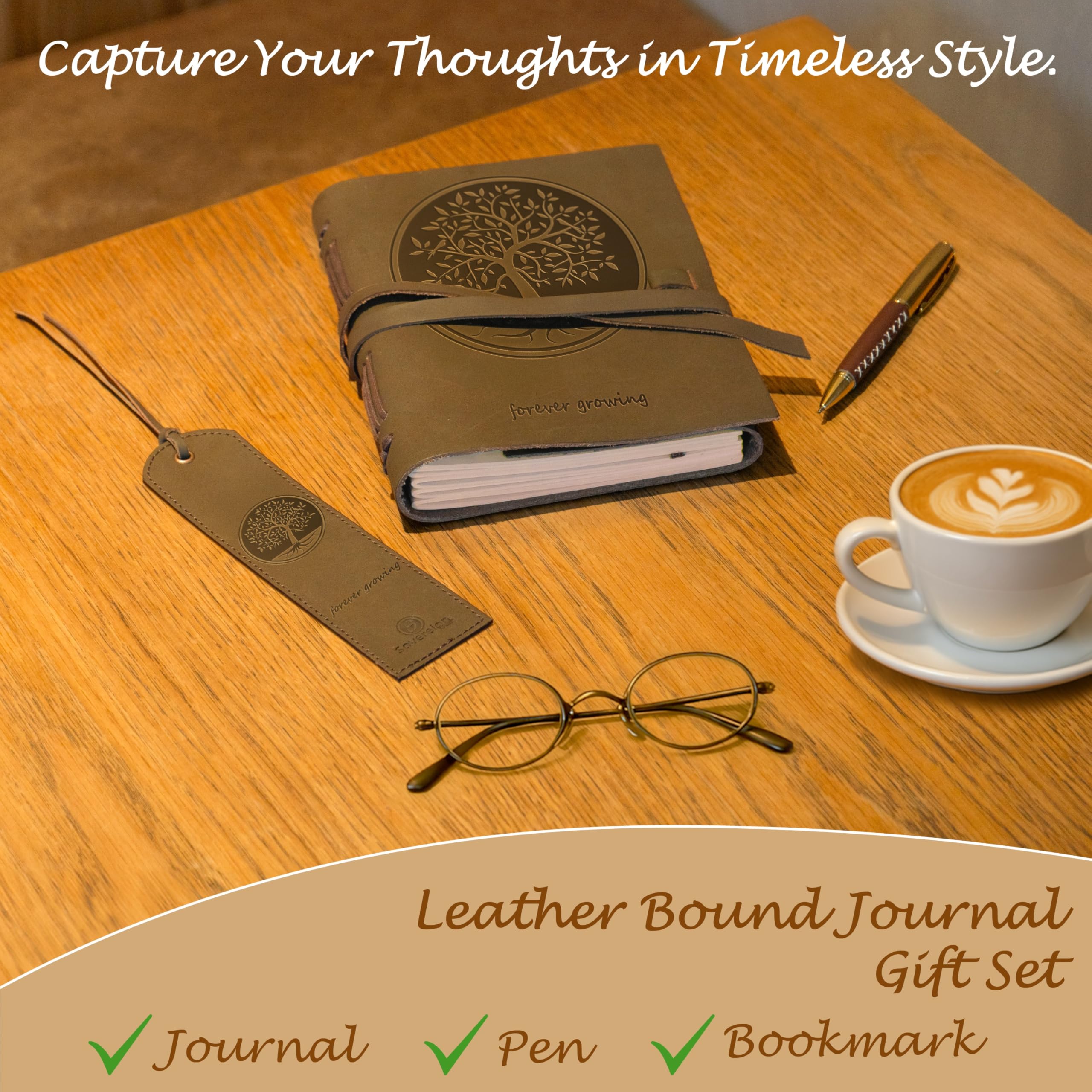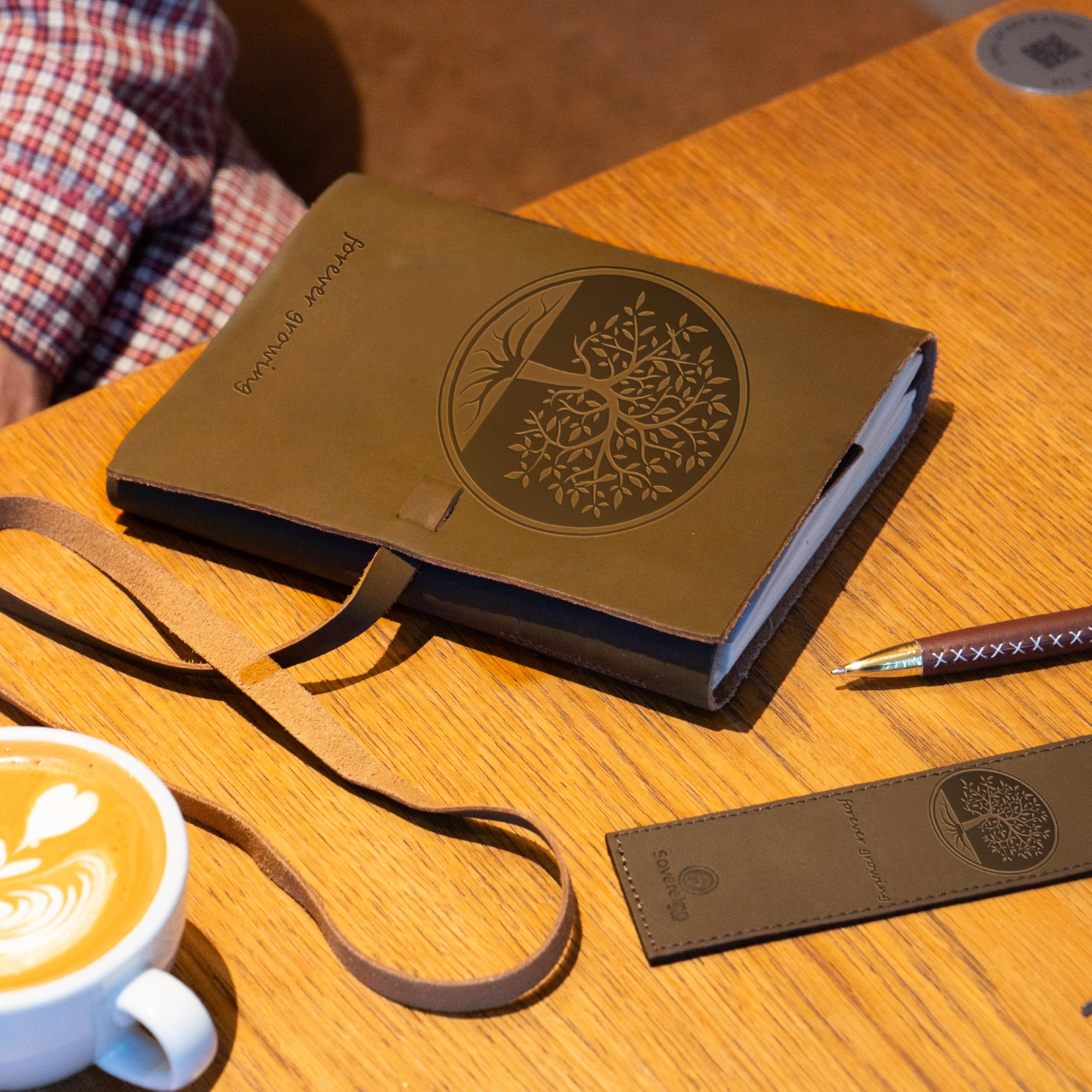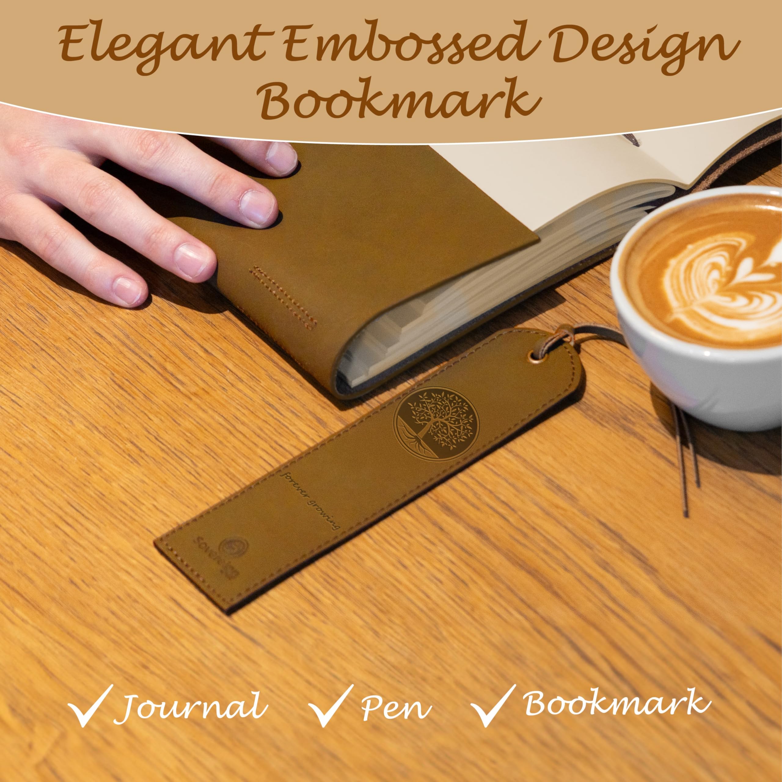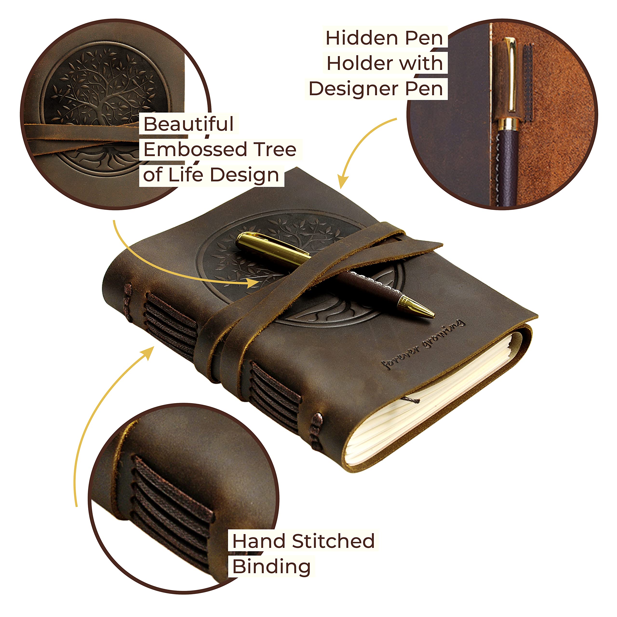 • UNIQUE GIFT SET with handmade leather journal, leather bookmark, hidden pen holder & stylish pen - all in this finely crafted presentation box making it the perfect present. The A5 travel journal has stylishly embossed Tree of Life front cover design. The leather bound notebook includes a free stylish gold pen, holder and stitched jute bookmark. A long leather strap ties around the journal notebook to close securely