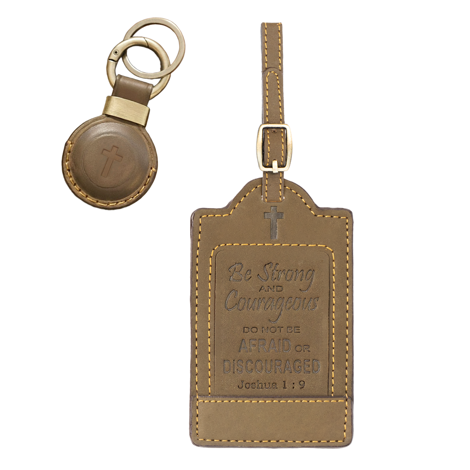 - INSPIRATIONAL DESIGN - EMBOSSED RELIGIOUS VERSE - Celebrate faith and craftsmanship with this Sovereign-Gear luggage tag, featuring the empowering verse 'Be Strong & Courageous' from the Book of Joshua, beautifully embossed on premium brown leather. A meaningful blend of timeless style and spiritual strength - perfect for daily inspiration or thoughtful gifting.