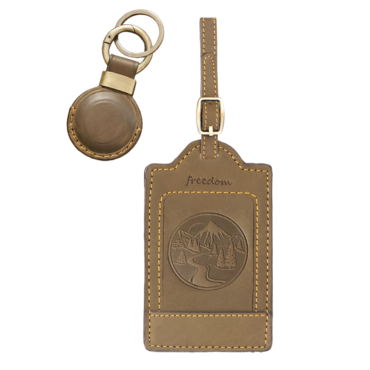 1 Mountain Embossed Leather Luggage Tag + 1 AirTag Holder - Genuine Handcrafted Leather