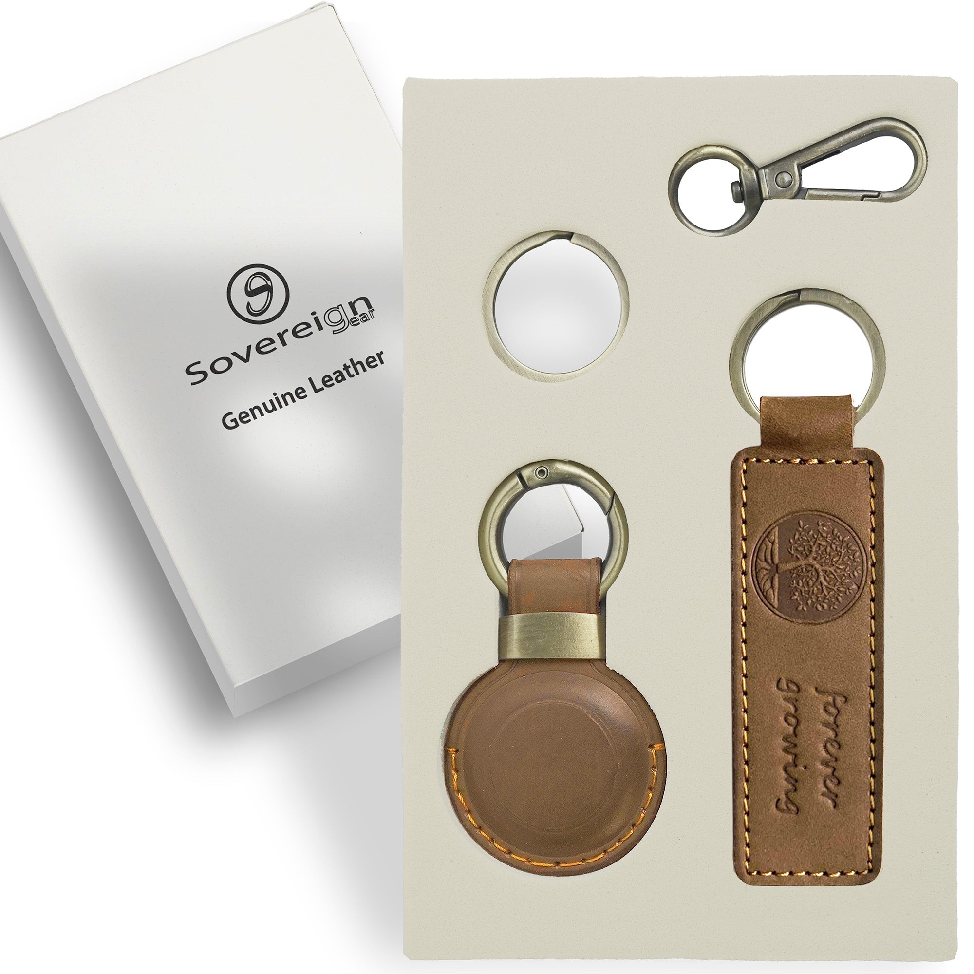 - PREMIUM REAL LEATHER CRAFTSMANSHIP Sovereign-Gear brings you a beautifully handcrafted combo of a leather keyring and leather airtag holder, both made from premium full-grain leather. Built for durability and long-lasting style, the rich brown finish ages beautifully over time. This high-quality set is the perfect everyday essential for those who value craftsmanship and functionality.