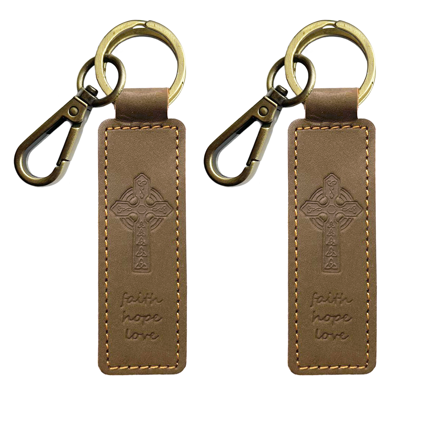 2 Leather Keyrings - Embossed Cross - Genuine Handcrafted Leather