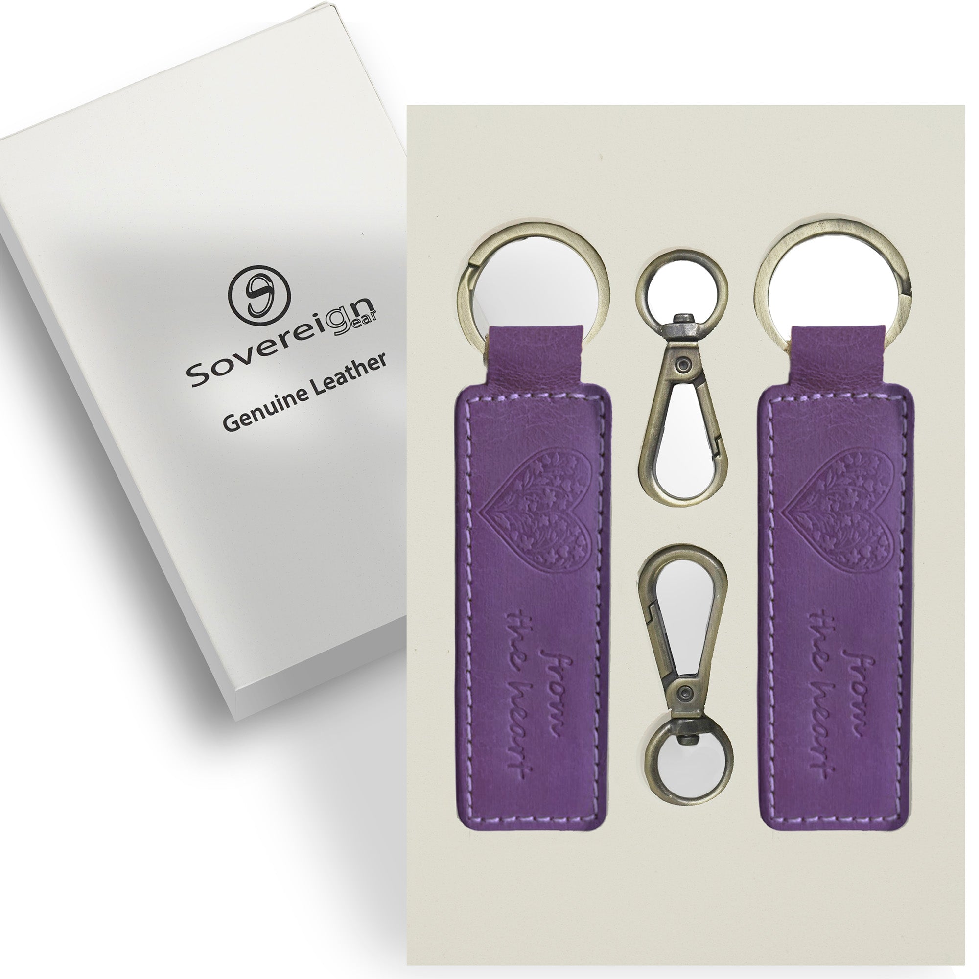 This premium purple leather keyring set features a beautifully embossed heart design, adding a meaningful and romantic touch to your everyday essentials. Crafted from high-quality buffalo leather, each keyring offers a soft yet durable feel that develops a rich patina over time. The heart motif adds charm and sentiment, making this set perfect for gifting to loved ones or keeping as a personal keepsake. The vibrant purple color stands out in bags or drawers, making your keys easy to find while adding a stylish accent.