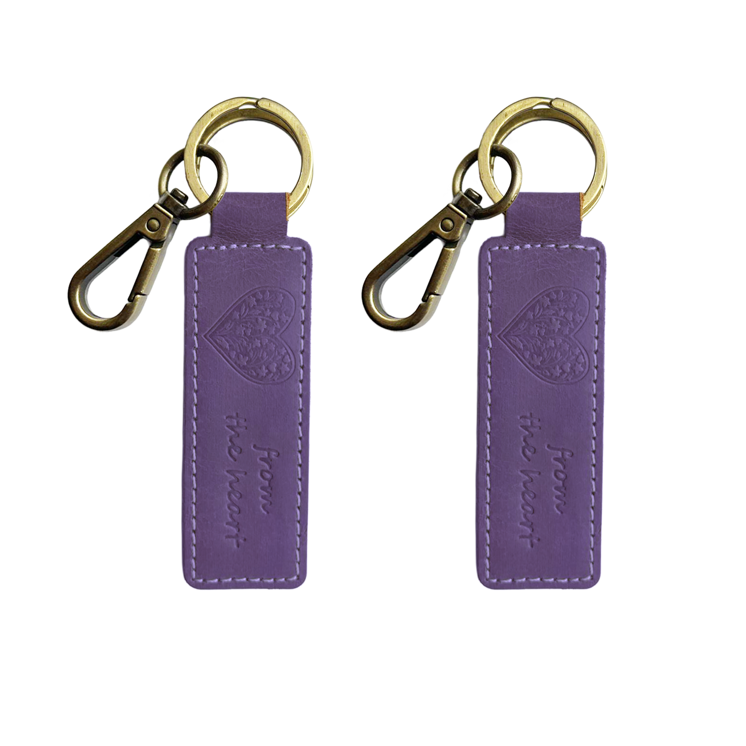 2 Purple Leather Keyrings - Embossed Heart - Genuine Handcrafted Leather