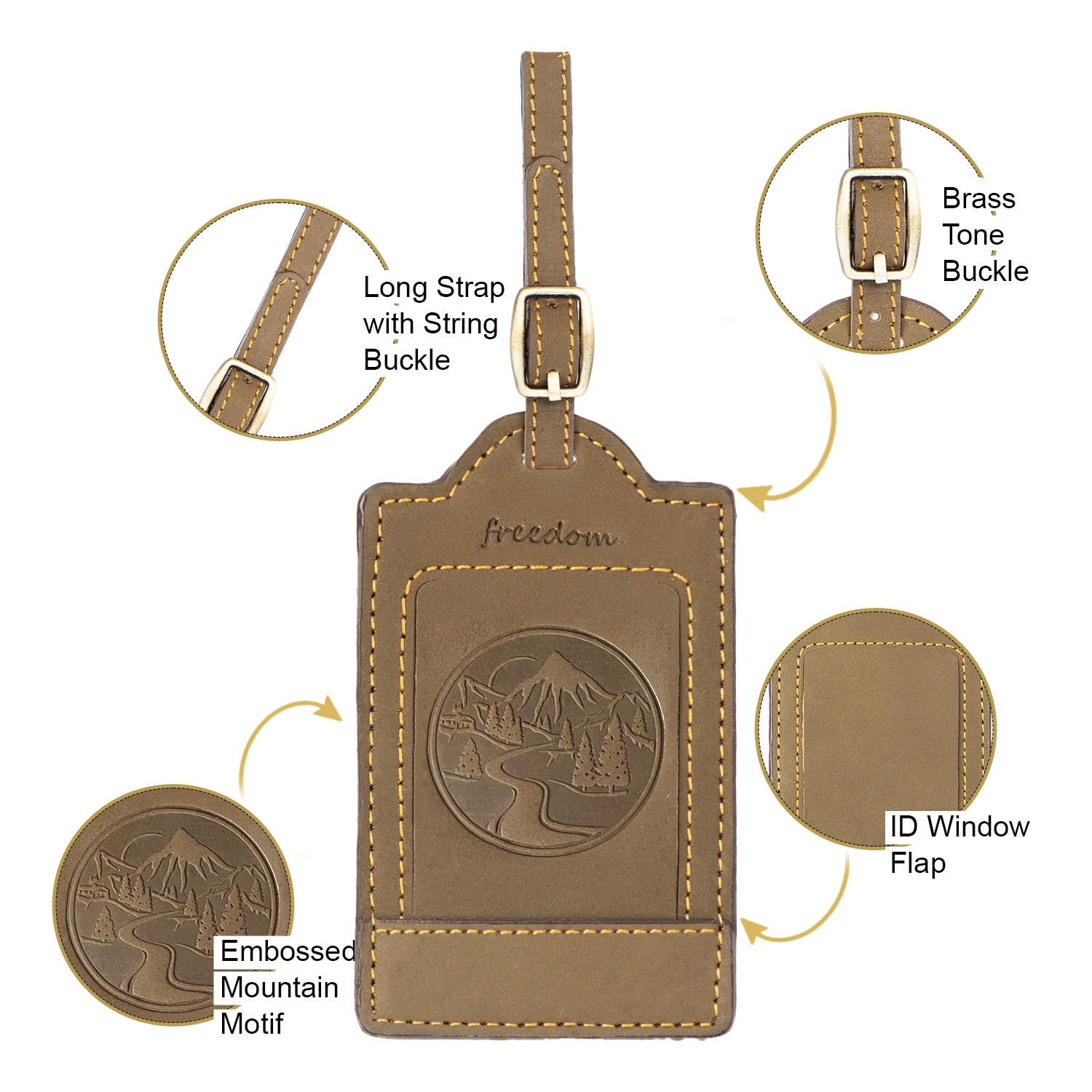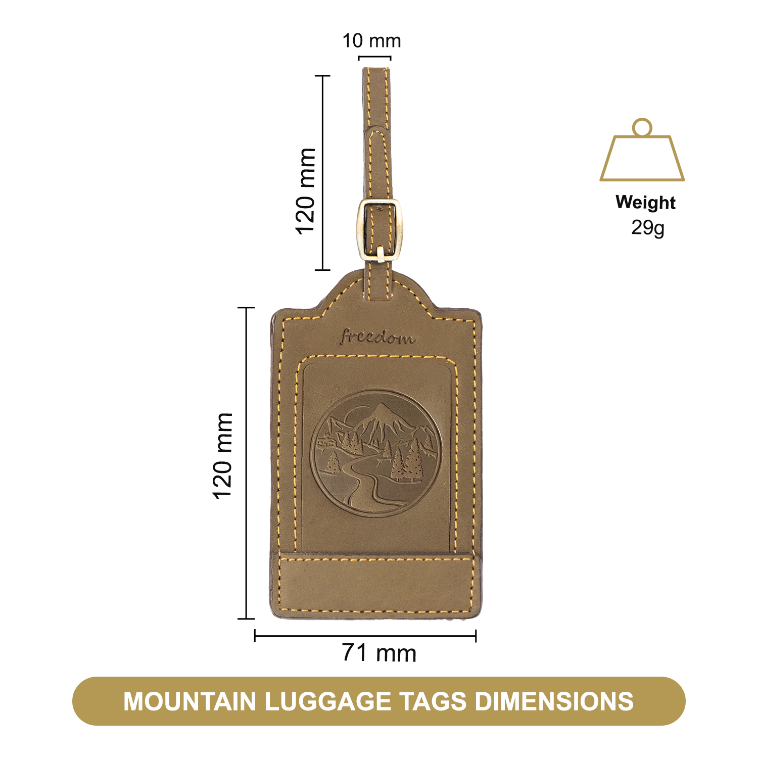 - EMBOSSED MOUNTAIN DESIGN - ADVENTURE-READY STYLE - Showcasing a rugged mountain design embossed into brown leather, this Sovereign-Gear luggage tag evokes the call of the wild. Made from buffalo leather, it offers a vintage look that ages beautifully with use. A perfect companion for outdoor enthusiasts and globe-trotters alike, this suitcase name tag luggage adds both character and durability to your travel gear.