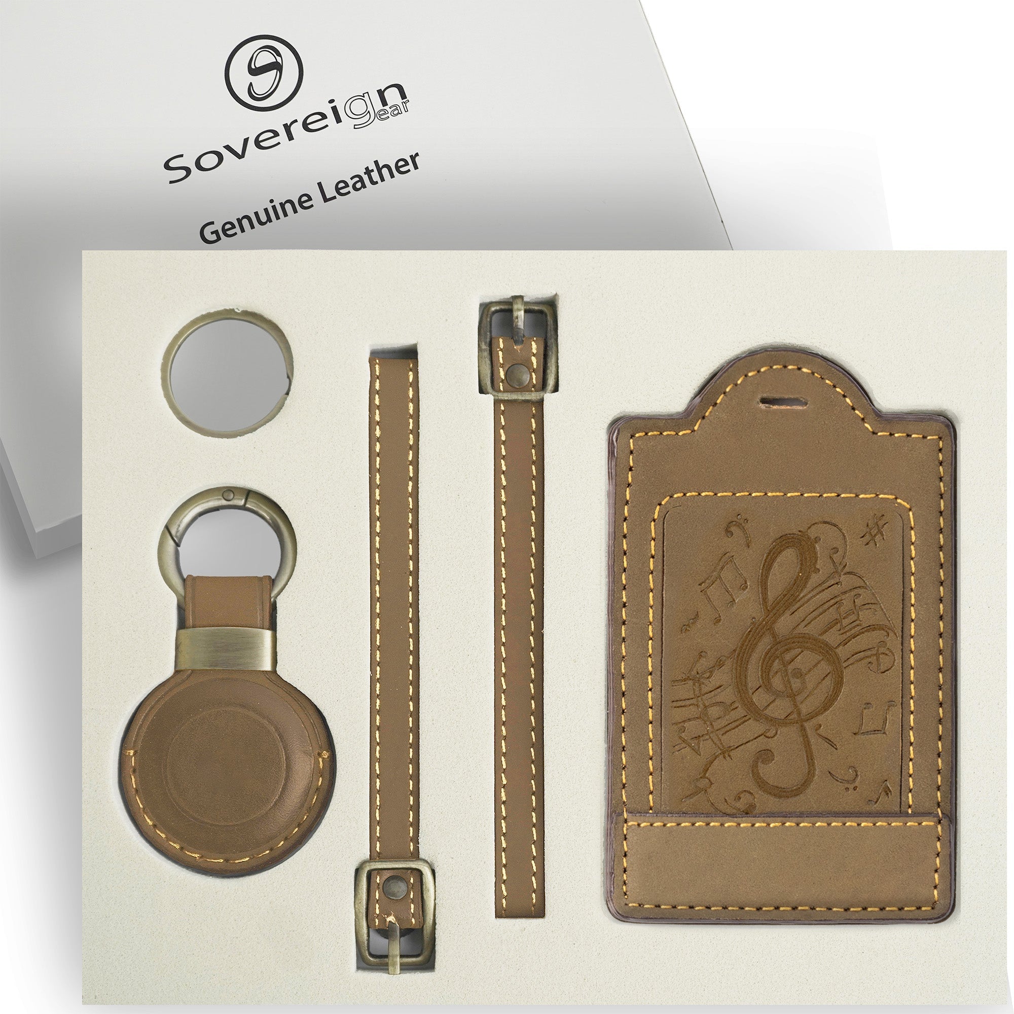 This premium full-grain leather luggage tag and AirTag holder set features an intricately embossed treble clef and musical notes, offering a stylish nod to music lovers. The detailed embossing adds artistic flair, while the rich brown leather provides durability and a timeless aesthetic. Ideal for musicians, performers, or anyone who appreciates creative design, this set brings personality to your travel gear.
