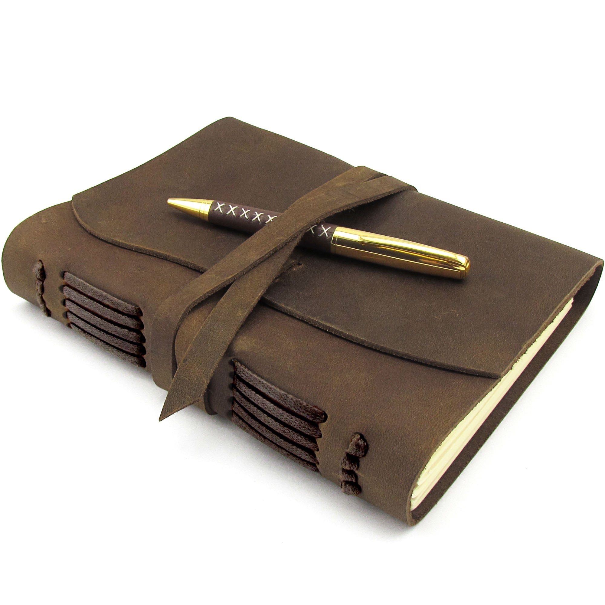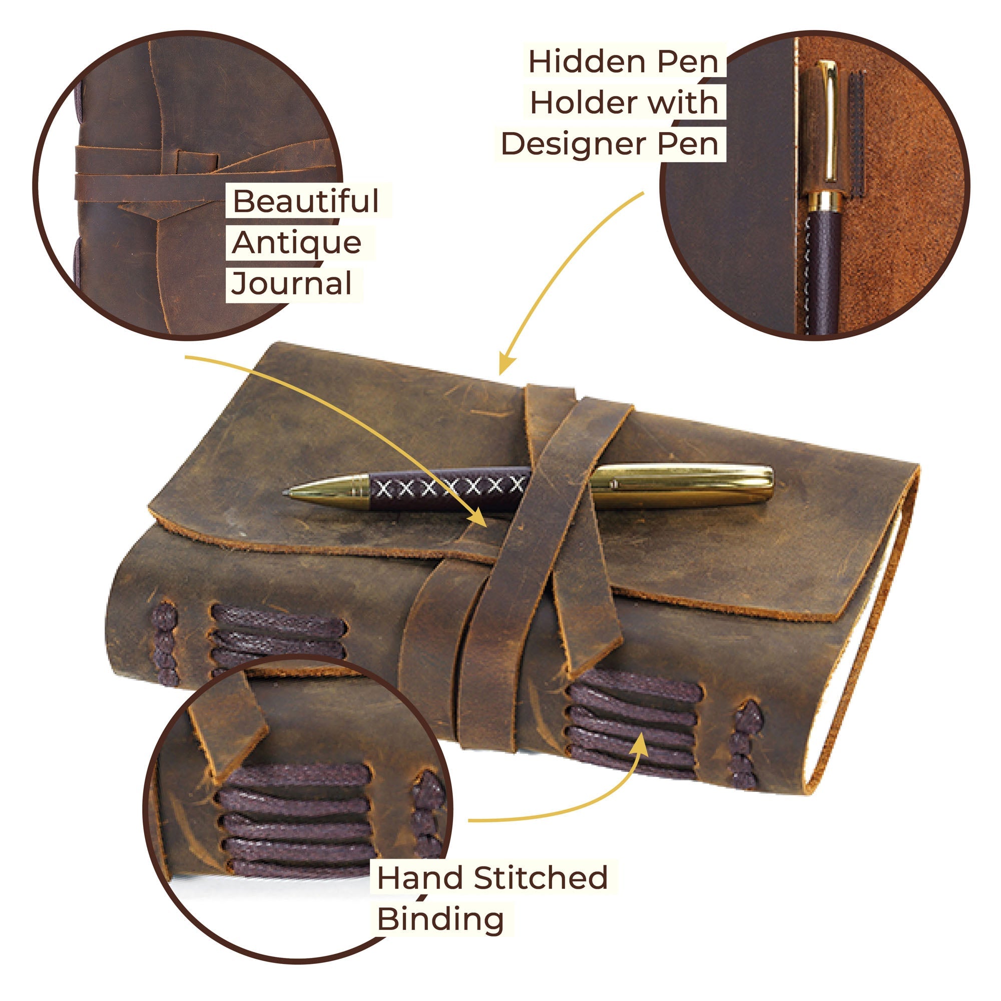 - UNIQUE HAND-MADE LEATHER JOURNAL - start writing in this lovely best selling rustic leather-bound journal. Includes a stylish pen, pen holder loop, jute bookmark and spine stitching. Secure leather strap wraps around the journal