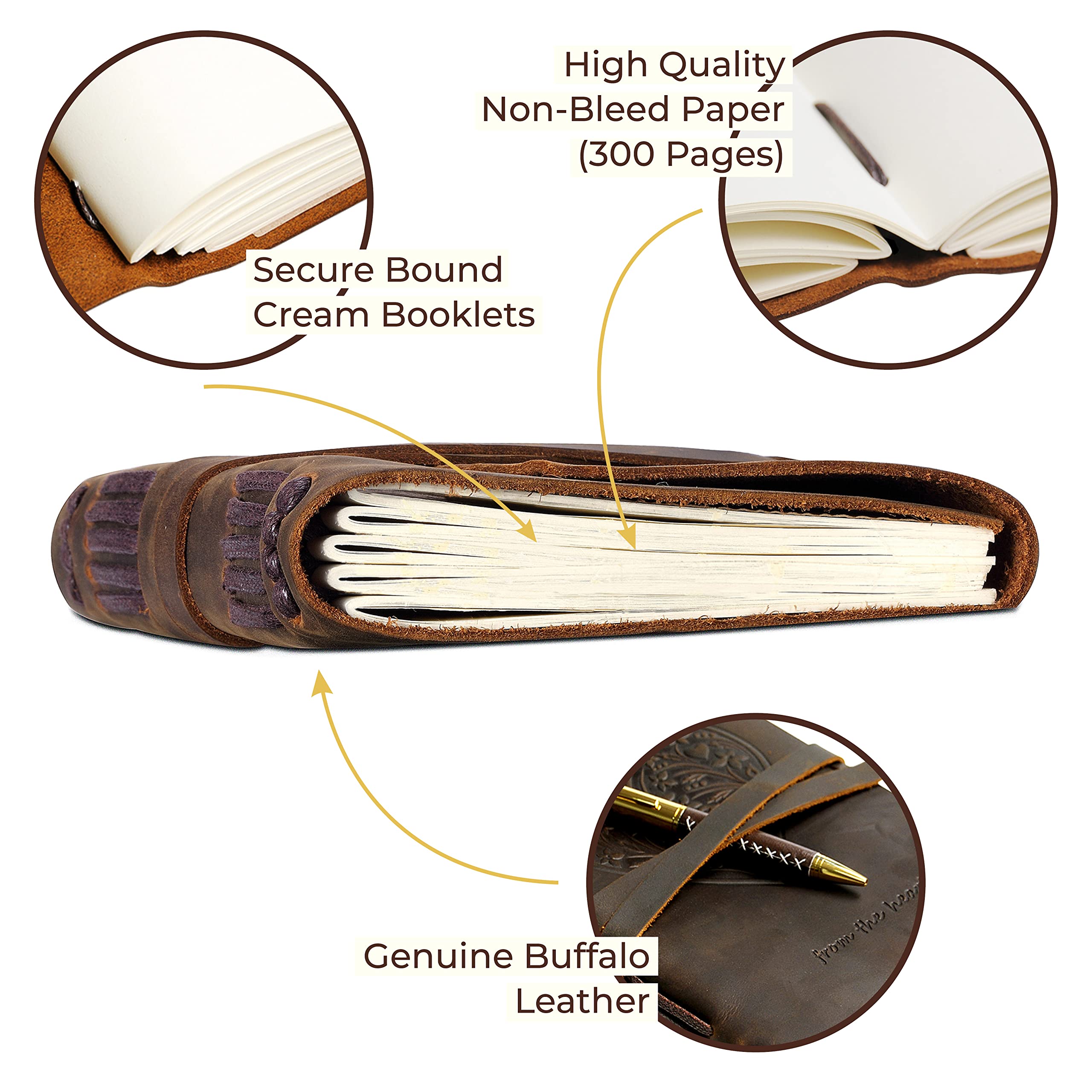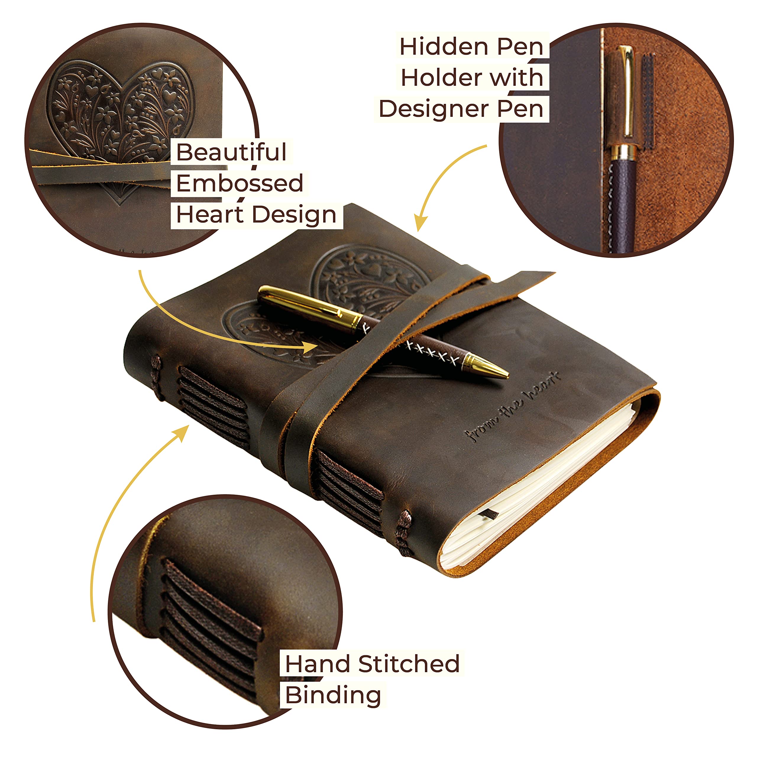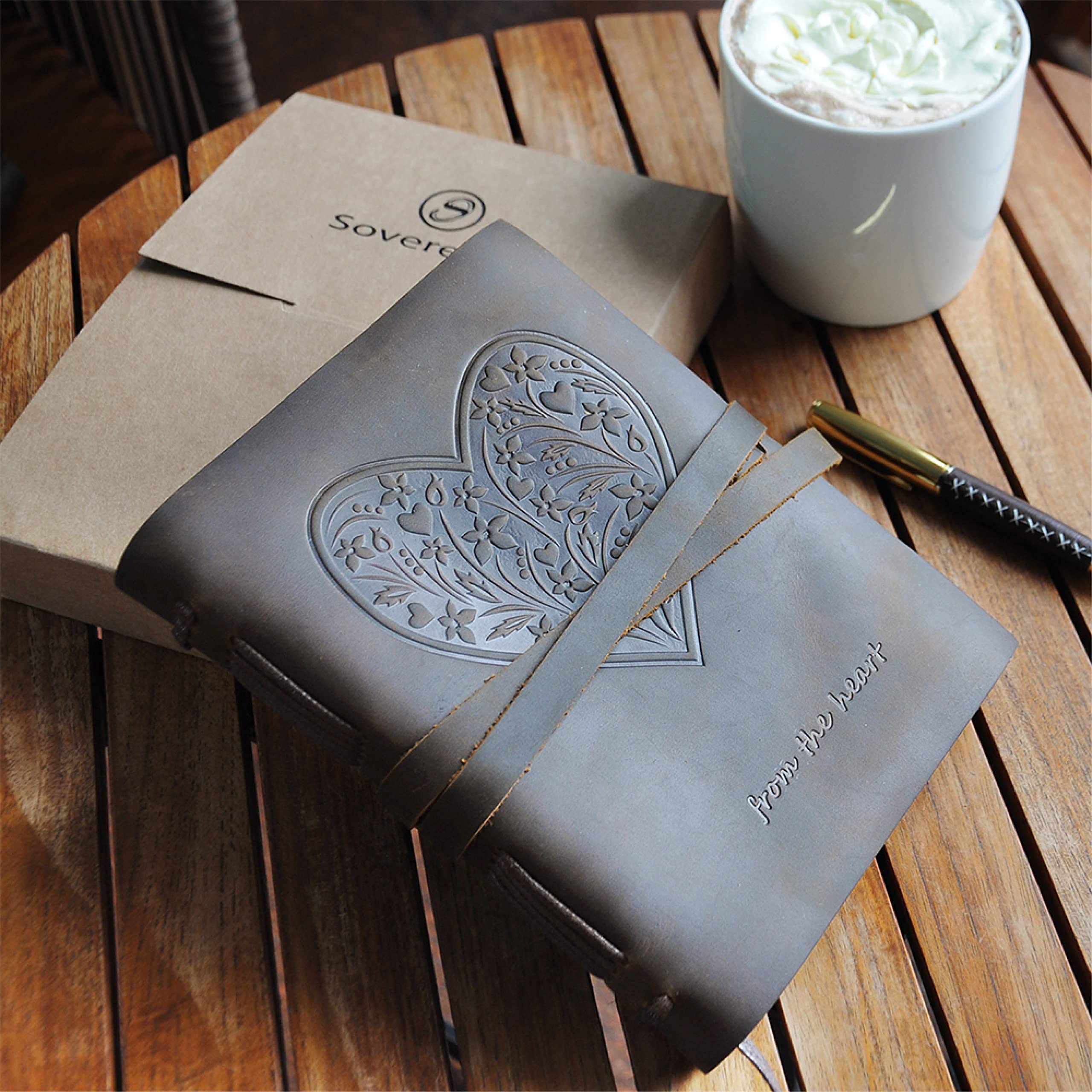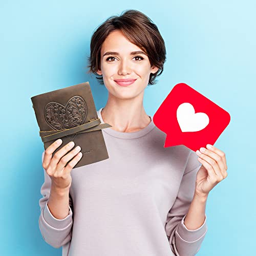 - HAND MADE REAL LEATHER HEART JOURNAL - travel journal with flowers and hearts embossed on the front soft cover. Our cool brown leather bound notebook includes a free stylish gold pen, holder and stitched jute bookmark. A long leather strap ties around the journal notebook to close securely