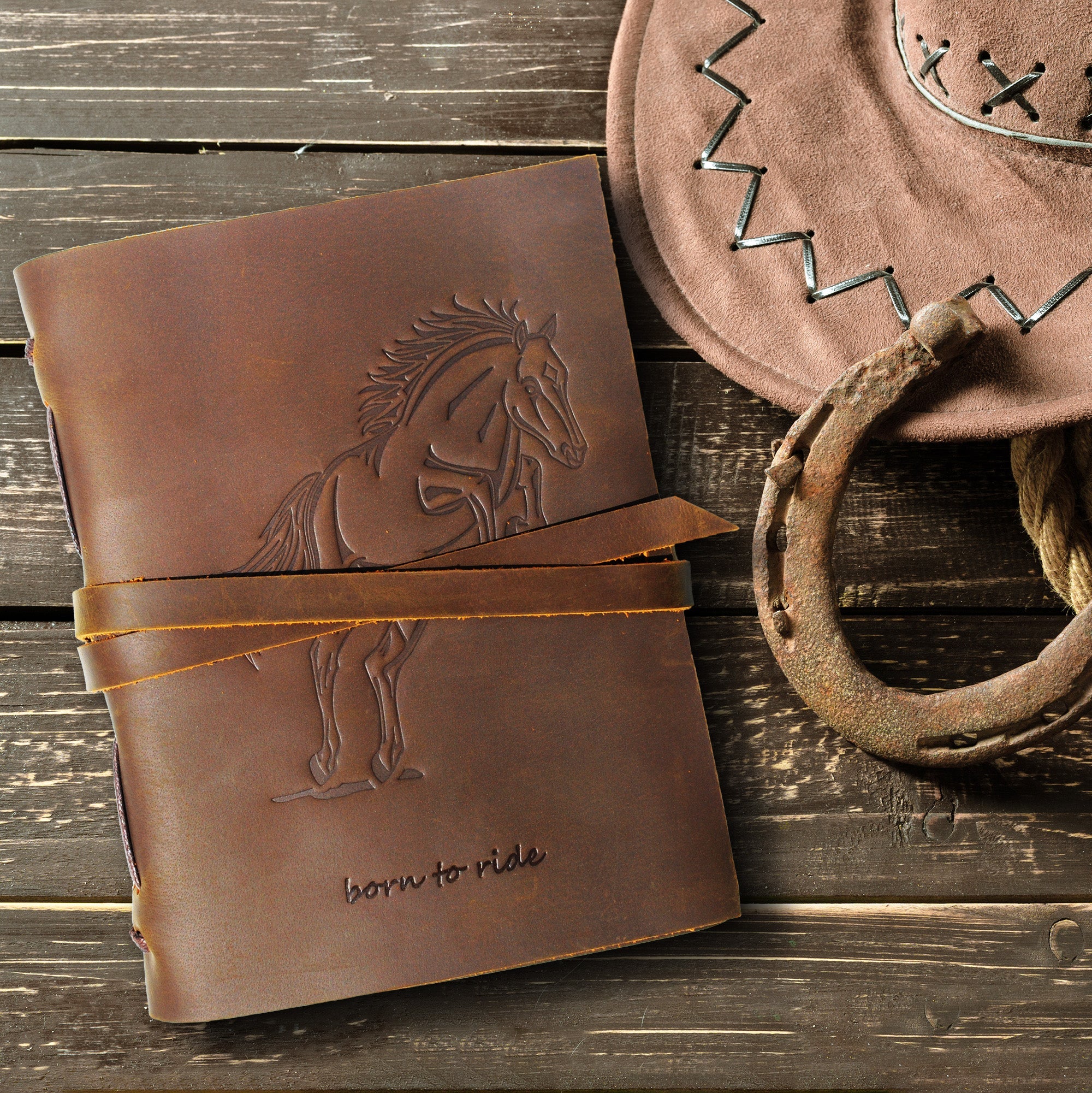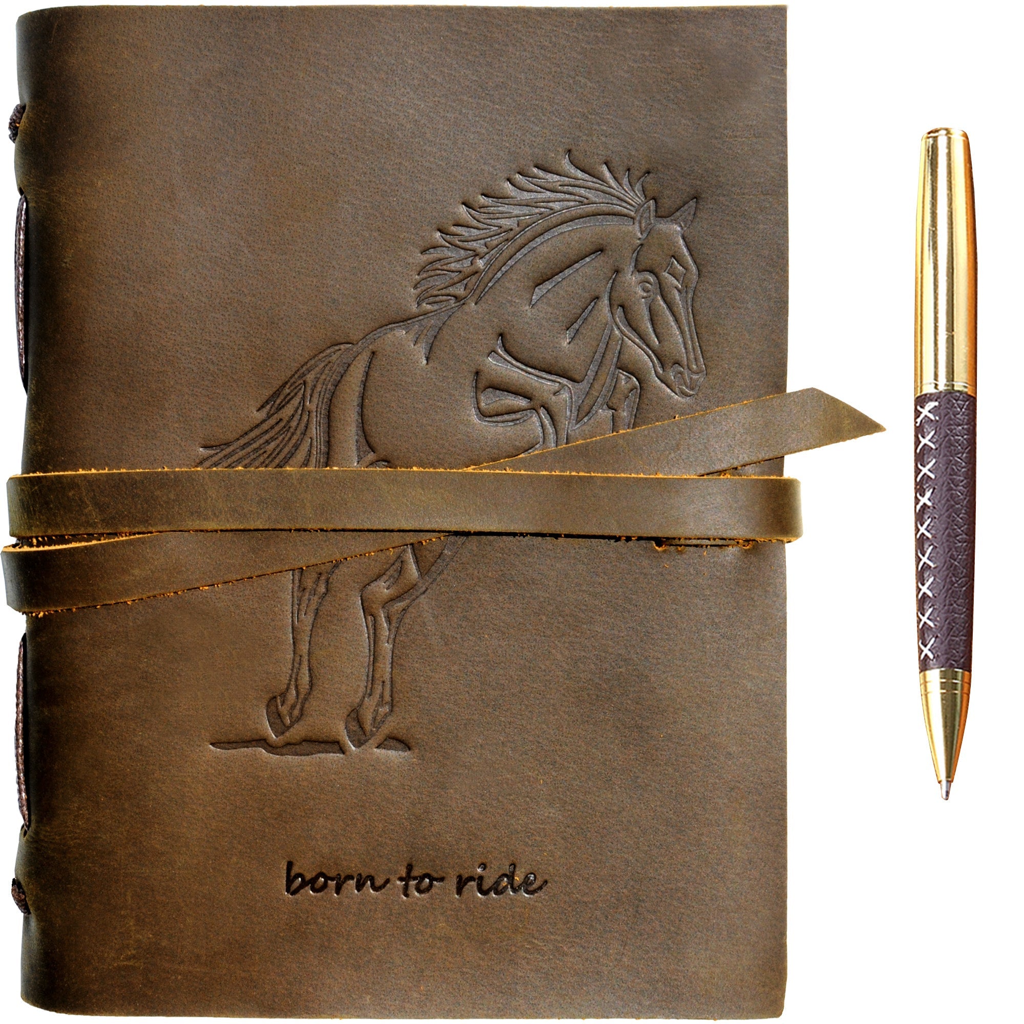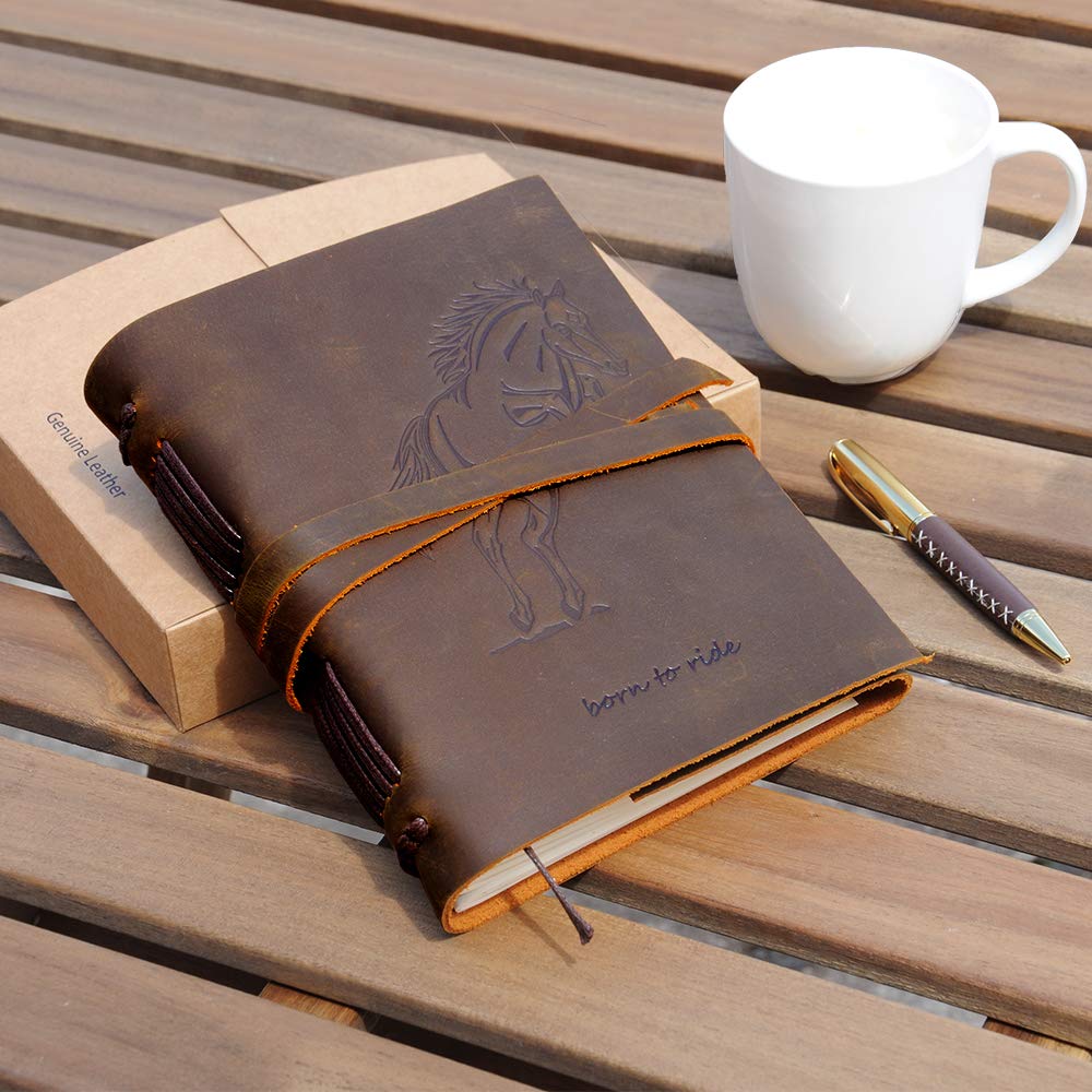 • HAND MADE REAL LEATHER HORSE JOURNAL - A5 travel journal with a jumping horse embossed front soft cover with hidden pen holder. Our leather bound equestrian themed notebook includes a free stylish gold pen - always handy to start writing in these lovely cool dark brown journals. A useful jute bookmark keeps your place for the next time you open it. Long leather strap wraps around the journal notebook to secure firmly when not in use