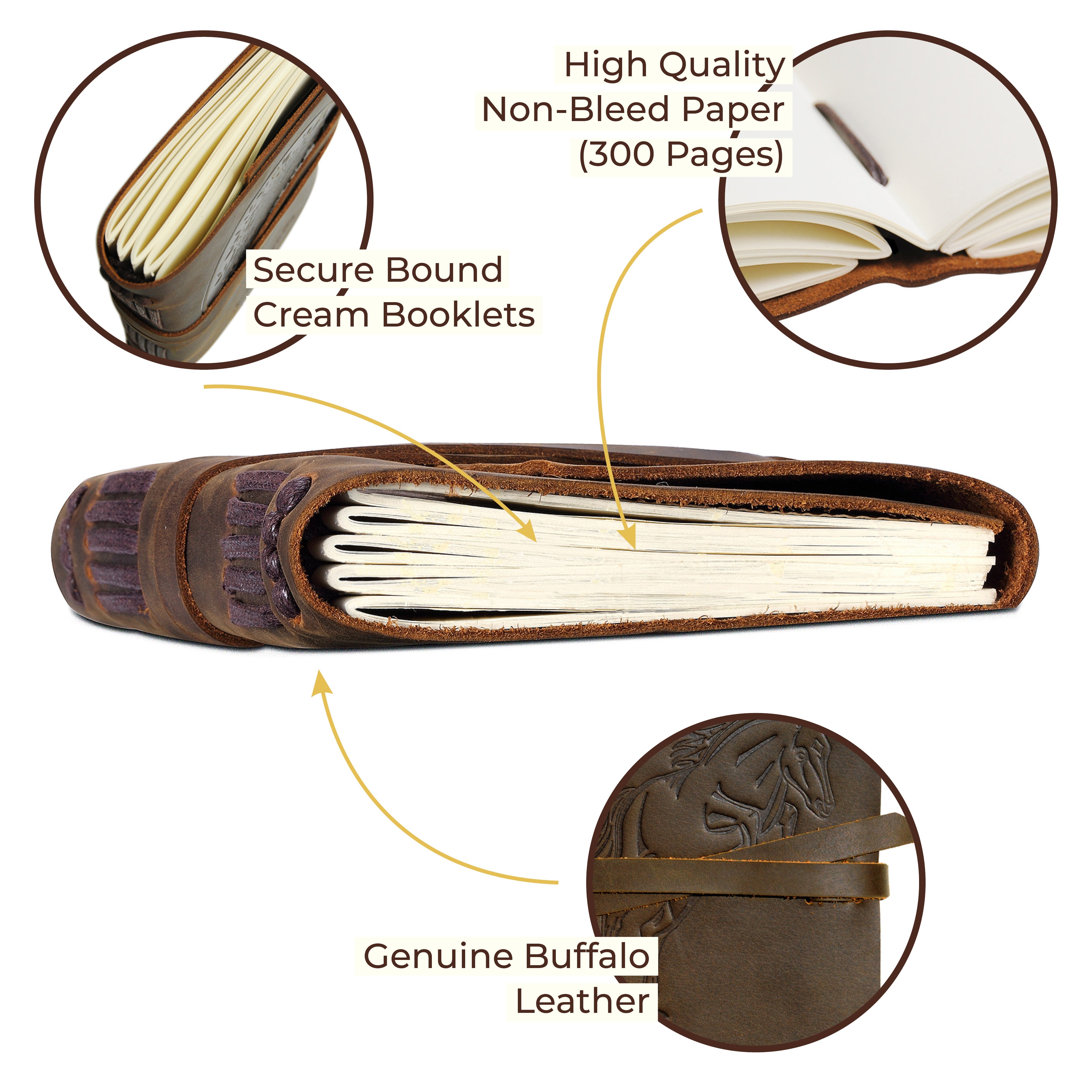 • QUALITY THICK CREAM PAPER 300 pages of plain un lined blank paper sheets (counting both sides) - plenty to jot down a note, memories, daily plans, scribble a rough sketch or ideas for your poetry, novel or bullet journal. This timeless leather book journal is not refillable. No bleed through with fountain pens so any pen type can be used in this retro real leather notebook. Matching bookmark NOT included but sold online