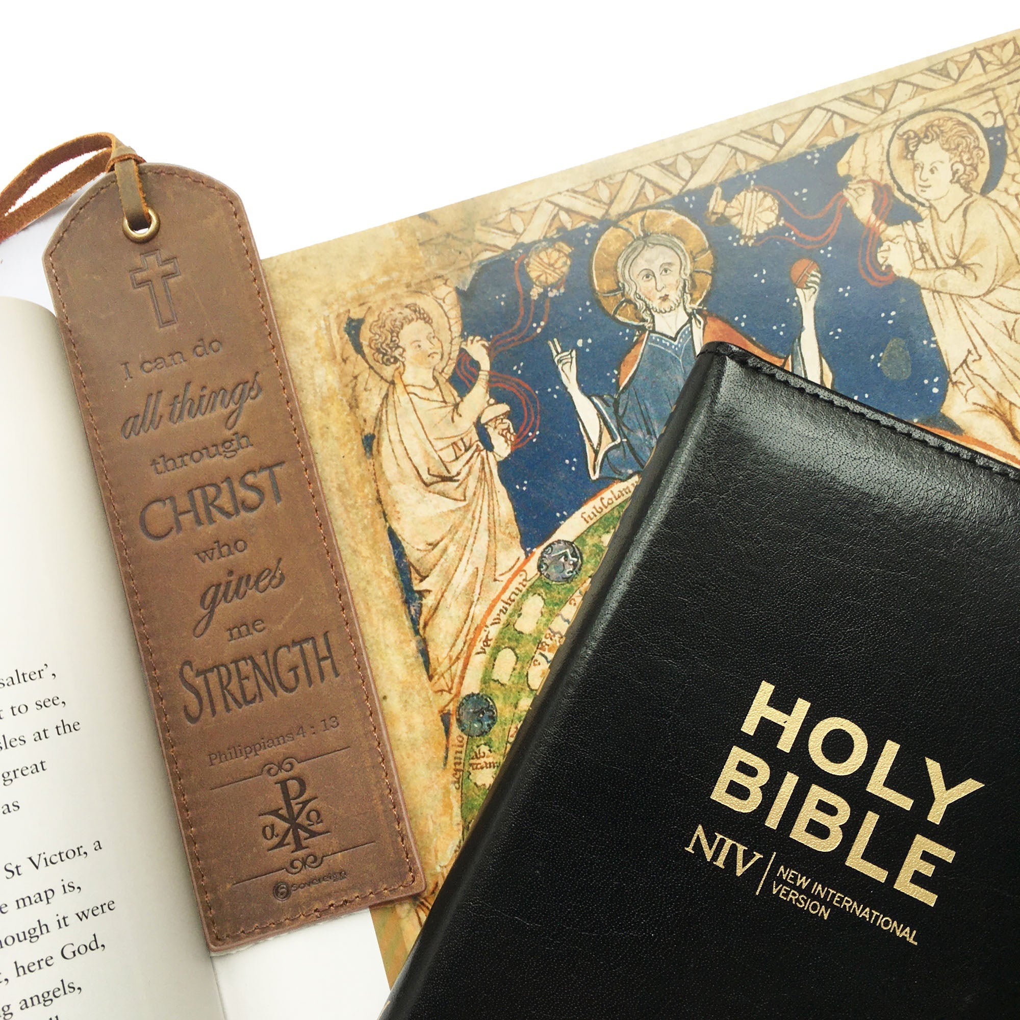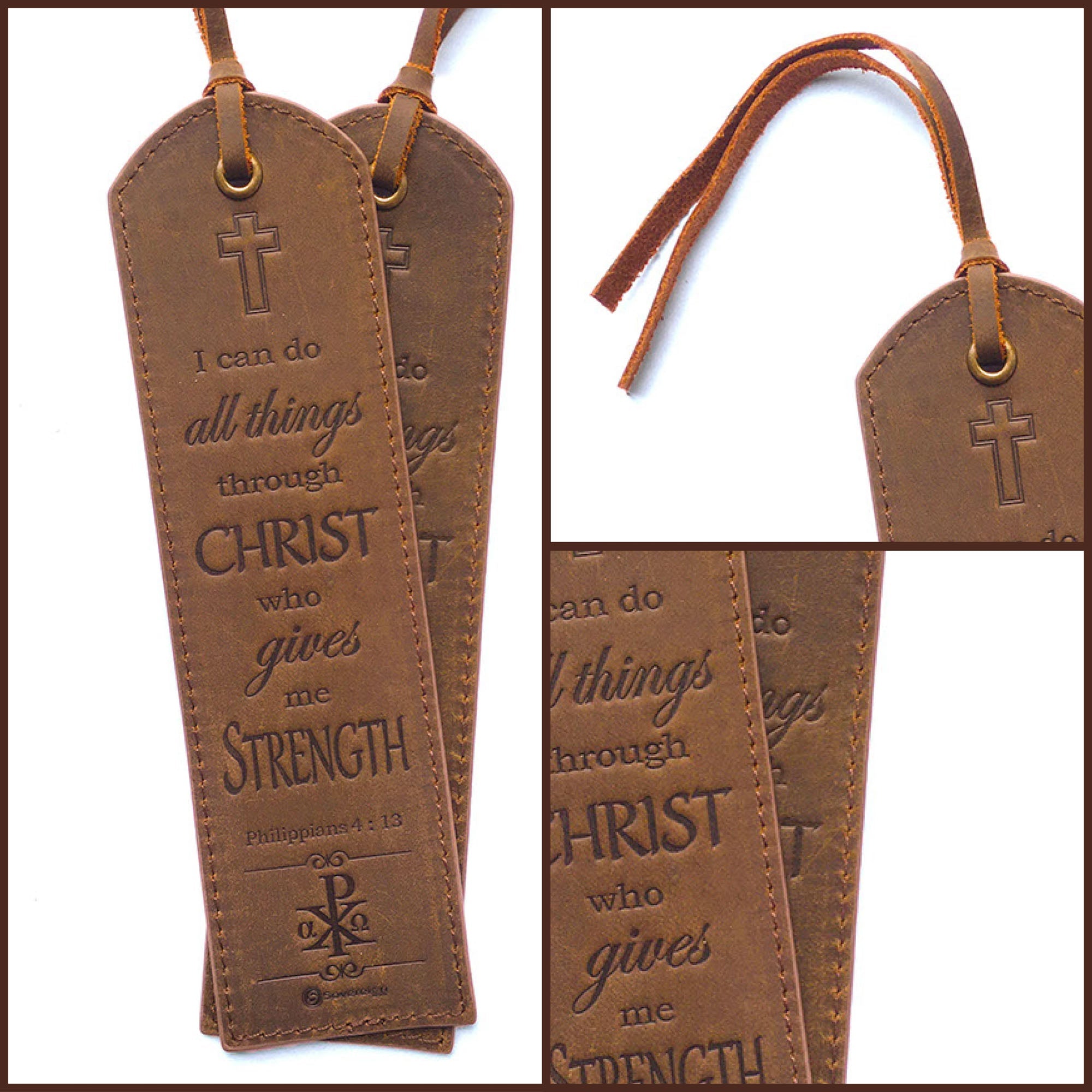 - SCRIPTURE VERSE BOOKMARK - this Bible verse bookmark features the scripture sentiment from Philippians 4 : 13: 'I Can Do All Things Through Christ Who Gives me Strength'. These high-quality leather bookmarks offer words of hope and encouragement to a colleague, friend or loved one in their faith as they meditate on the truth of God's word