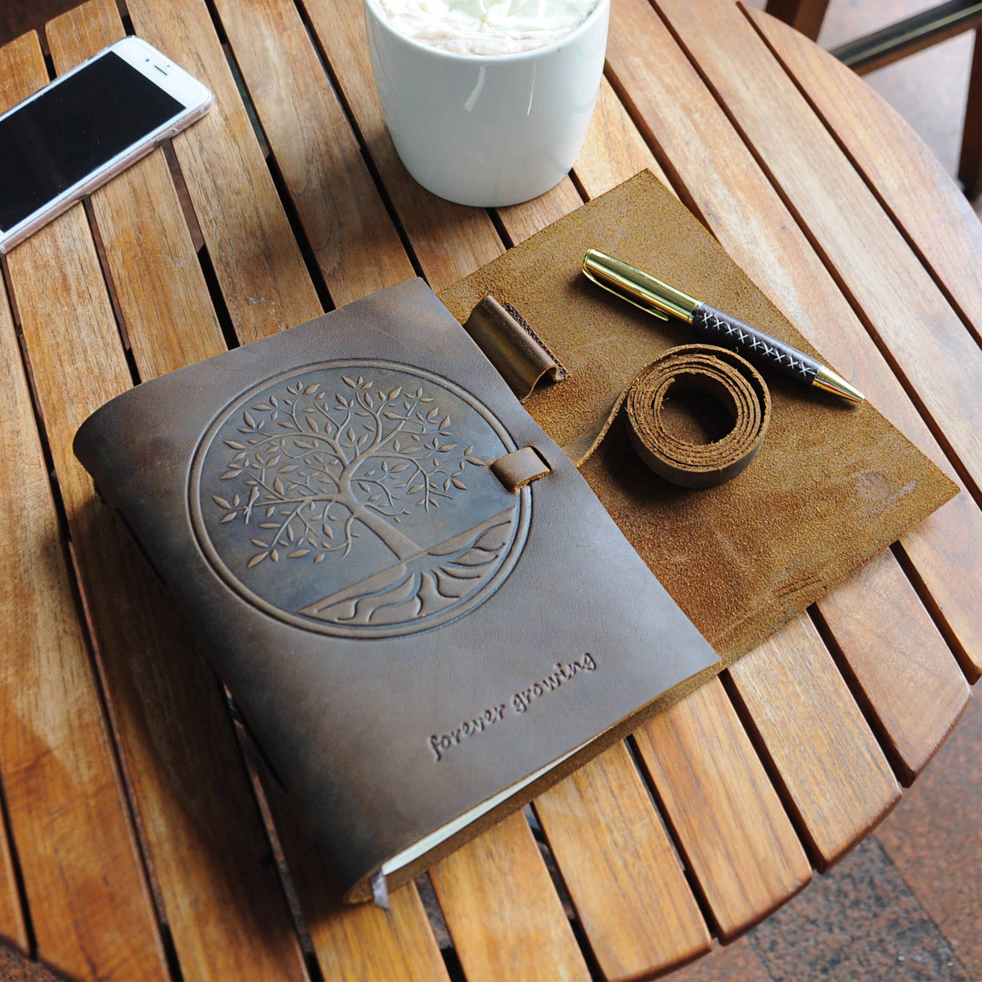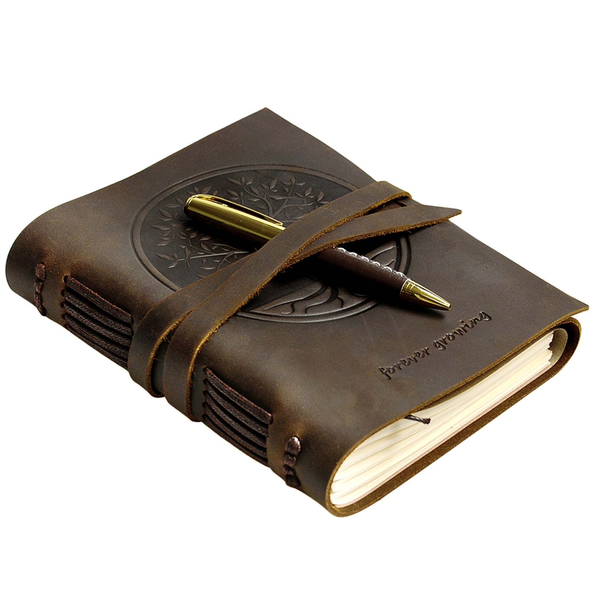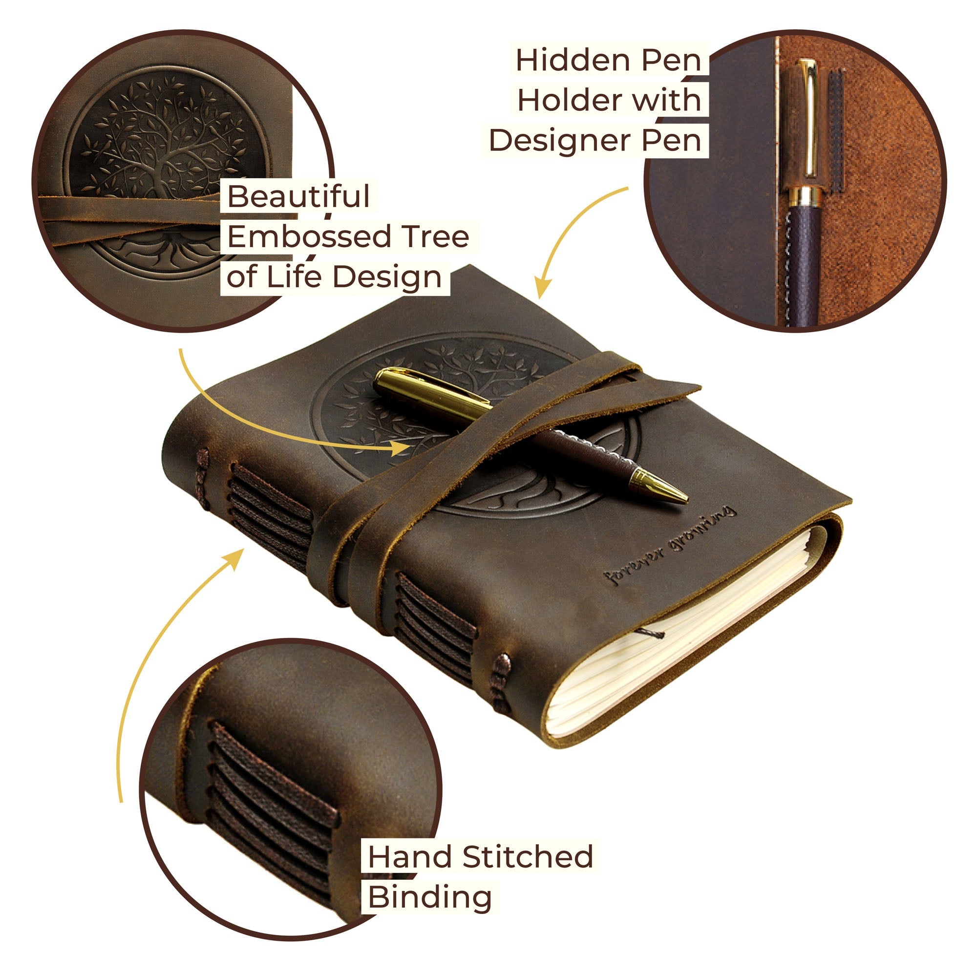 - HAND MADE REAL LEATHER TREE JOURNAL - 7x5 travel journal with a Tree of Life embossed front cover made from crazy horse leather, soft-feeling, delicate yet super tough with a wonderful old leather smell. Distressed looking and coated with special oils so marks fade when rubbed. Decorative stitching on spine adds charm to this delightful keepsake