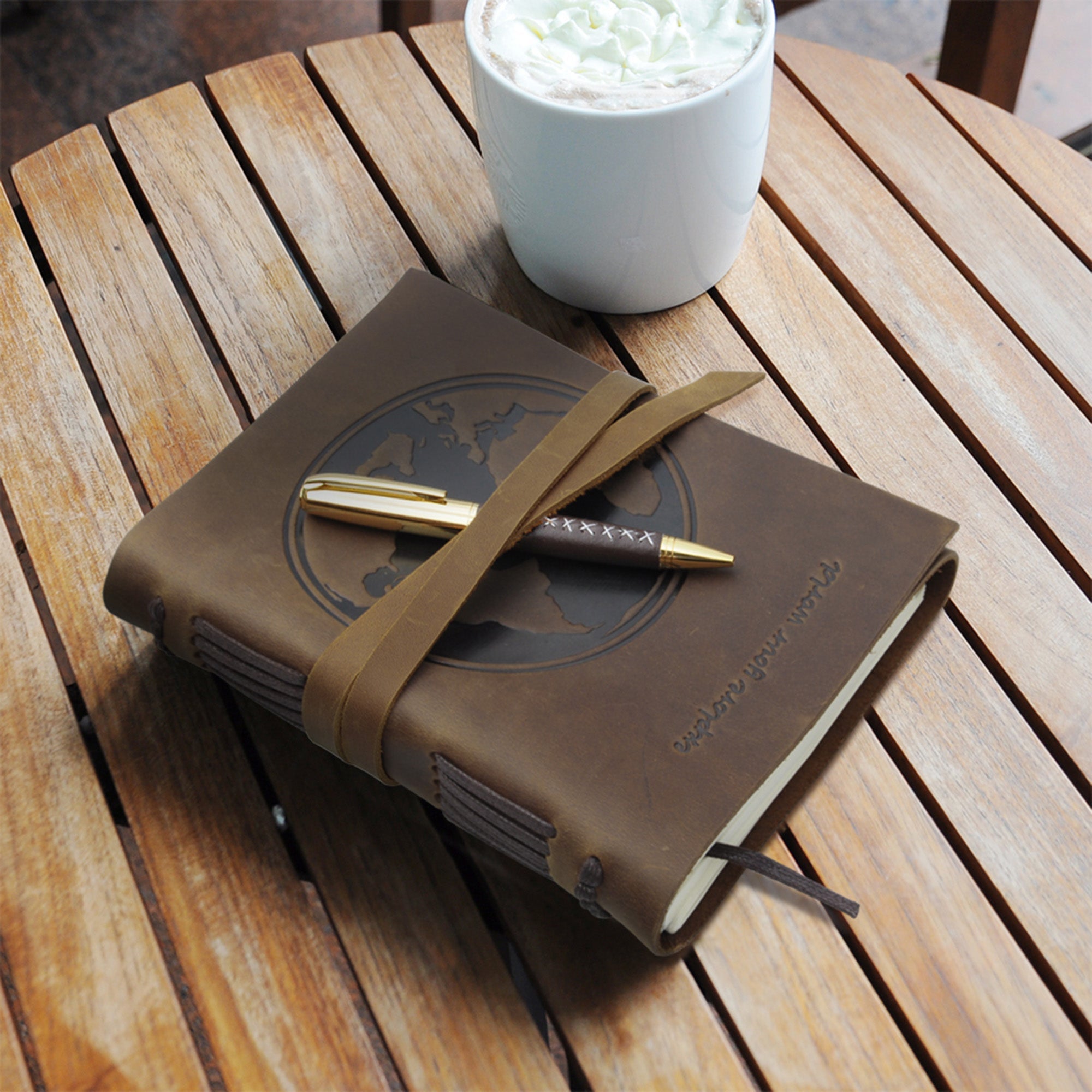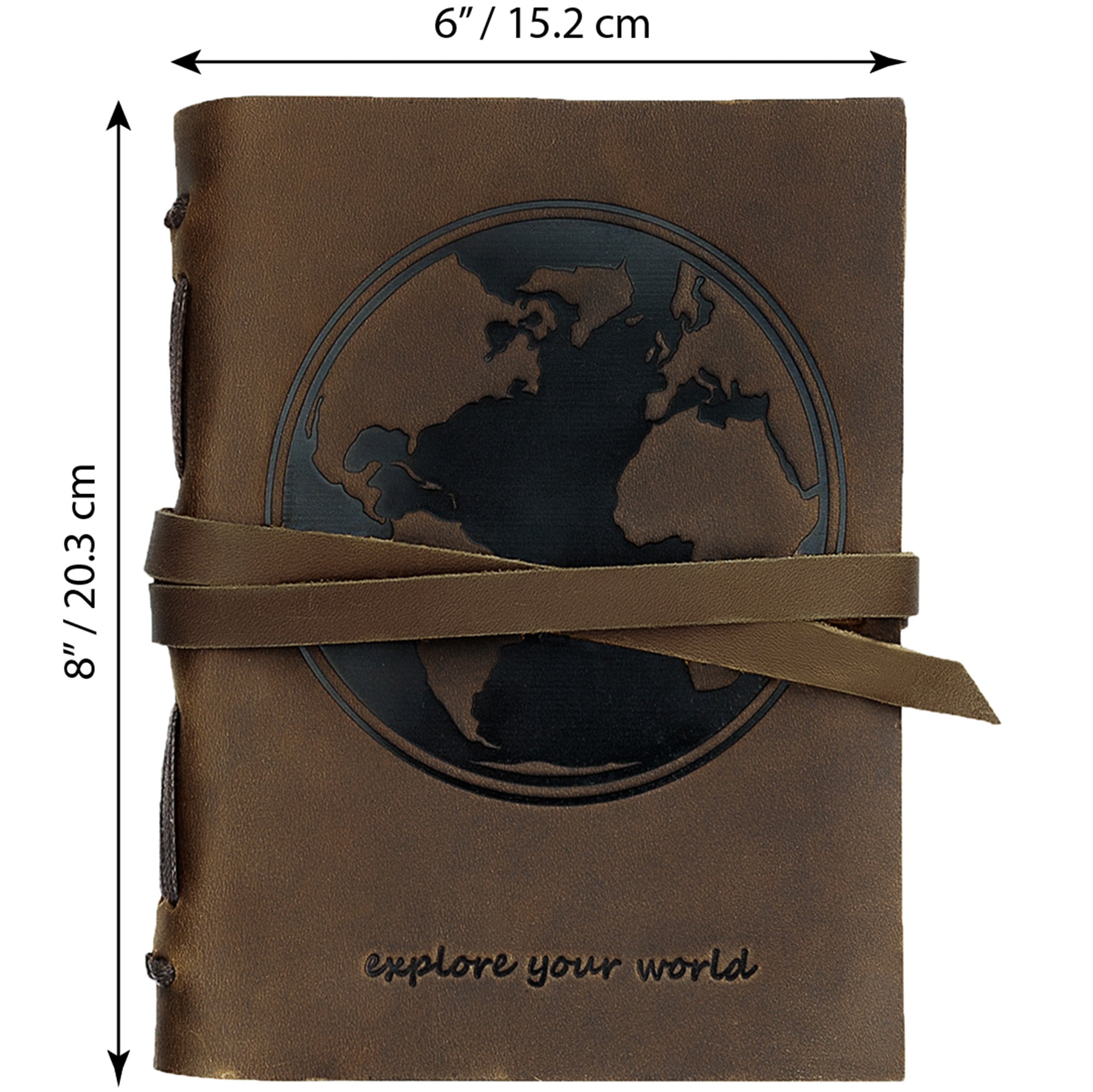 - HAND MADE REAL LEATHER WORLD MAP JOURNAL - A5 travel journal with a World Map embossed front and back cover made from crazy horse leather, soft-feeling, delicate yet super tough with a wonderful old leather smell. Distressed looking and coated with special oils so marks fade when rubbed. Decorative stitching on spine adds charm to this delightful keepsake