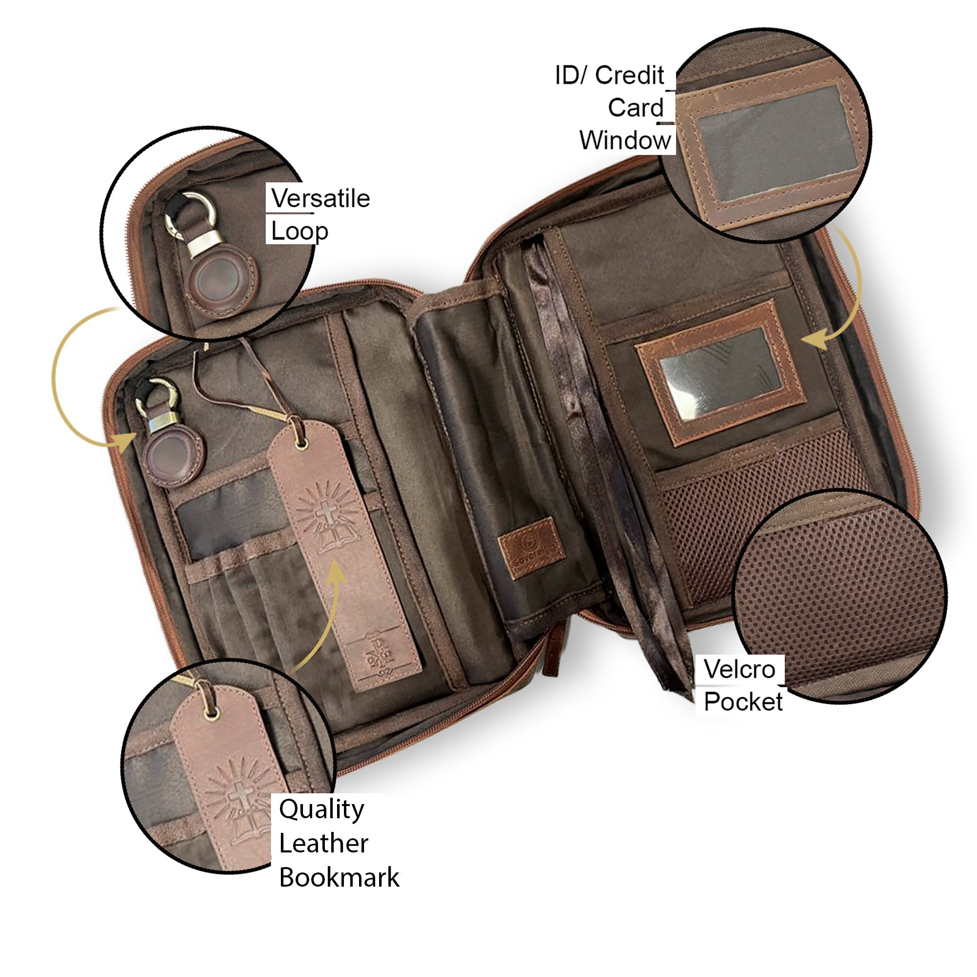Thoughtfully designed storage includes an exterior zip pocket for valuables and an open slot for notes, electronics, or documents. Inside, a Velcro pocket secures small items like money, keys, or USB drives, while an ID window and card holder keep essentials organized. This Bible cover doubles as a compact church bag, offering both practicality and devotional style.