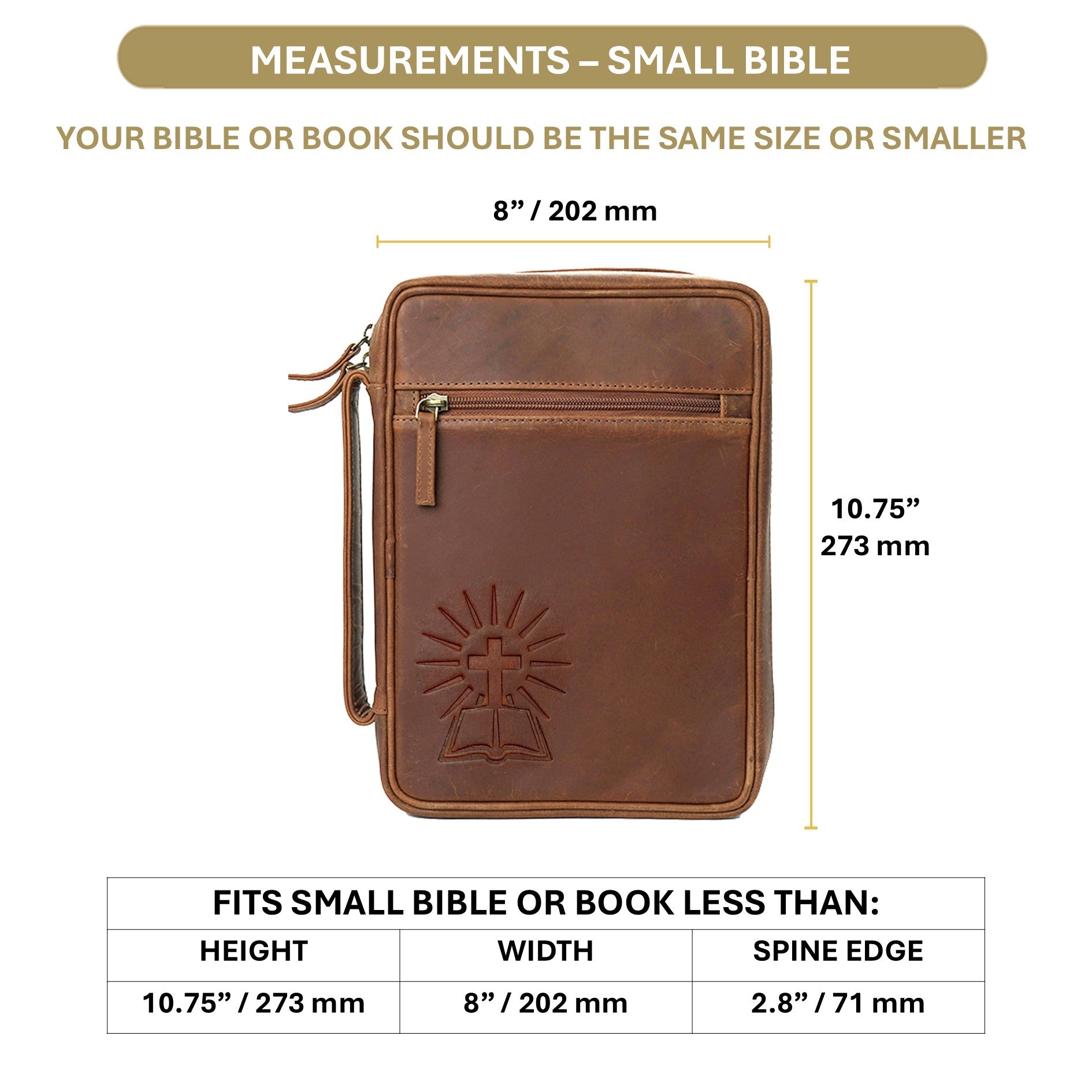 - HANDCRAFTED GENUINE LEATHER CROSS EMBOSSED DESIGN - This beautiful bible cover is made from premium buffalo leather with a unique embossed cross on the front. Durable yet elegant, this genuine leather bible cover fits Bibles up to 9" x 6" / 23 x 15 cm. Perfect as a small bible cover for men, a leather bible case for women, or a bible protector for daily worship, church, or study. PLEASE MEASURE YOUR BIBLE OR BOOK CAREFULLY BEFORE PURCHASING