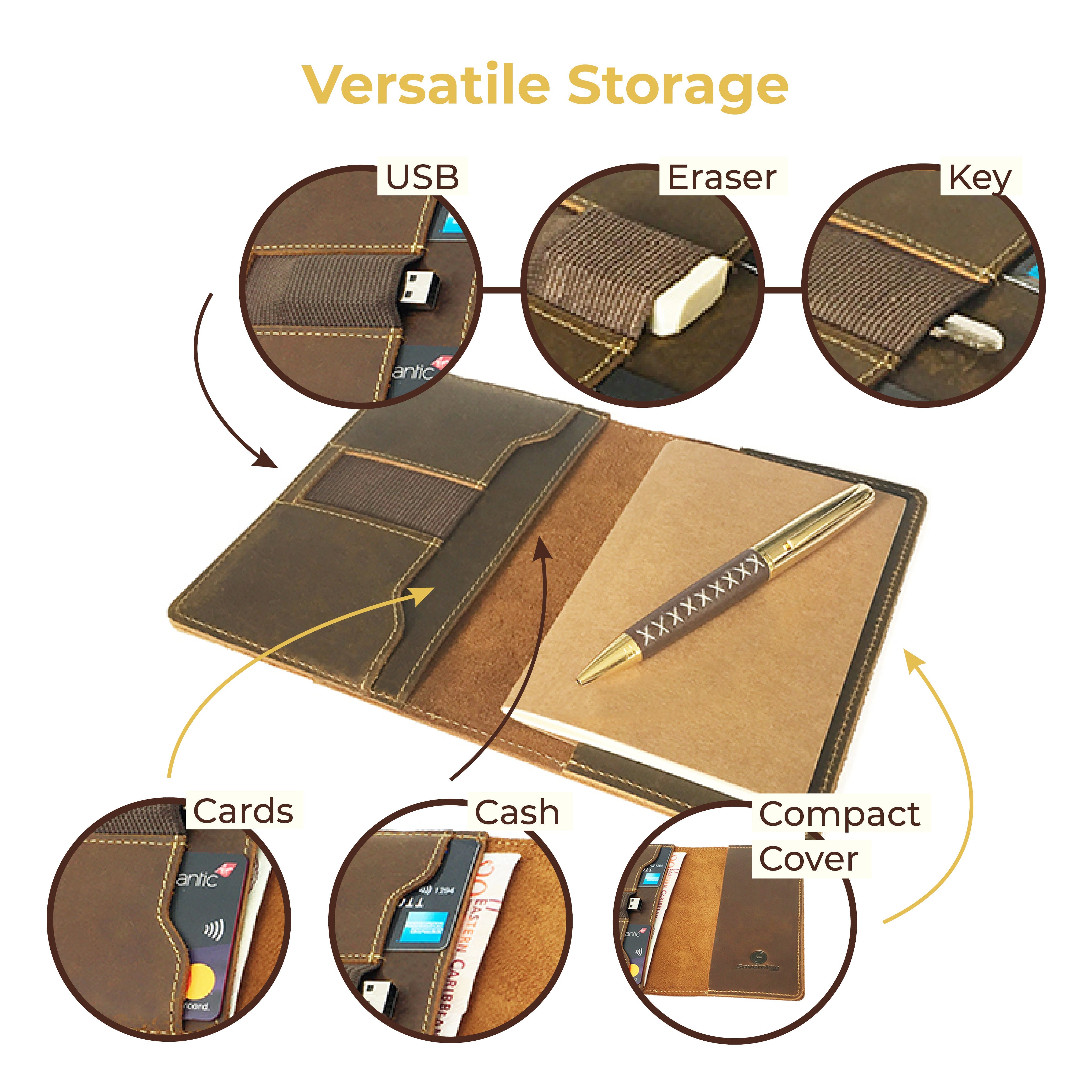 • MULTI-FUNCTIONAL UNIQUE DESIGN - this field notes wallet has multiple storage options: total of 4 inner leather pockets (easy safe storage for cards, cash etc.) 1 inner elasticated pocket (flexible storage for eraser, key, usb stick etc) and 1 outer elasticated pen loop (flexible storage for a pen, a pencil - or both!). Perfect for minimalists who require multiple functions from single items. Great way to organize and slot away different pieces of paper, receipts or business cards