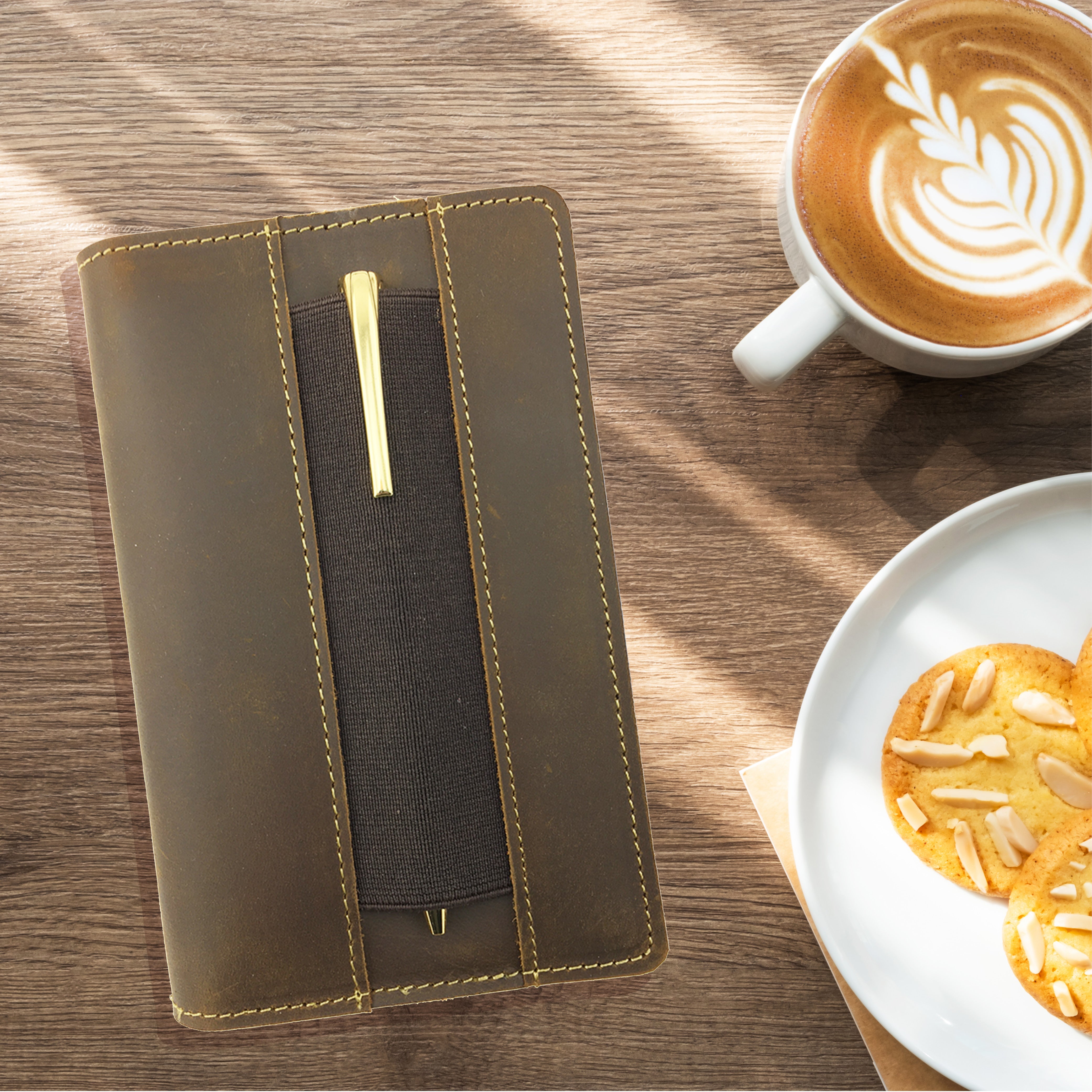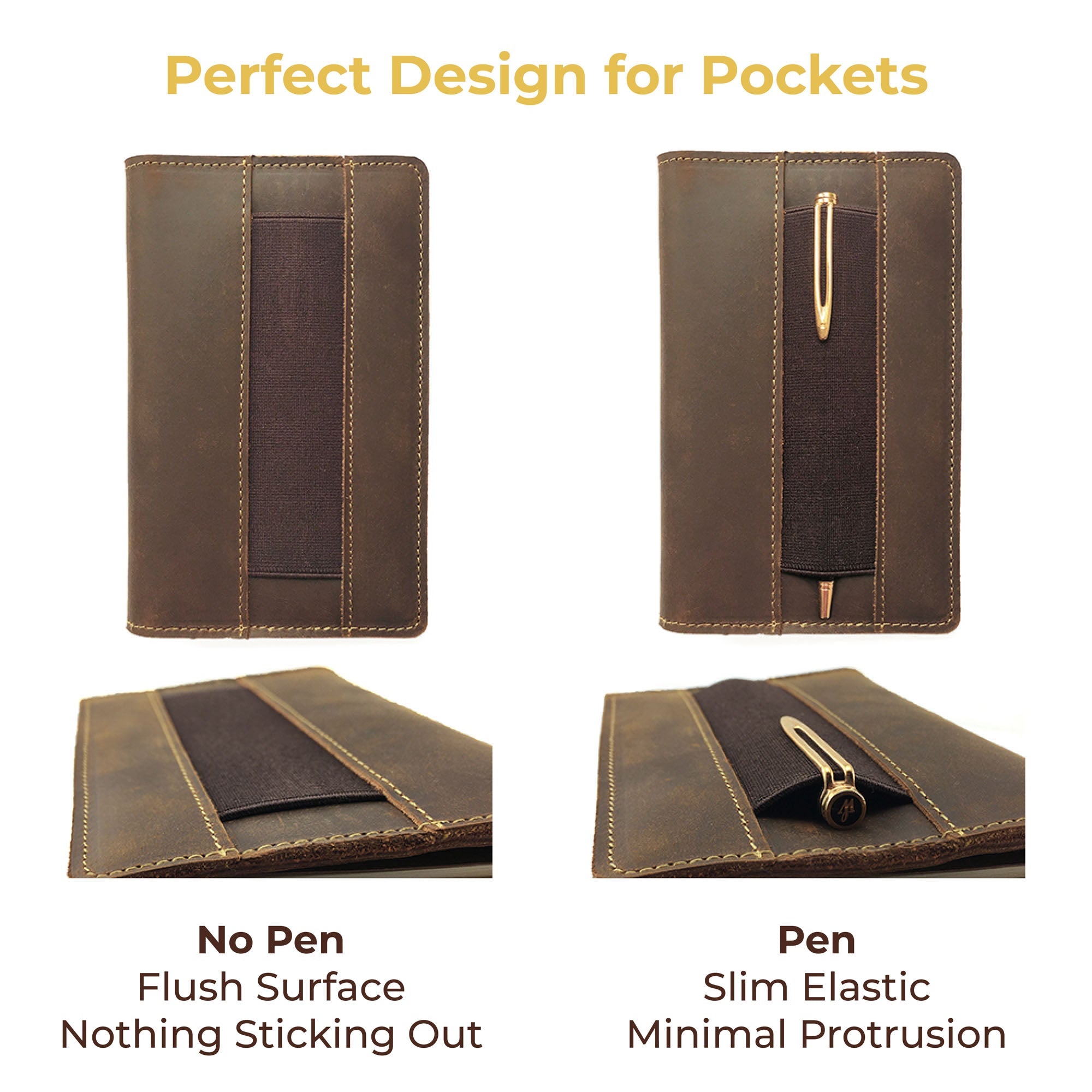 • POCKET SIZED perfect portable accessory for travellers or everyday carry to jot down notes, memories quotes and more. Can fit in jeans back pocket. The elasticated pen slot folds perfectly flat when not used so this cover can slip easily into your pocket or bag