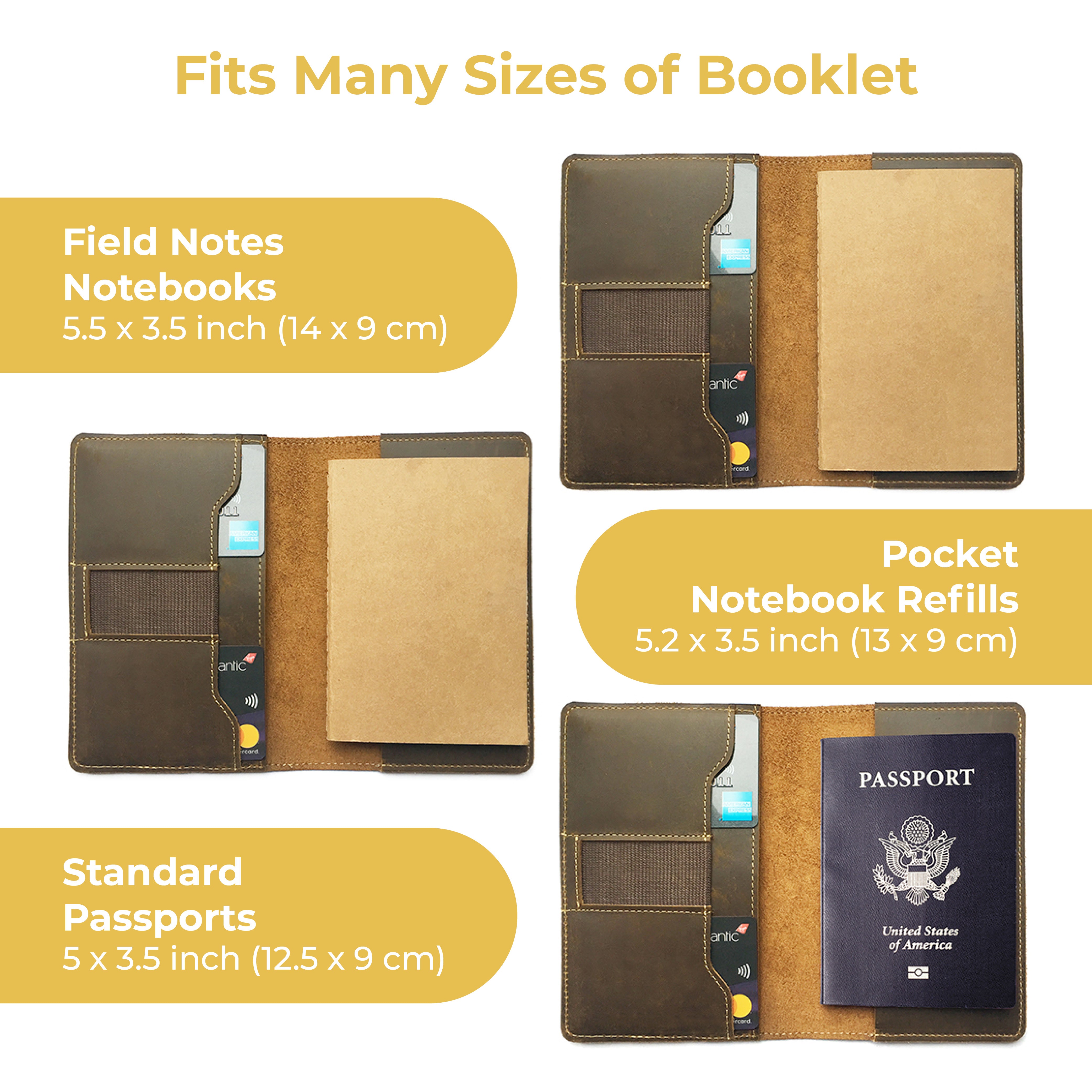 • MULTI COMPATIBILITY - compatible with: field note book 3.5inch x 5.5inch, pocket sized notebook 3.5inch x 5.2inch, standard passport 3.5inch x 5.0inch. This cover can fit Field Note's Memo Notebooks and Moleskine Cahier pocket sized notebooks. Your purchase helps families in Africa as we donate part of our profits to Afrinspire charity