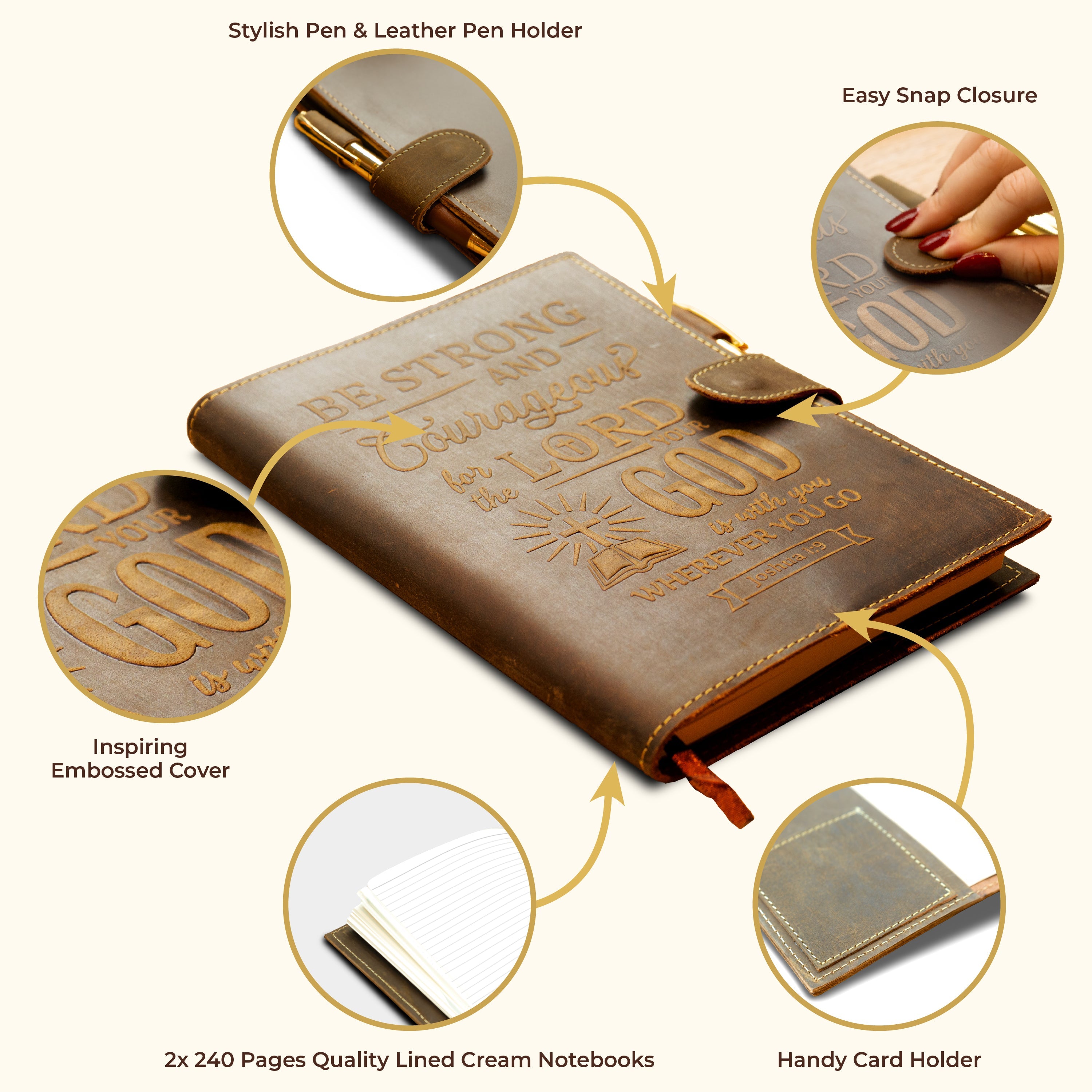 - INSPIRATIONAL DESIGN: Featuring the empowering quote Josh. 1:9 quote 'Be Strong & Courageous' and an intricately embossed design, this refillable leather journal inspires strength, faith, and daily reflection - ideal for personal devotionals, writing, or quiet moments