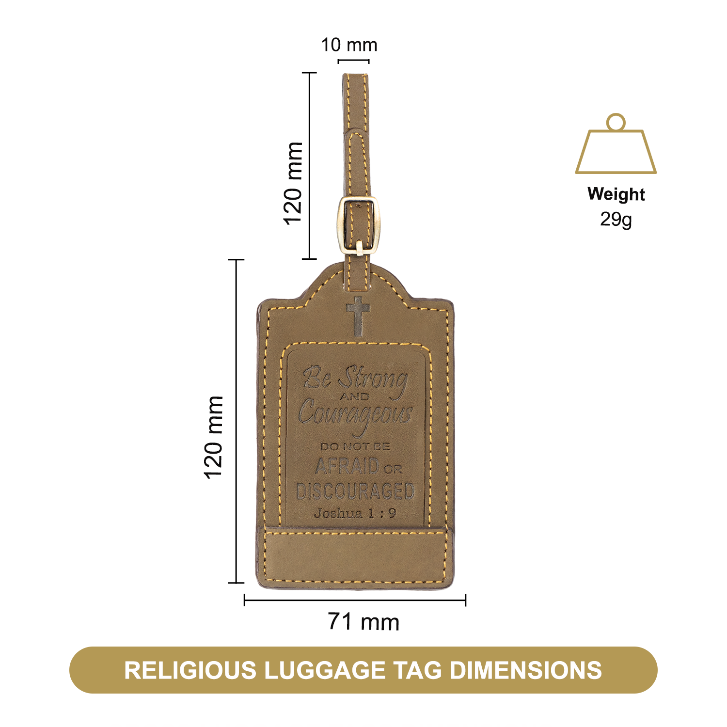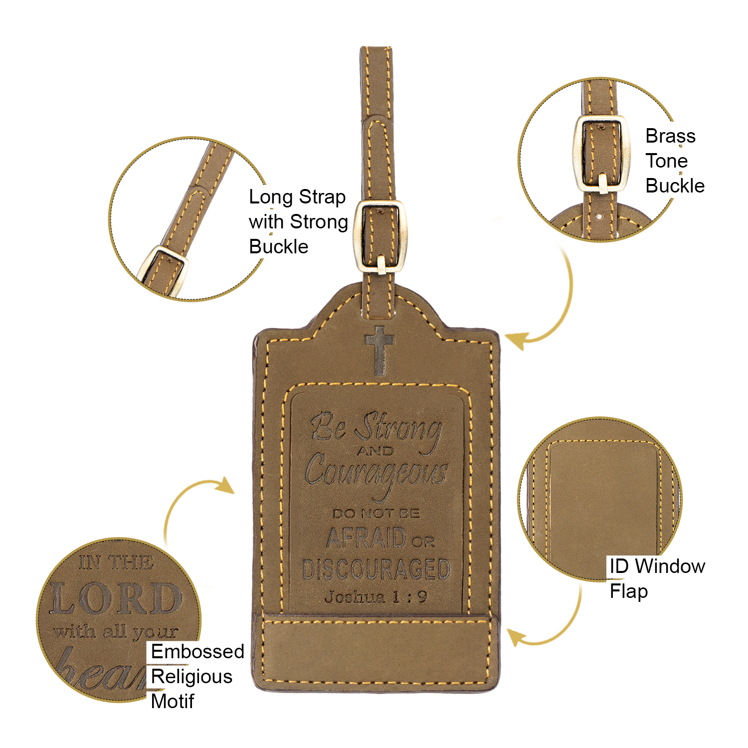 - INSPIRATIONAL DESIGN - EMBOSSED RELIGIOUS VERSE - Celebrate faith and craftsmanship with this Sovereign-Gear luggage tag, featuring the empowering verse 'Be Strong & Courageous' from the Book of Joshua, beautifully embossed on premium brown leather. A meaningful blend of timeless style and spiritual strength - perfect for daily inspiration or thoughtful gifting.