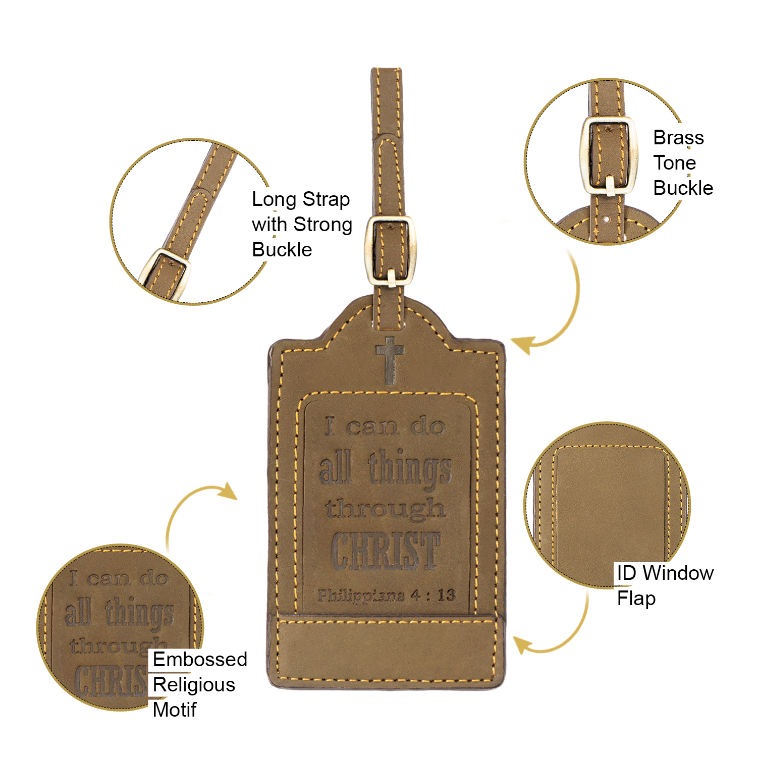 - INSPIRATIONAL DESIGN - EMBOSSED RELIGIOUS VERSE - Celebrate faith and craftsmanship with this Sovereign-Gear luggage tag, featuring the uplifting verse 'I Can Do All Things Through Christ' from the Book of Philippians, beautifully embossed on premium brown leather. A meaningful gift for spiritual milestones or personal inspiration, blending timeless style with soulful detail.