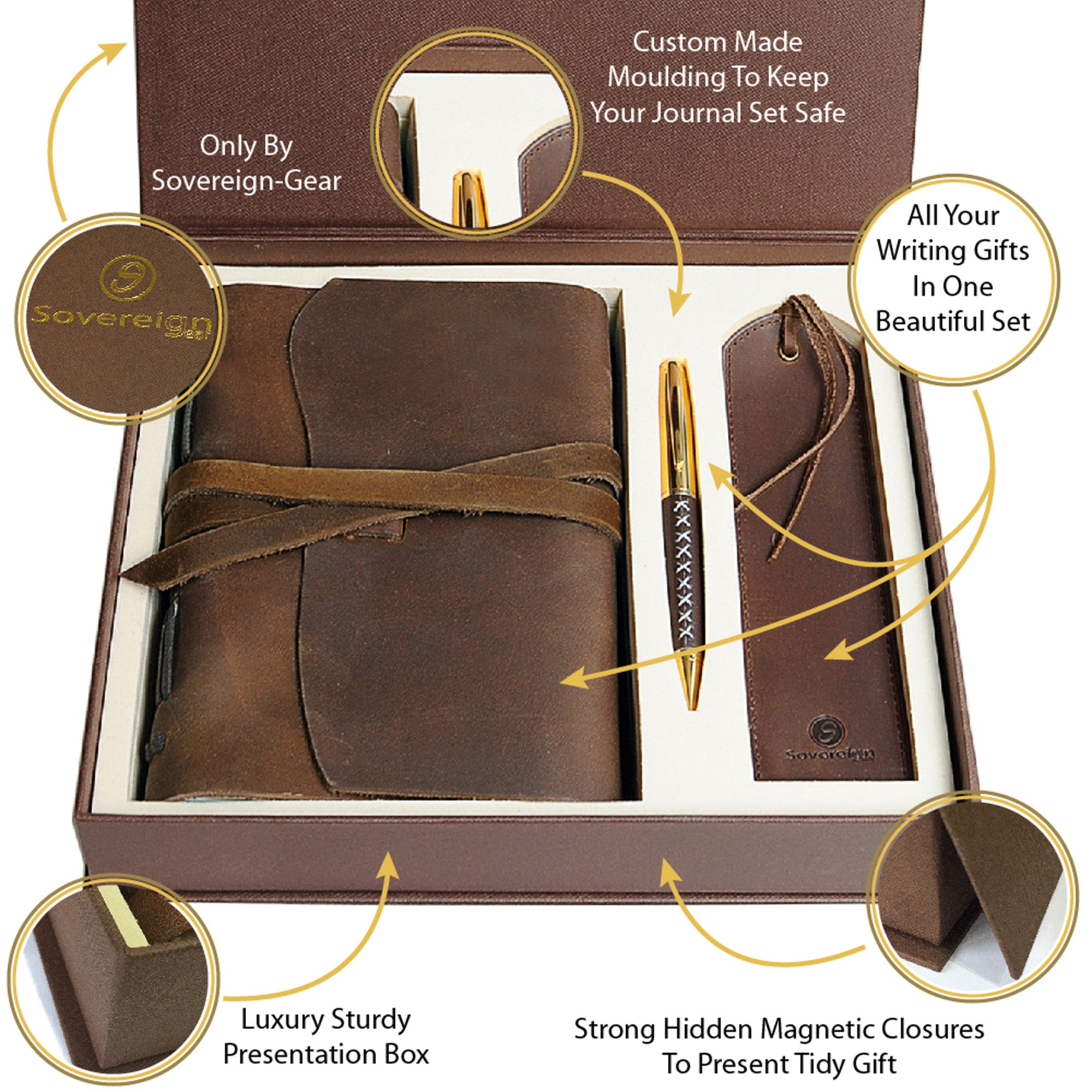 - UNIQUE GIFT SET - with handmade leather journal, leather bookmark, hidden pen holder and stylish pen, all in this finely crafted presentation box making it the perfect present