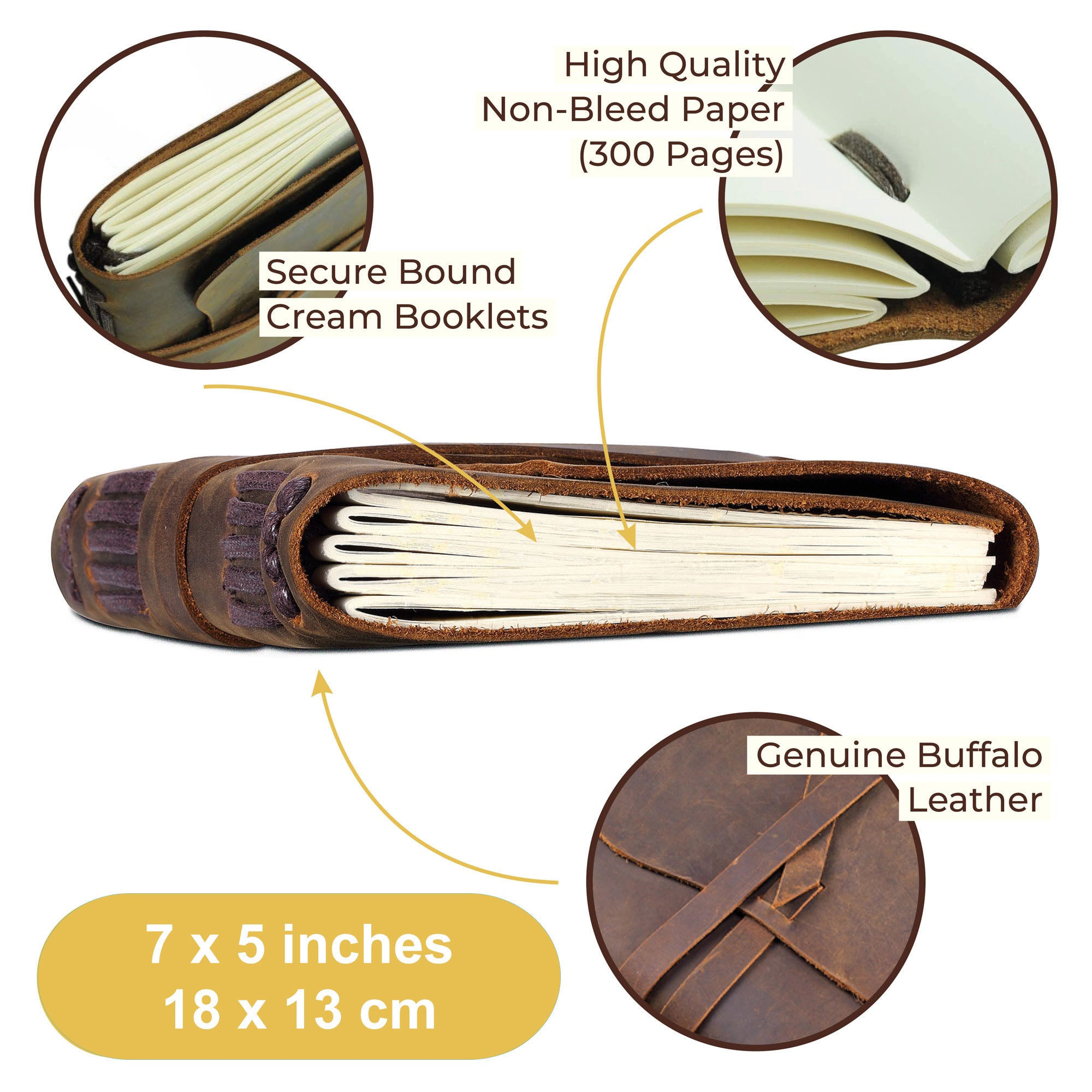 The smooth cream plain paper compliments the rustic brown leather and stays firmly in place with hand stitched binding - no glue is used. Note the paper is not refillable. Sized 7" x 5", this notebook is the perfect fit for all bags or backpacks to take with you on any trip. The complete journal and accessories comes in a beautiful brown luxury presentation box making it the perfect gift for any occasion like Birthdays, Graduations, Anniversaries, Christmas or anyone starting a new journey.